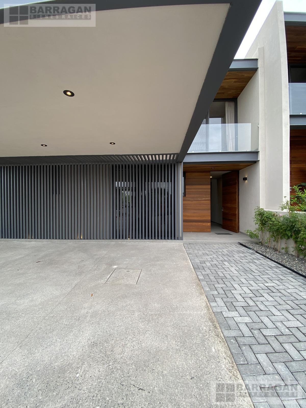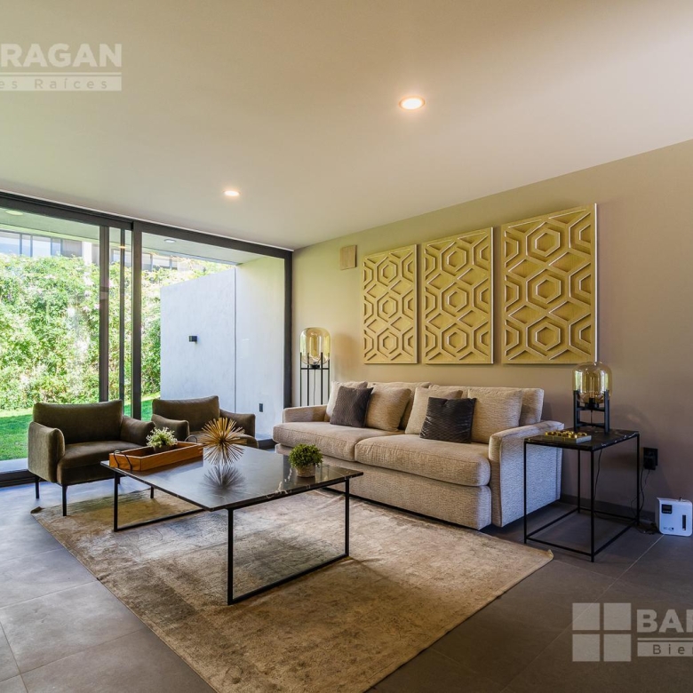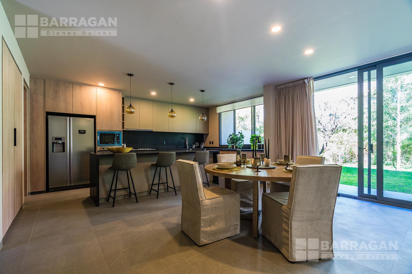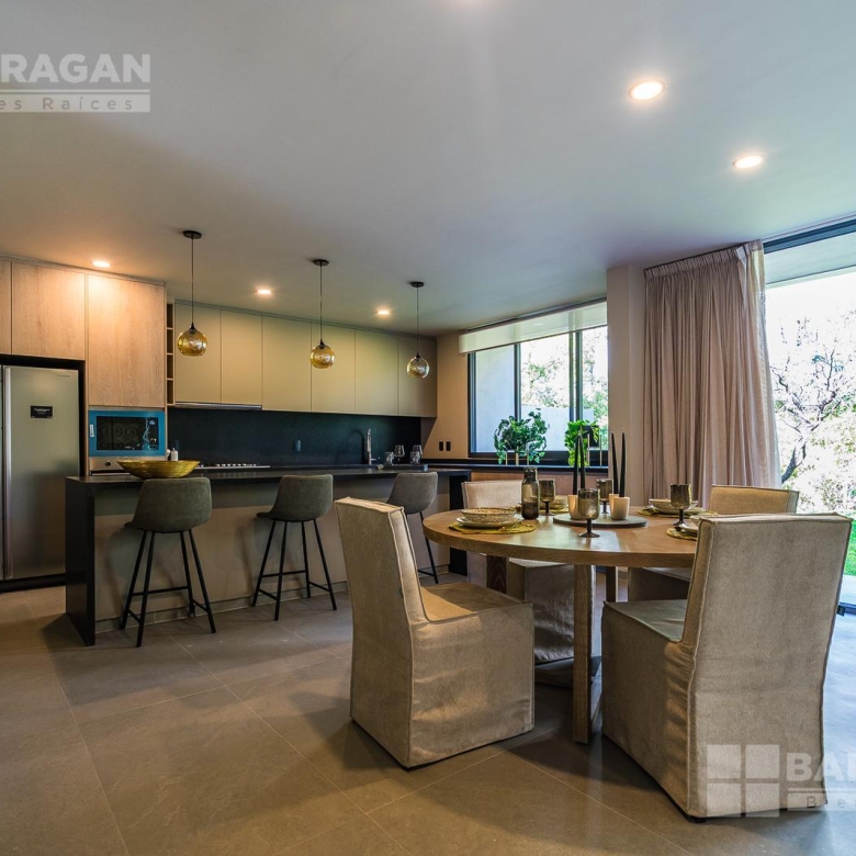 Cuenta con garage techado para tres vehículos, al entrar encontraremos sala y comedor, medio baño de visitas, cocina equipada, bar y terraza con jardín exterior. Cuarto de servicio y área de lavado.