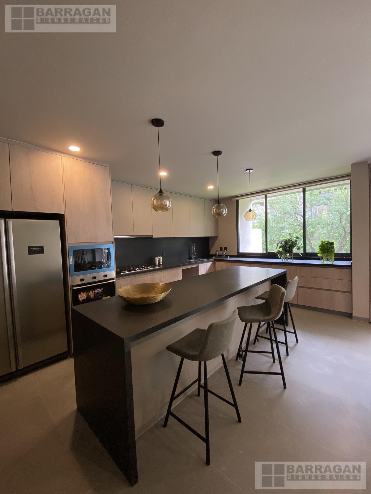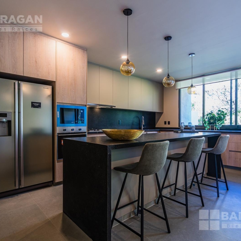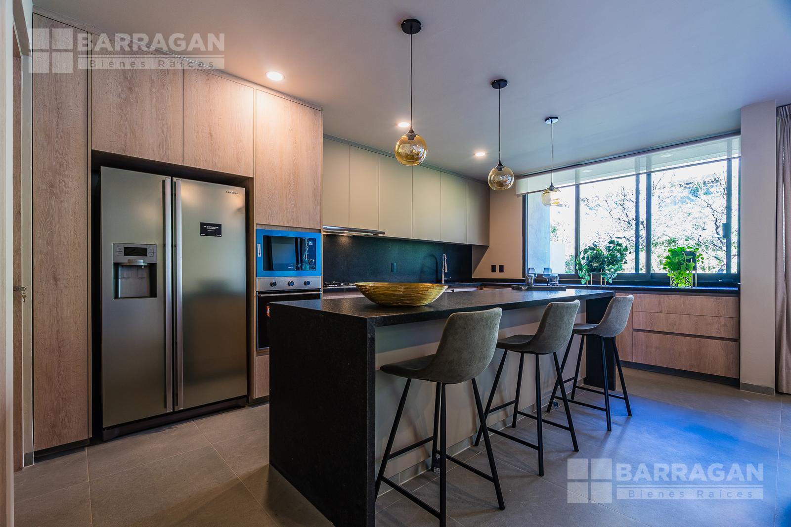 Cuenta con garage techado para tres vehículos, al entrar encontraremos sala y comedor, medio baño de visitas, cocina equipada, bar y terraza con jardín exterior. Cuarto de servicio y área de lavado.