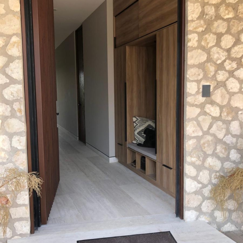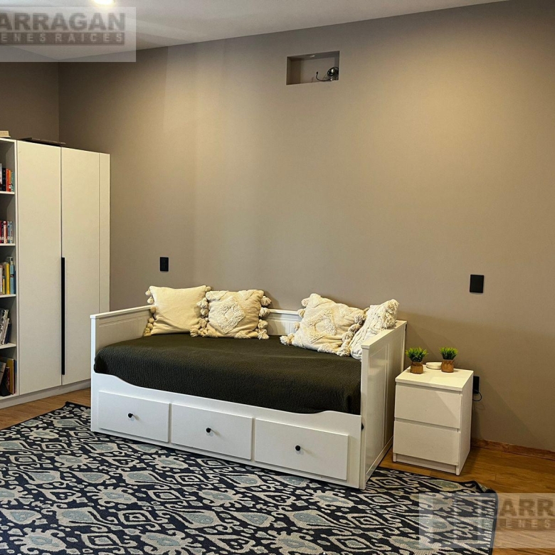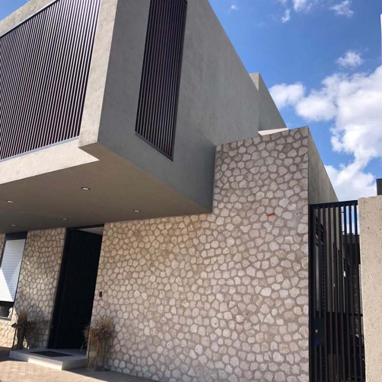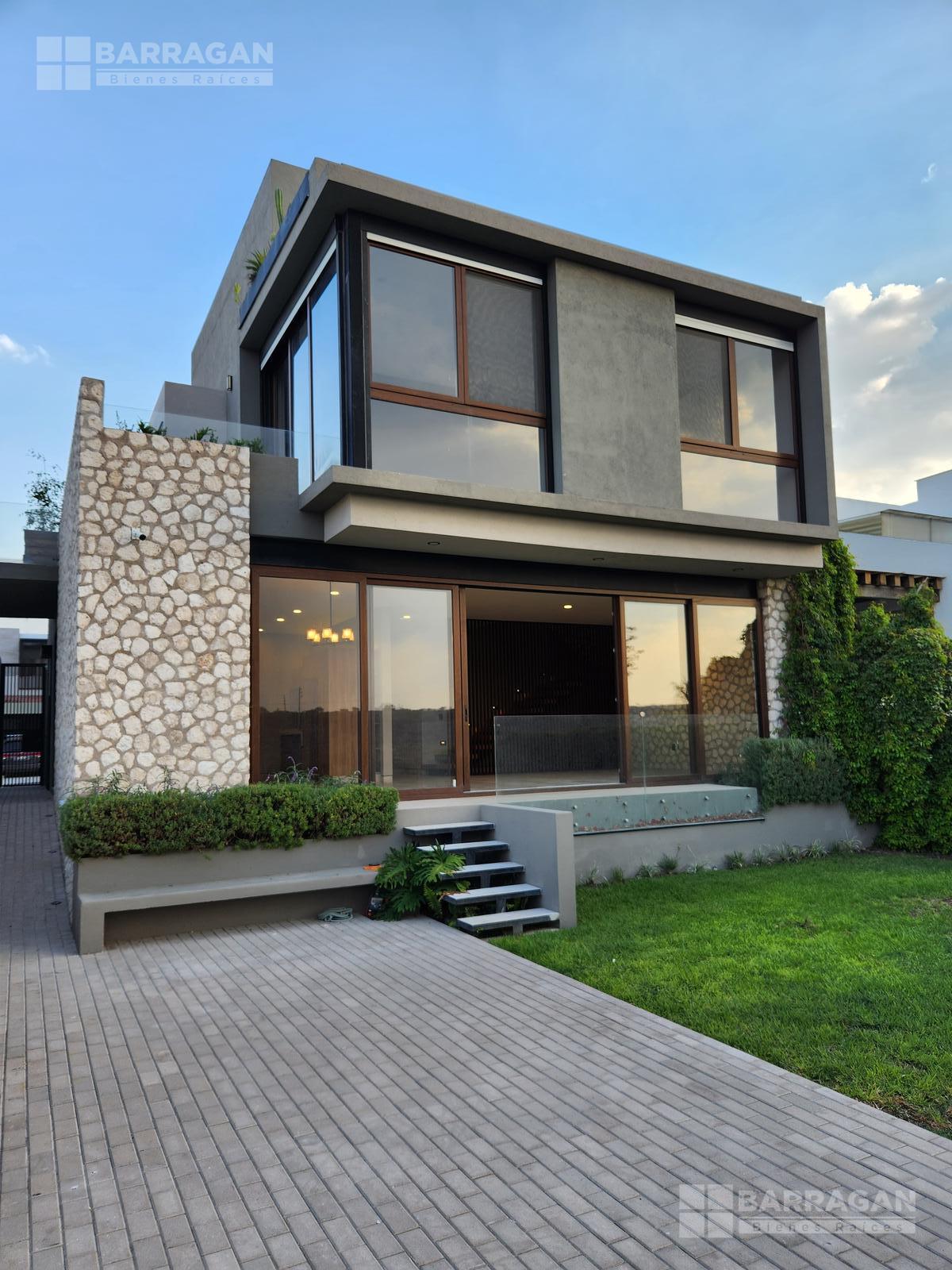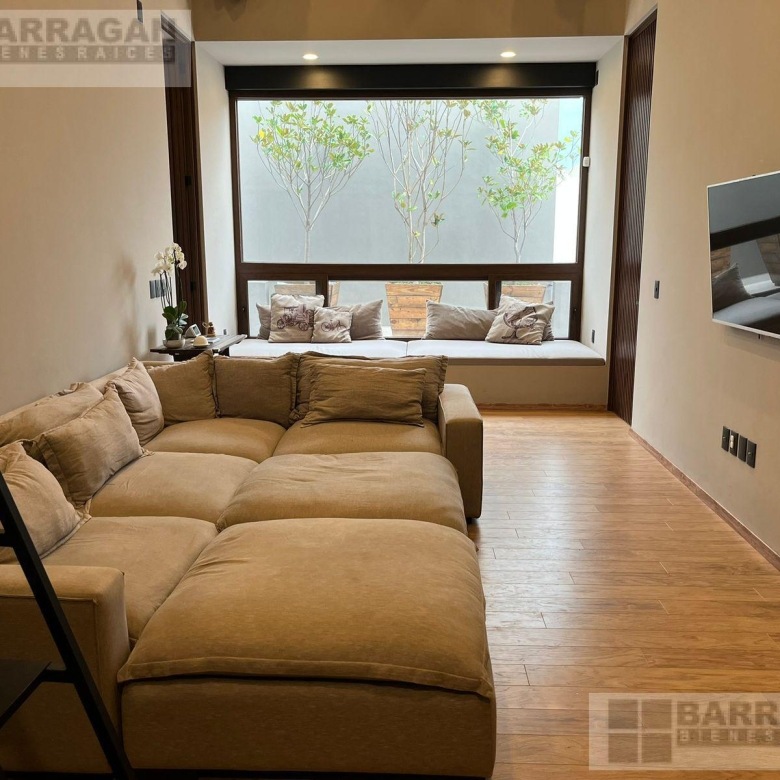 Casa moderna contemporánea, cochera frontal con capacidad para dos autos sin techar, recibidor con closet de visitas, medio baño de visitas, acceso a sala, comedor y cocina equipada abierta con acceso a la terraza y amplio jardín, una recámara con baño completo, la cual puede usarse como estudio o cuarto de visitas, cuarto de servicio y área de lavado.