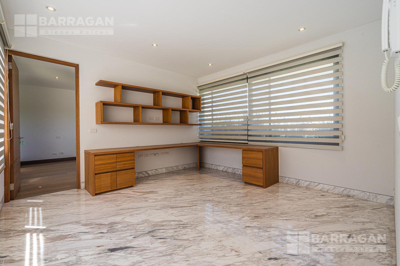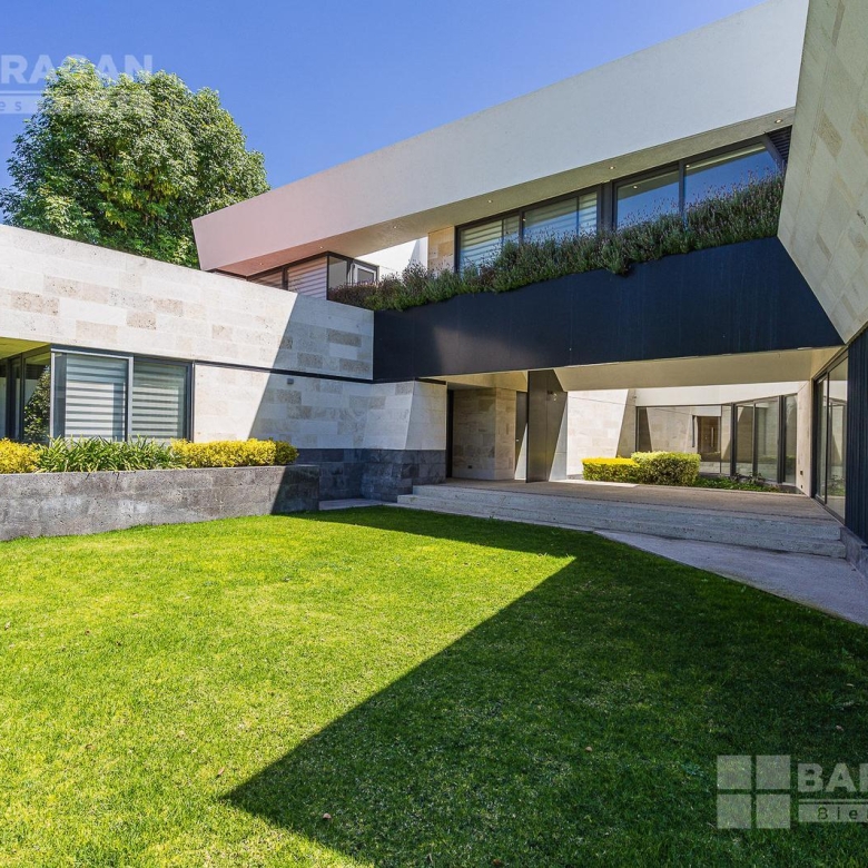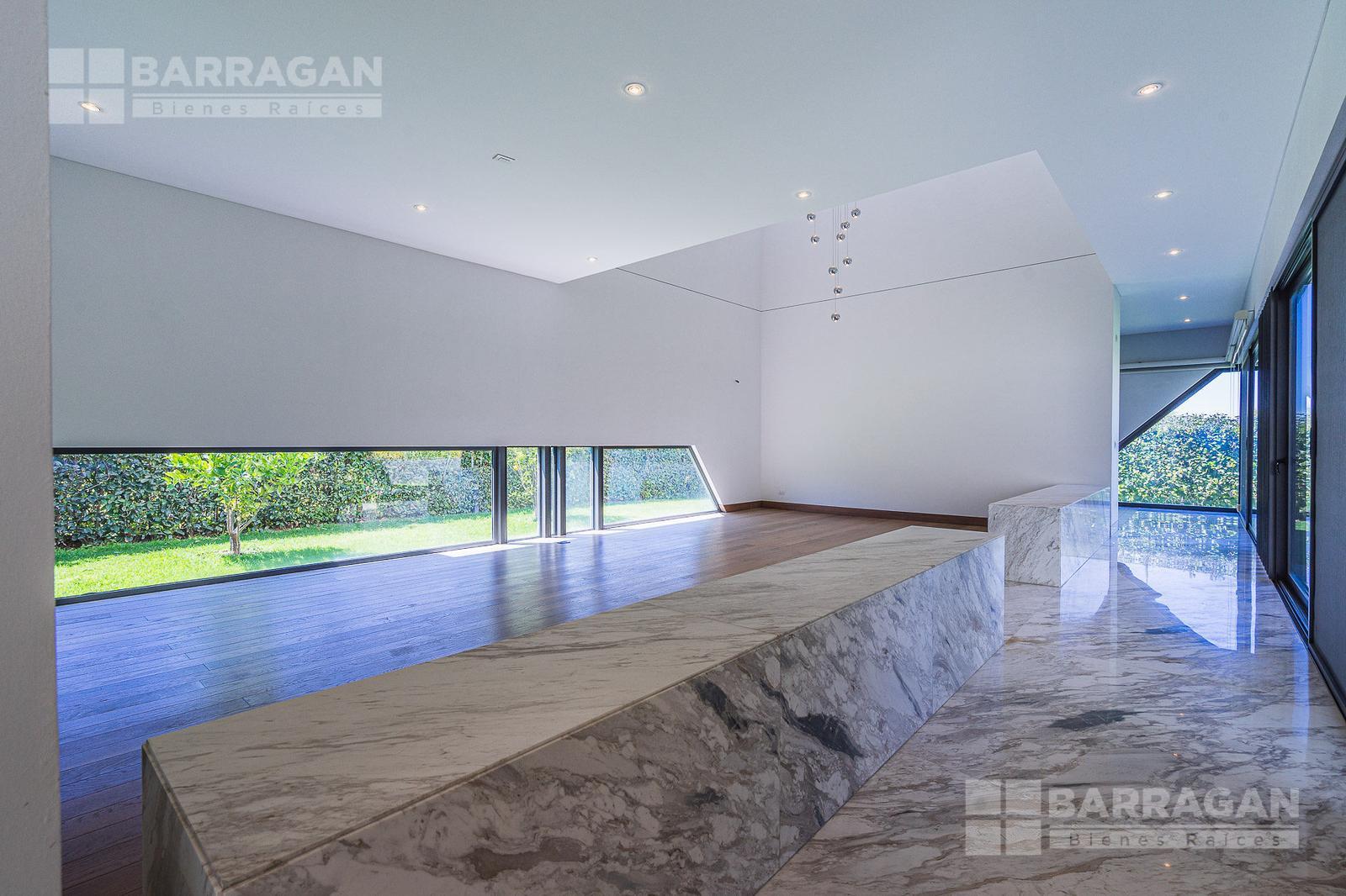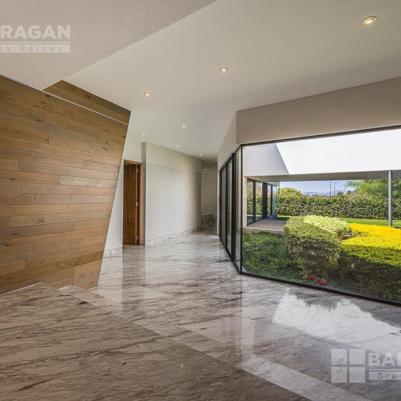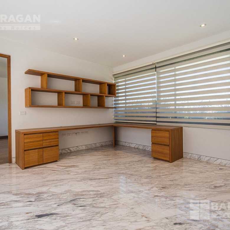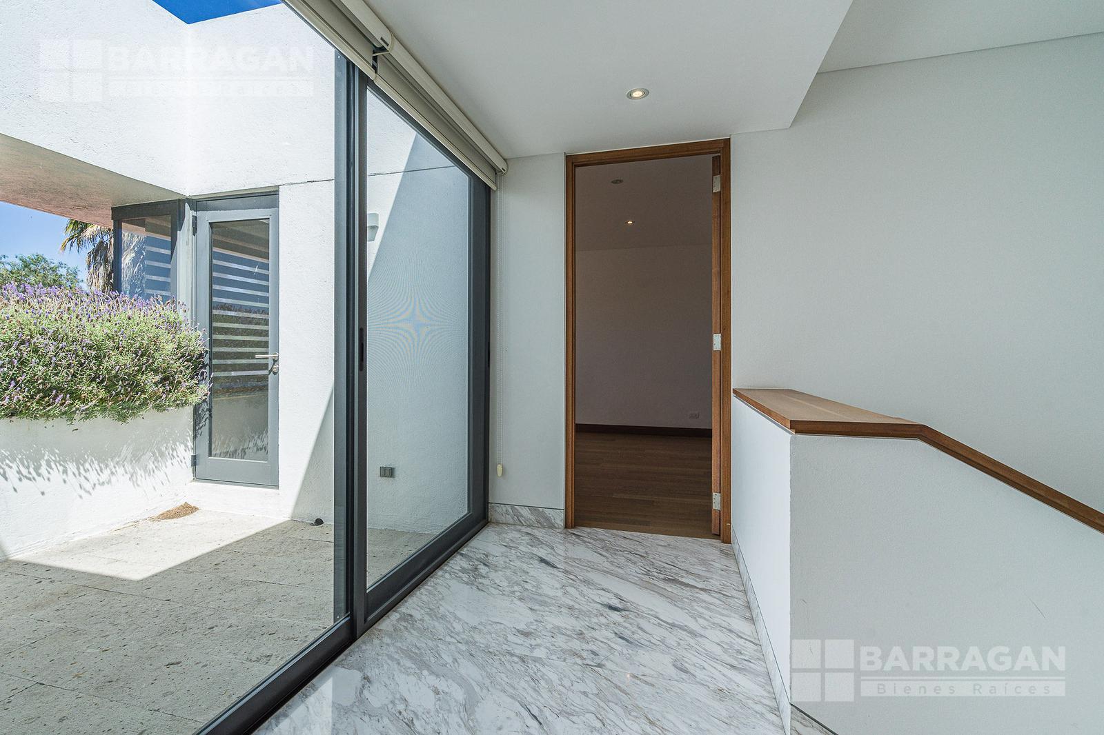 Casa moderna con acceso a amplio recibidor con vista al jardín, del lado derecho encontrarás un estudio y baño completo, la recámara principal se encuentra también en planta baja, cuenta con un vestidor y baño completo, en el mismo pasillo hay un closet grande, del lado izquierdo están sala, comedor y cocina con espacios extras para almacenar, amplia alacena, área de servicio y acceso a la cochera para 6 autos techados, en este espacio hay una amplia bodega y acceso a segundo piso para 2 cuartos de servicio independientes.