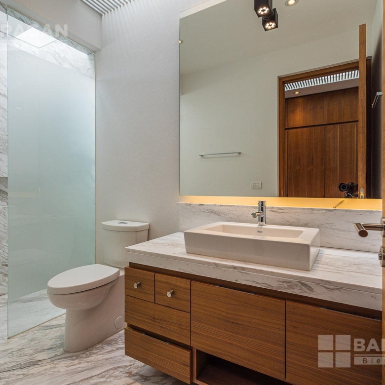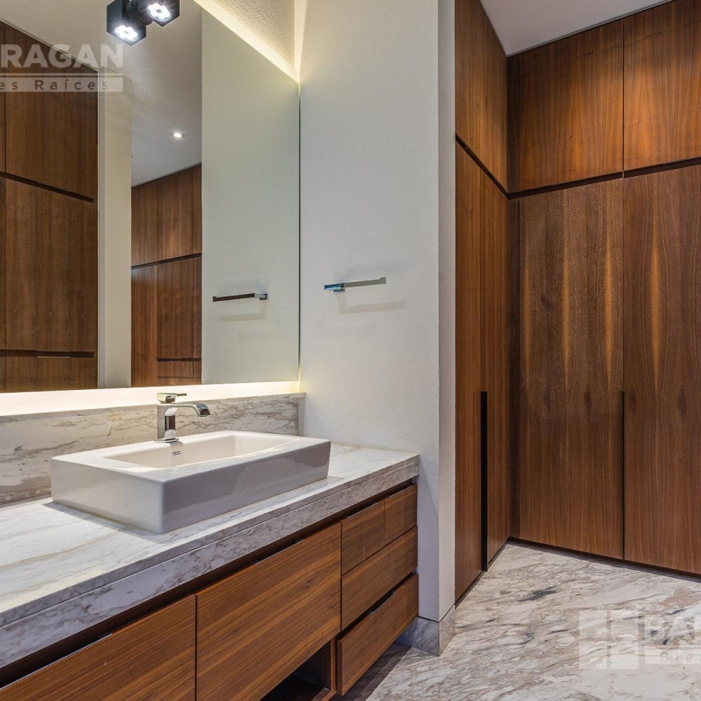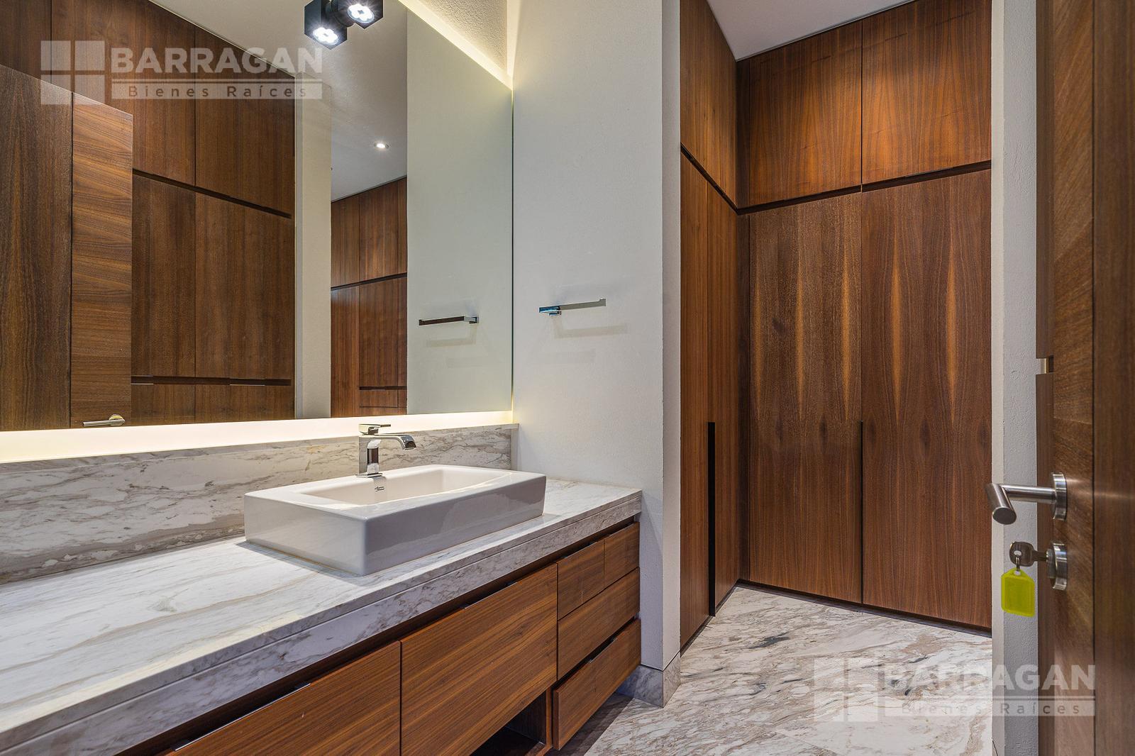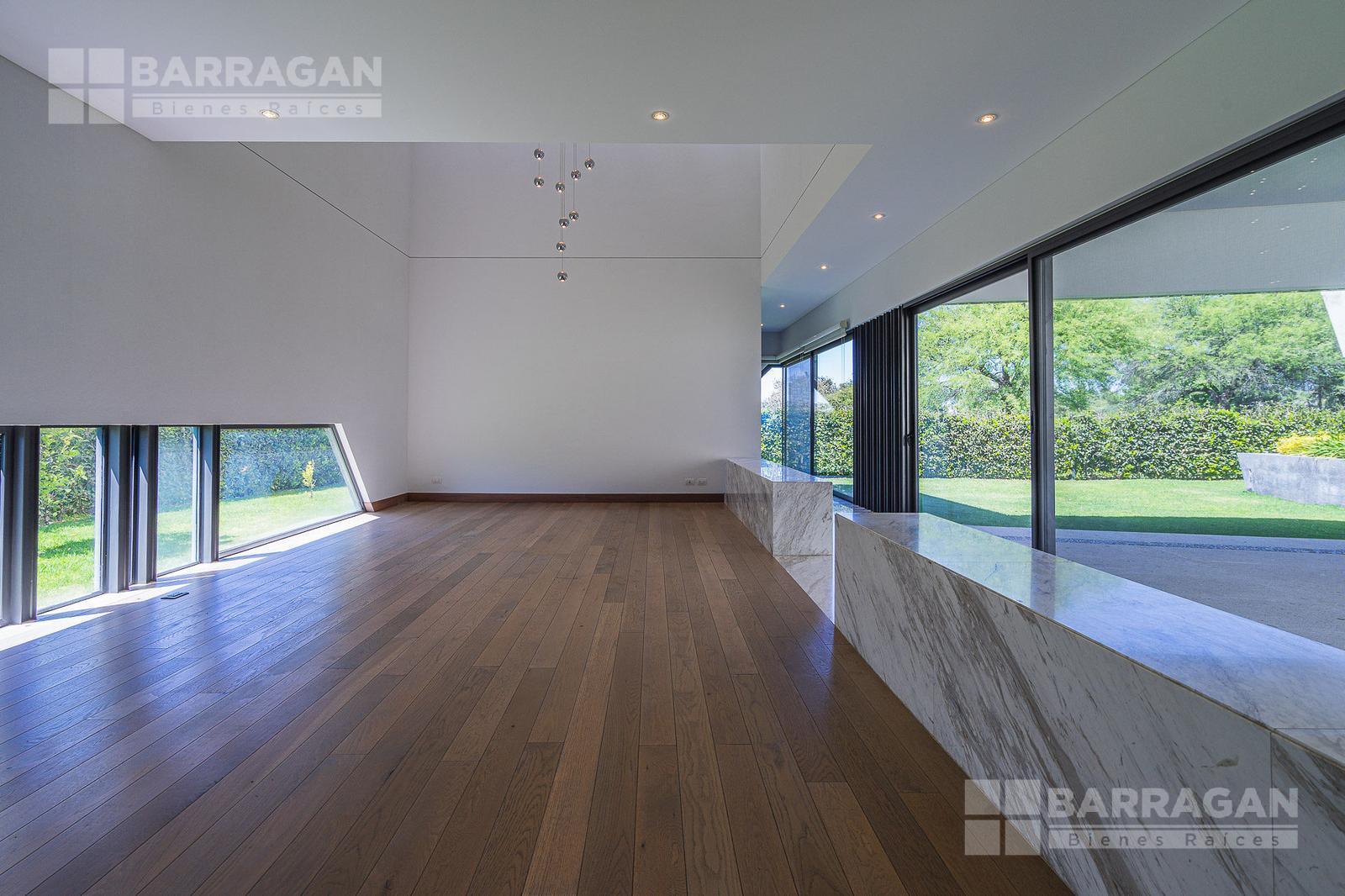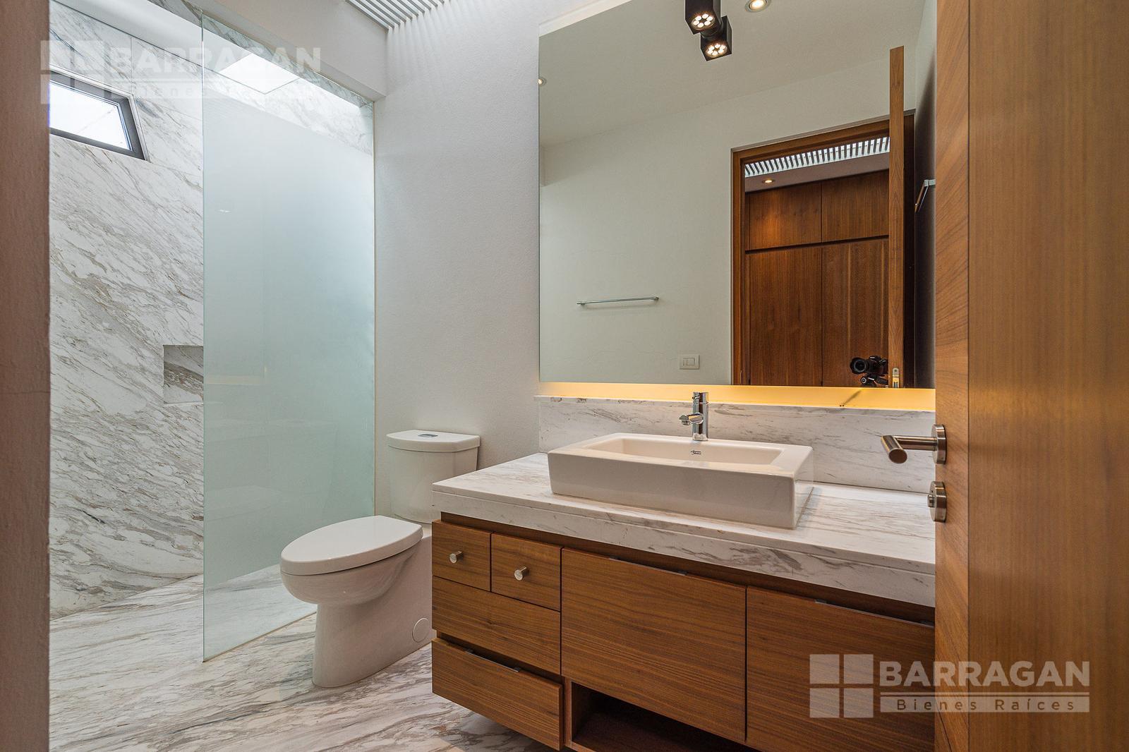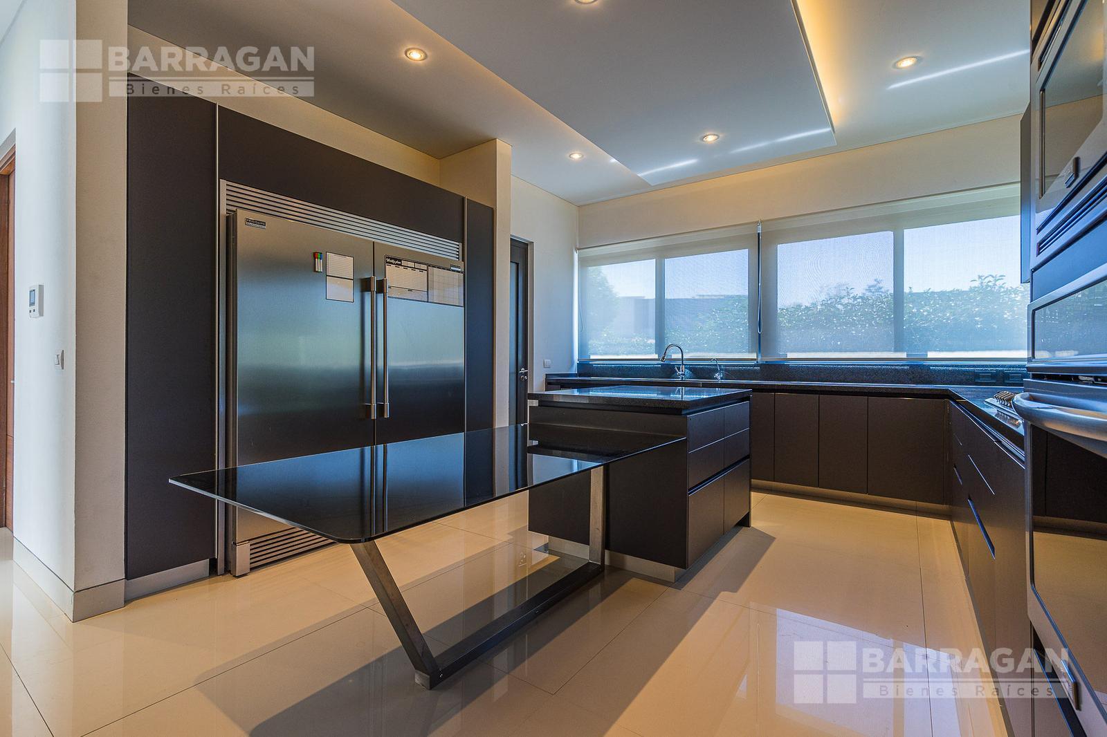 Casa moderna con acceso a amplio recibidor con vista al jardín, del lado derecho encontrarás un estudio y baño completo, la recámara principal se encuentra también en planta baja, cuenta con un vestidor y baño completo, en el mismo pasillo hay un closet grande, del lado izquierdo están sala, comedor y cocina con espacios extras para almacenar, amplia alacena, área de servicio y acceso a la cochera para 6 autos techados, en este espacio hay una amplia bodega y acceso a segundo piso para 2 cuartos de servicio independientes.