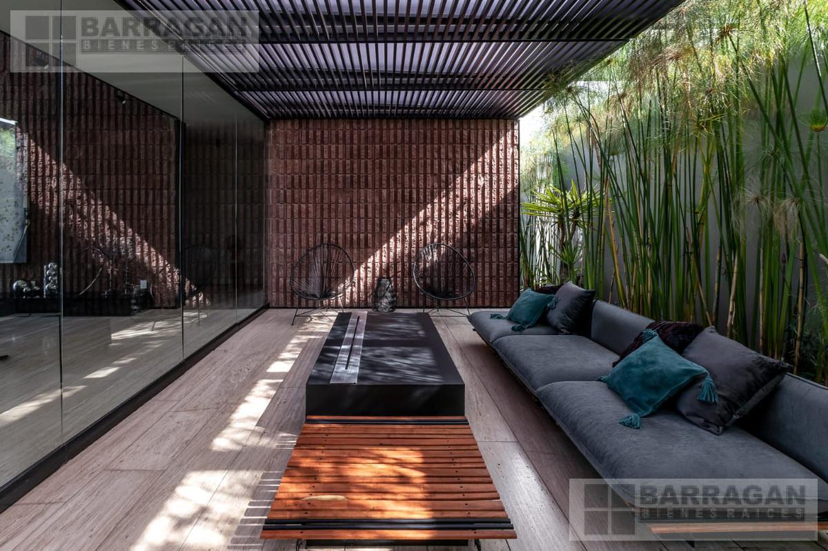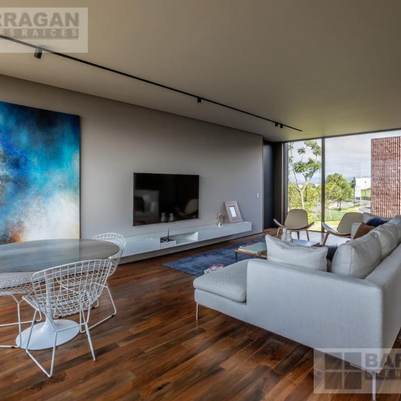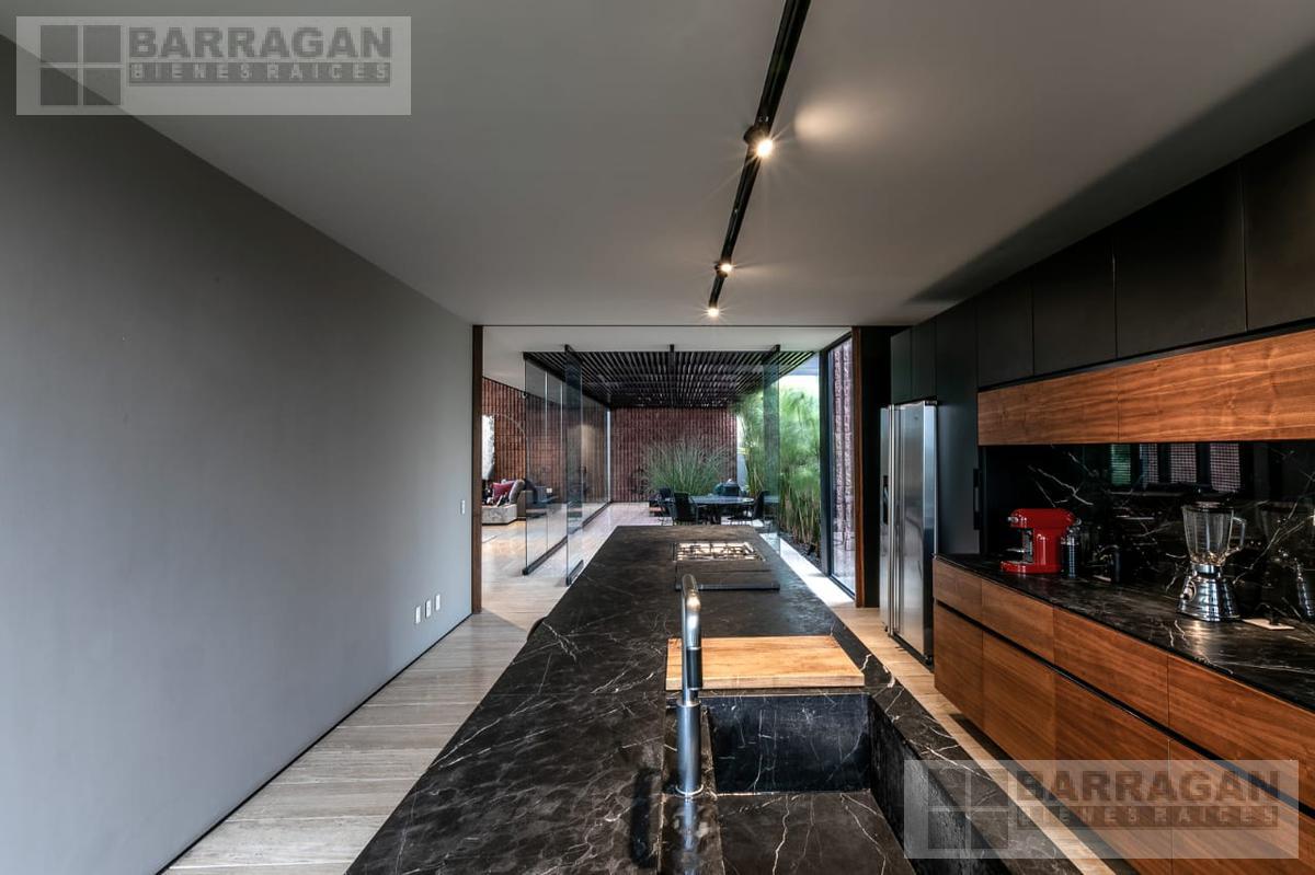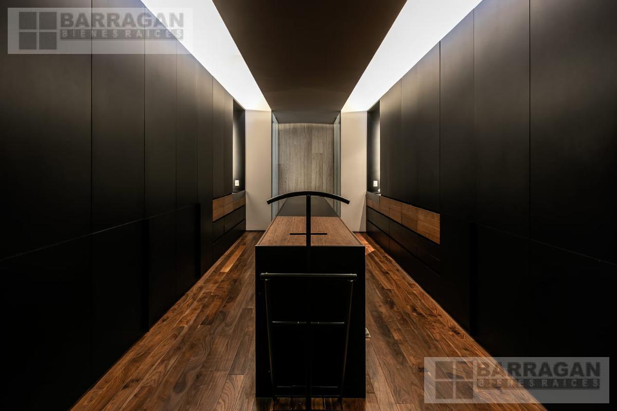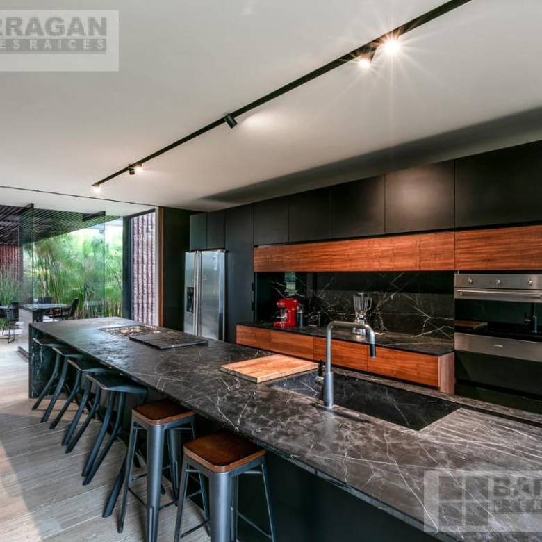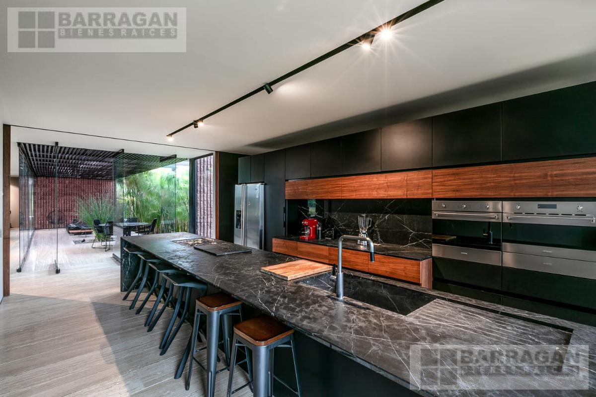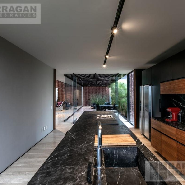 Entramos a un recibidor iluminado naturalmente que nos lleva a la sala, comedor y terraza dividida por ventanales de vidrio que generan sentimiento de amplitud. La cocina con equipos italianos marca SMEG; horno, lavavajillas, microondas, cajón caliente, refijerador y parrilla, cubierta de mármol natural Negro Monterrey y gabinetes en fórmaica negra y chapa de nogal, herrajes y visagras de la marca SIMONWERKS, cuenta con una isla, así como espacio de antecomedor. La planta baja también cuenta con un estudio, cuarto de servicio y área de lavandería. En la segunda planta, encontramos 3 recámaras cada una con su propio vestidor y baño completo, así como una sala de televisión. Las recámaras cuentan con balcones.