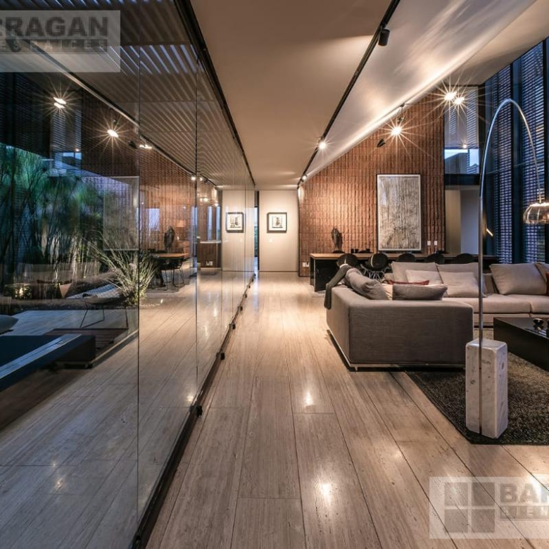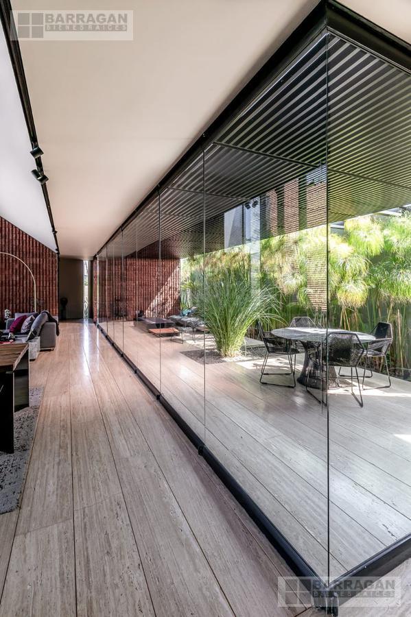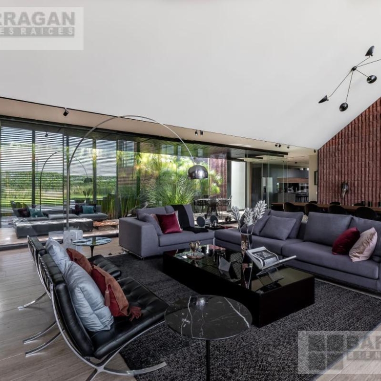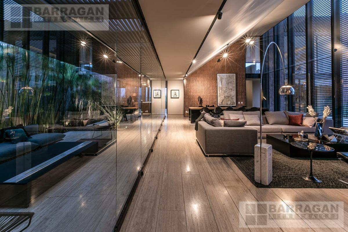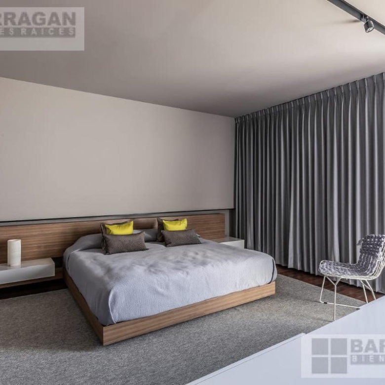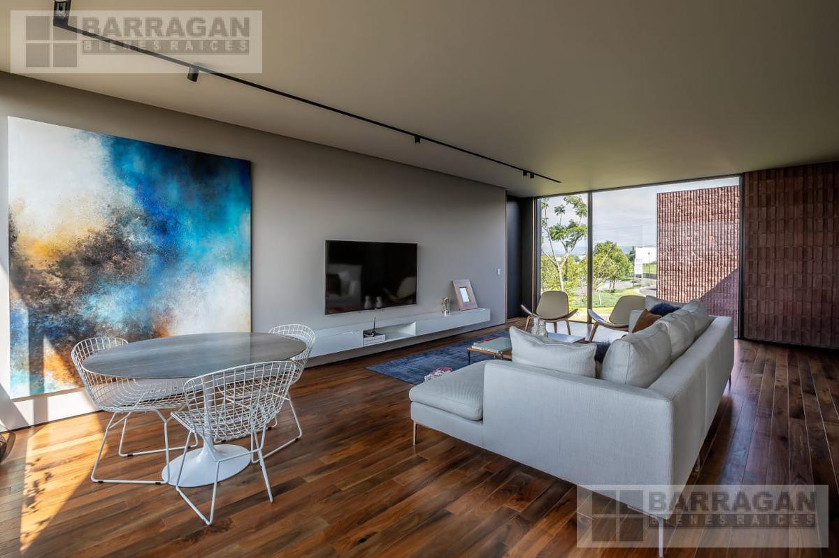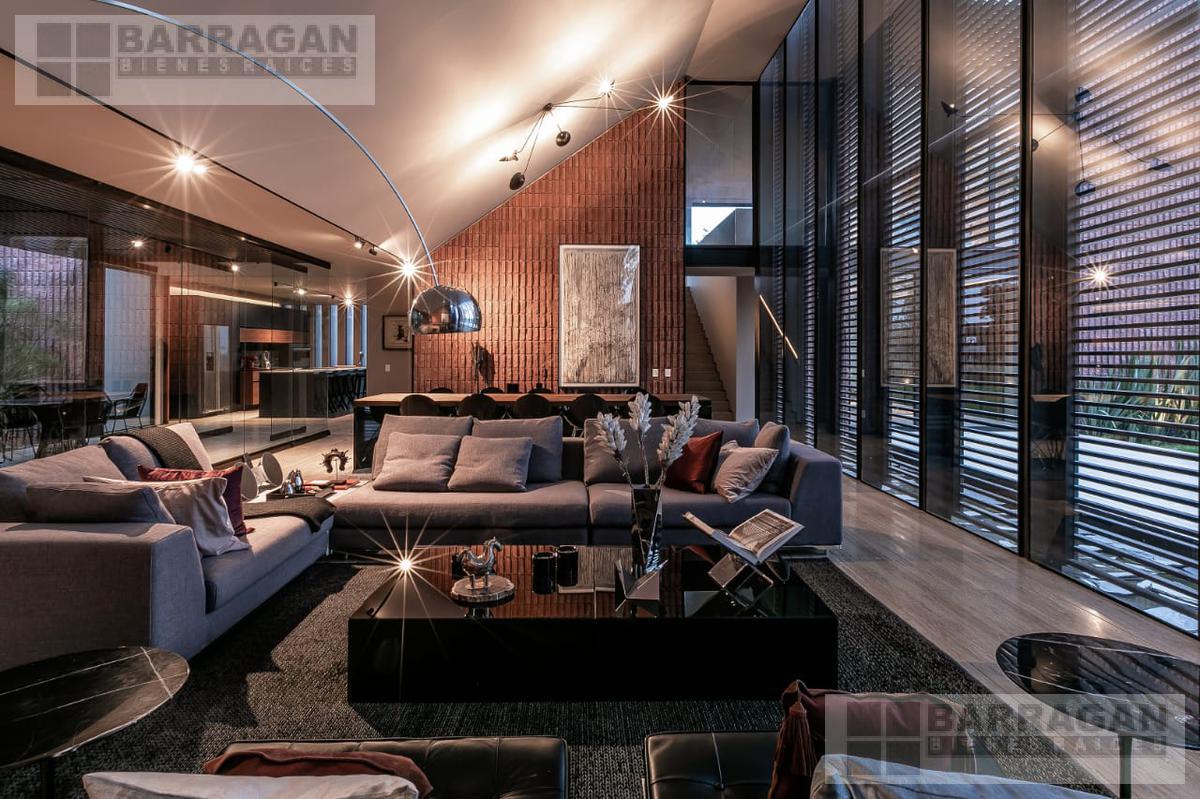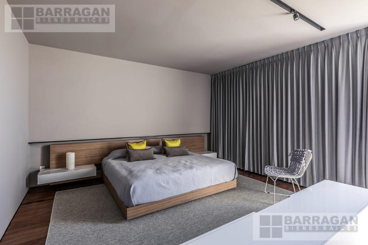 Entramos a un recibidor iluminado naturalmente que nos lleva a la sala, comedor y terraza dividida por ventanales de vidrio que generan sentimiento de amplitud. La cocina con equipos italianos marca SMEG; horno, lavavajillas, microondas, cajón caliente, refijerador y parrilla, cubierta de mármol natural Negro Monterrey y gabinetes en fórmaica negra y chapa de nogal, herrajes y visagras de la marca SIMONWERKS, cuenta con una isla, así como espacio de antecomedor. La planta baja también cuenta con un estudio, cuarto de servicio y área de lavandería. En la segunda planta, encontramos 3 recámaras cada una con su propio vestidor y baño completo, así como una sala de televisión. Las recámaras cuentan con balcones.