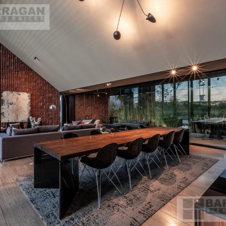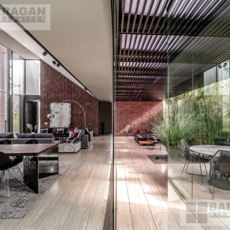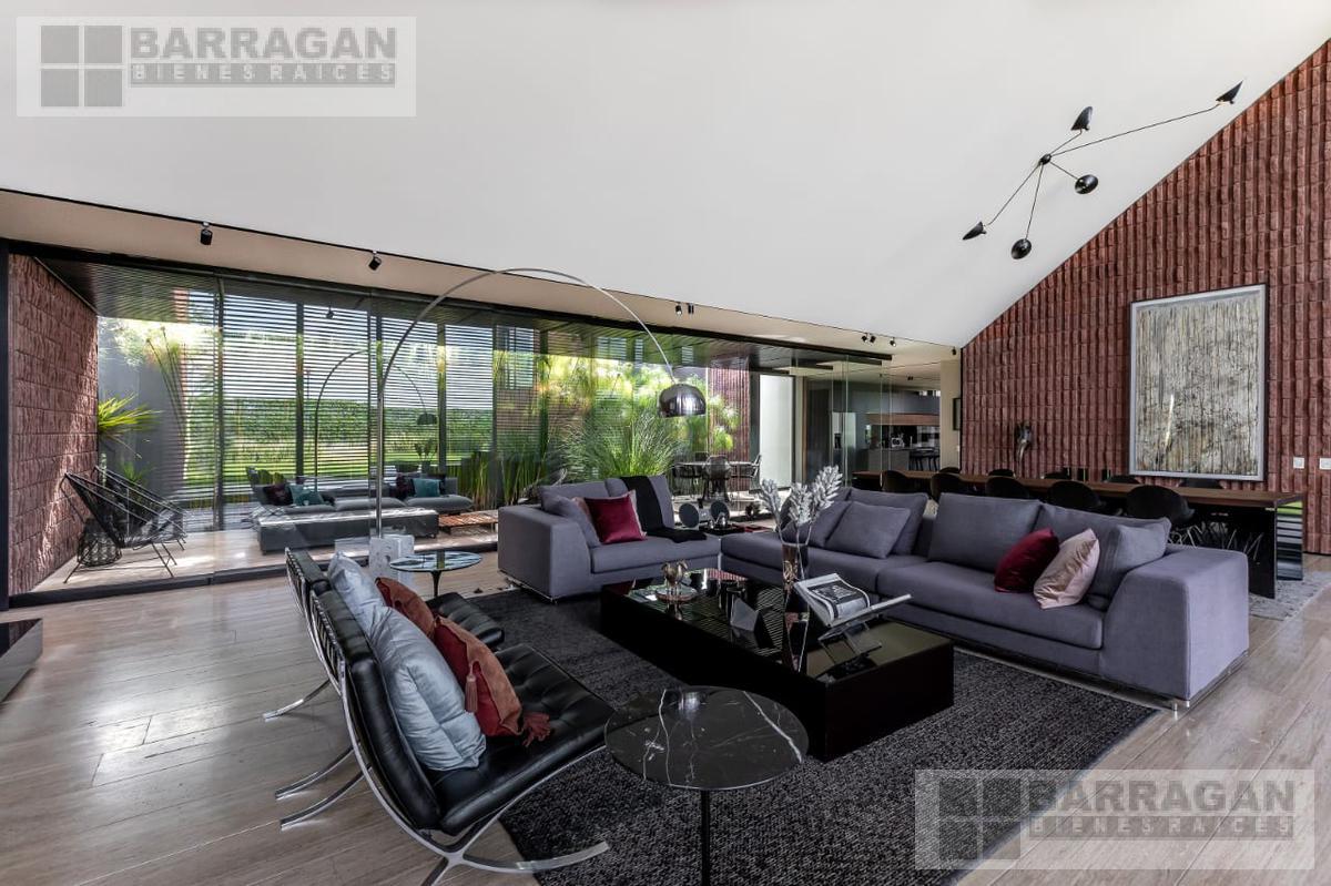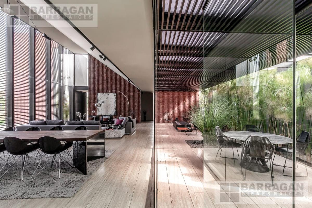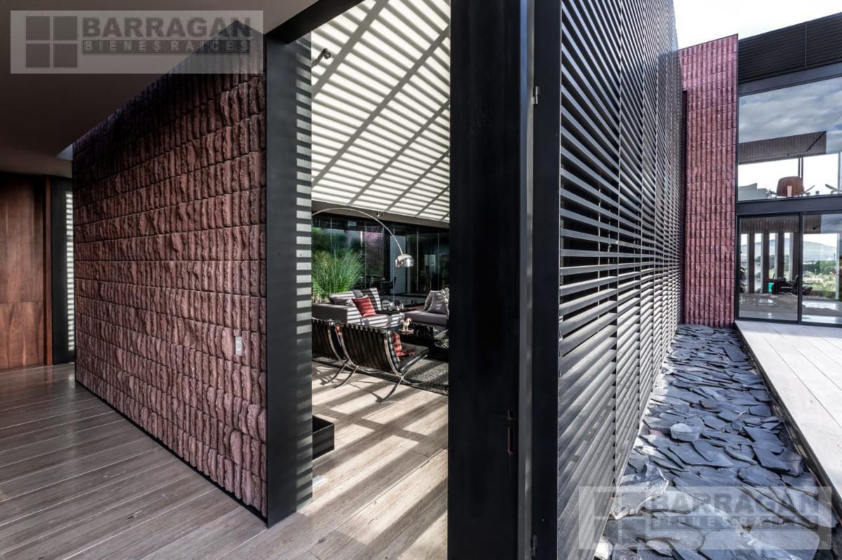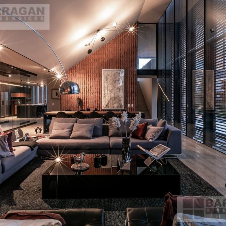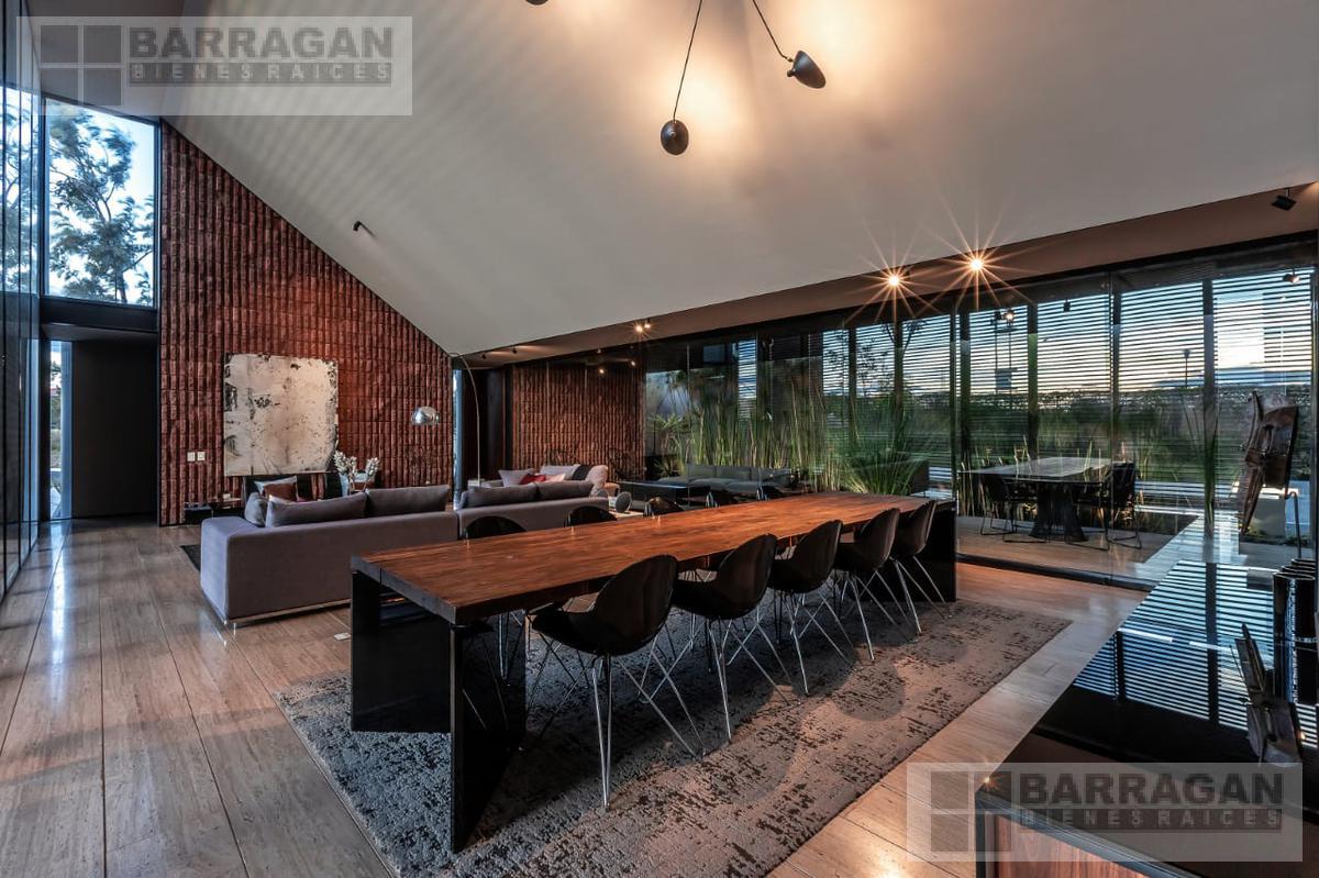 Entramos a un recibidor iluminado naturalmente que nos lleva a la sala, comedor y terraza dividida por ventanales de vidrio que generan sentimiento de amplitud. La cocina con equipos italianos marca SMEG; horno, lavavajillas, microondas, cajón caliente, refijerador y parrilla, cubierta de mármol natural Negro Monterrey y gabinetes en fórmaica negra y chapa de nogal, herrajes y visagras de la marca SIMONWERKS, cuenta con una isla, así como espacio de antecomedor. La planta baja también cuenta con un estudio, cuarto de servicio y área de lavandería. En la segunda planta, encontramos 3 recámaras cada una con su propio vestidor y baño completo, así como una sala de televisión. Las recámaras cuentan con balcones.