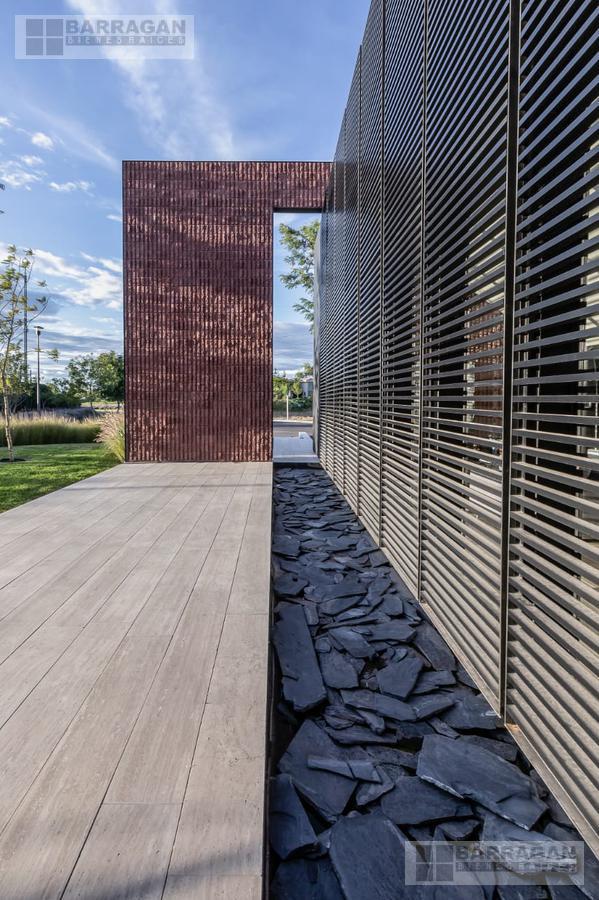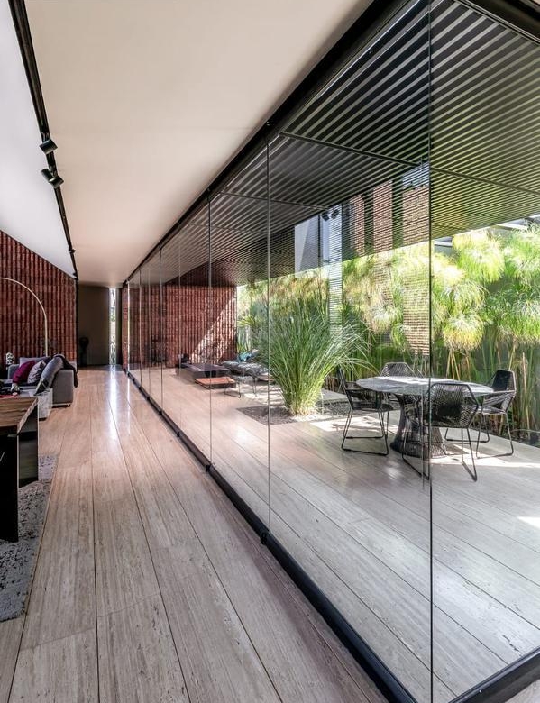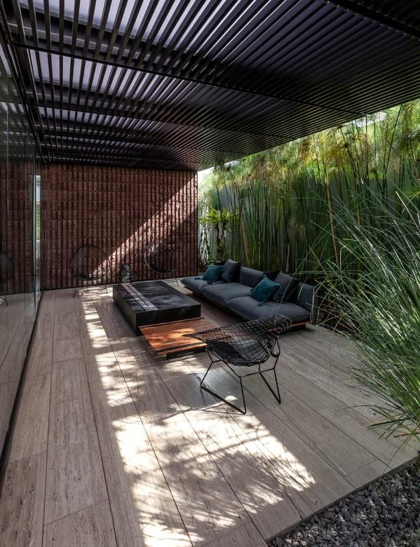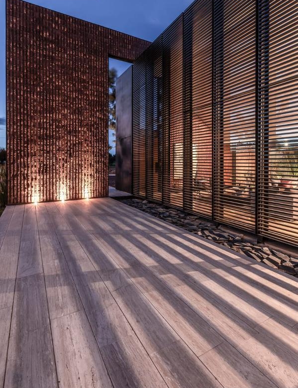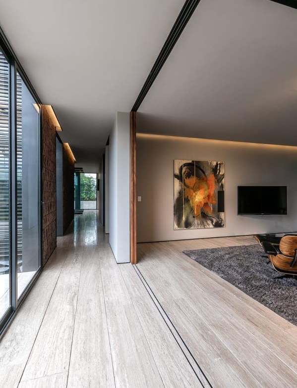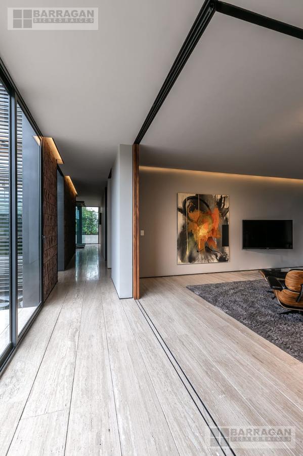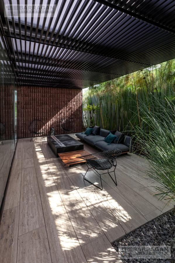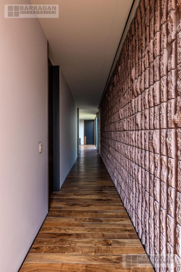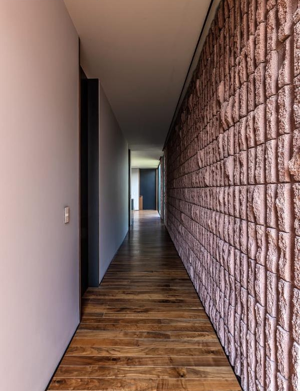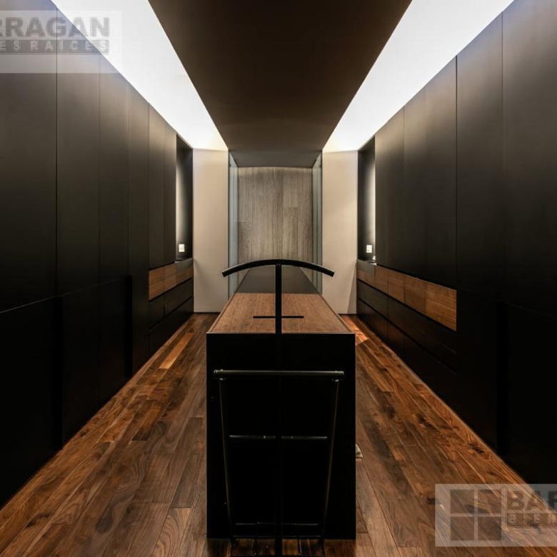Desde que ingresamos podemos notar que todos los acabados son de la más alta calidad; muros de 30cms de block estriado color tezontle, aplanados de muros y plafones en yeso, piso de mármol Travertino Veteado formato 30 x largos libres, duela de madera de ingeniería de nogal Negro Americano, cubiertas de lavabos en granito Negro Absoluto, cancelaría de aluminio negro en corredizas y pivotantes de cristal templado.
