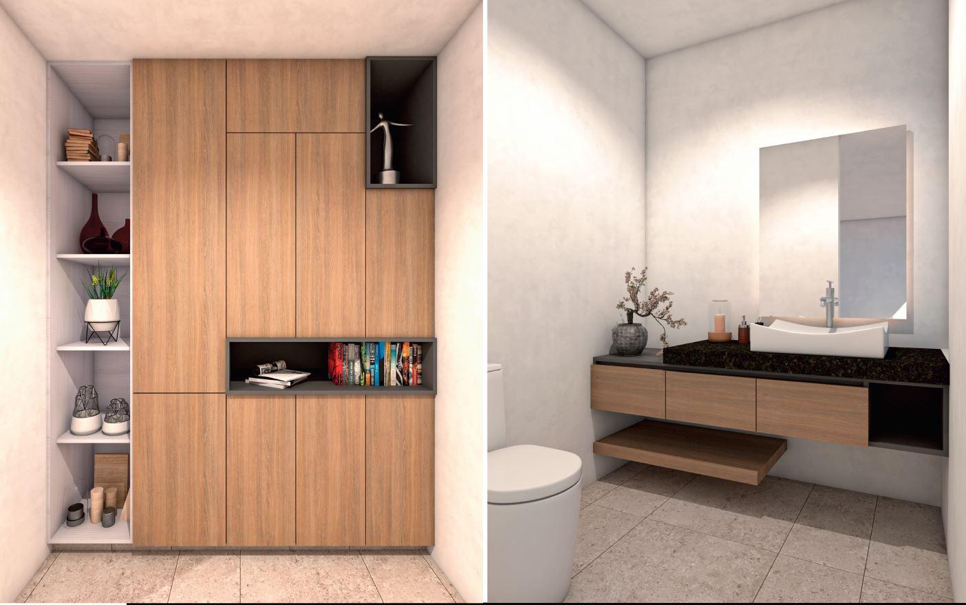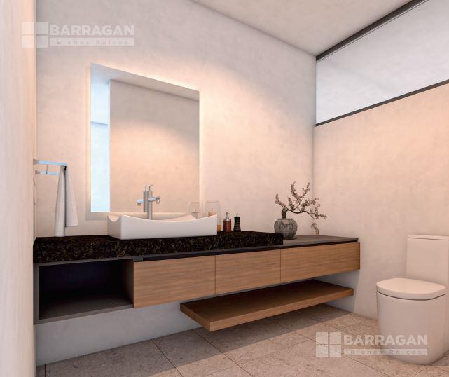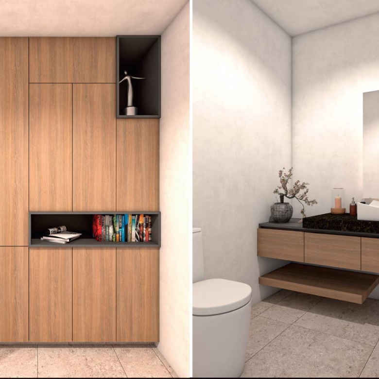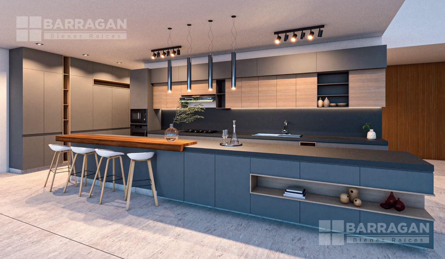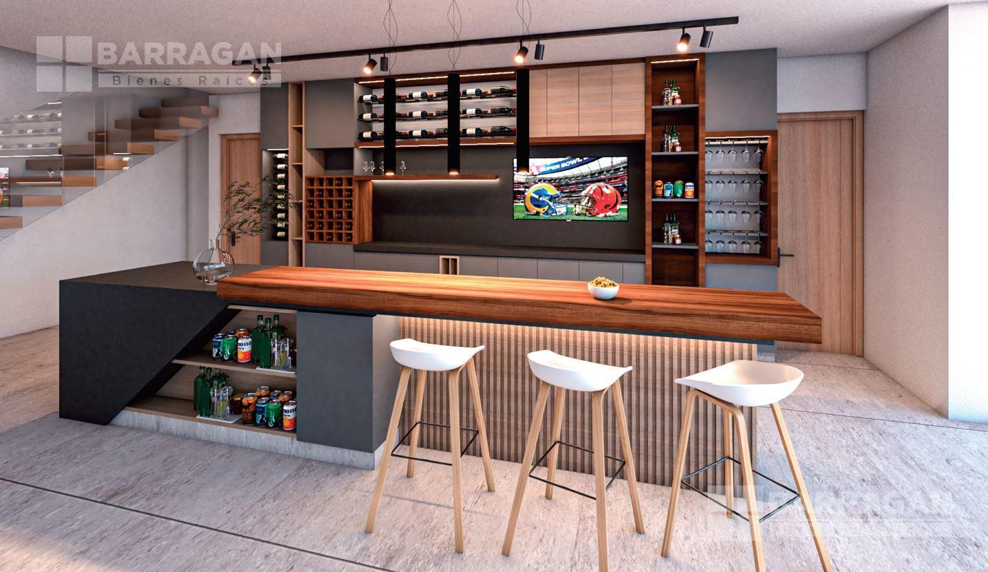 En planta baja, un elegante vestíbulo da paso a la sala y comedor con excelente iluminación natural, cocina de diseño contemporáneo, terraza que integra el interior con el exterior, cuarto de lavado y recámara de servicio con baño completo.