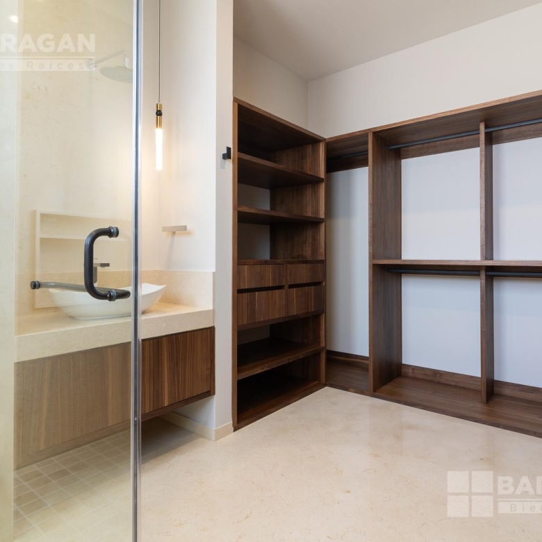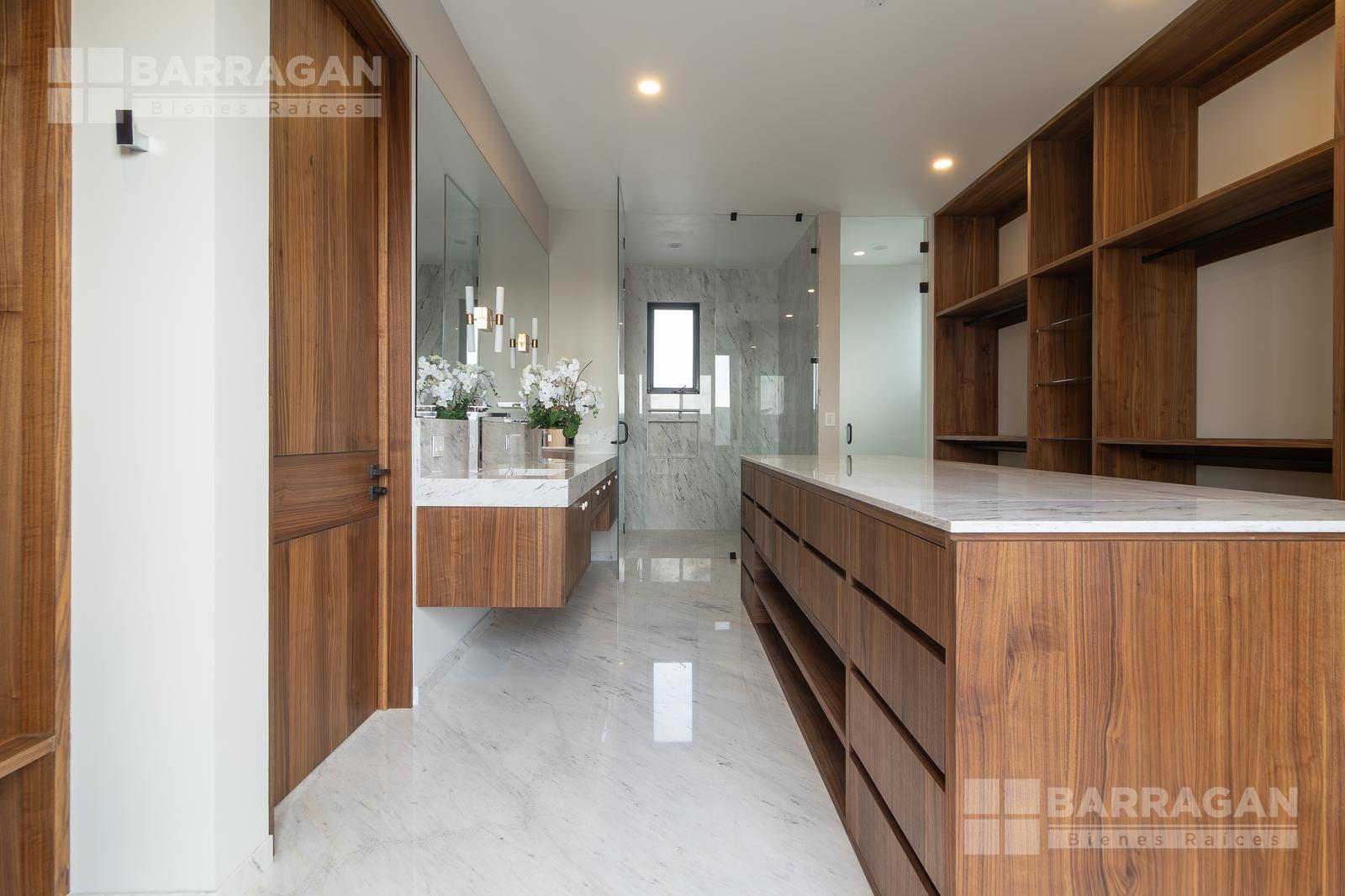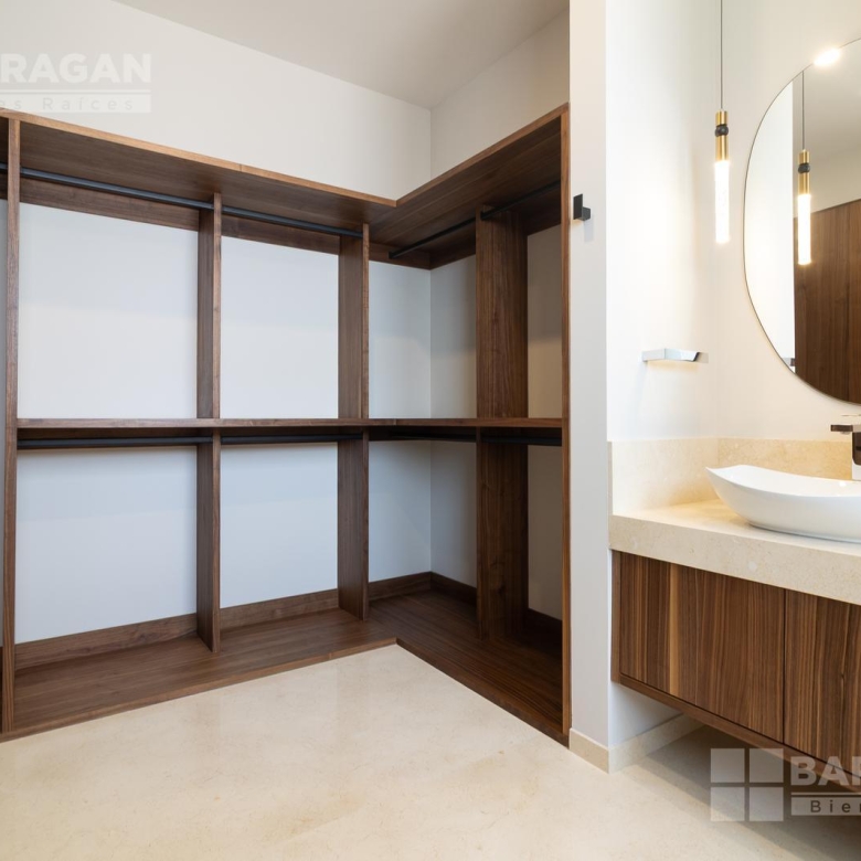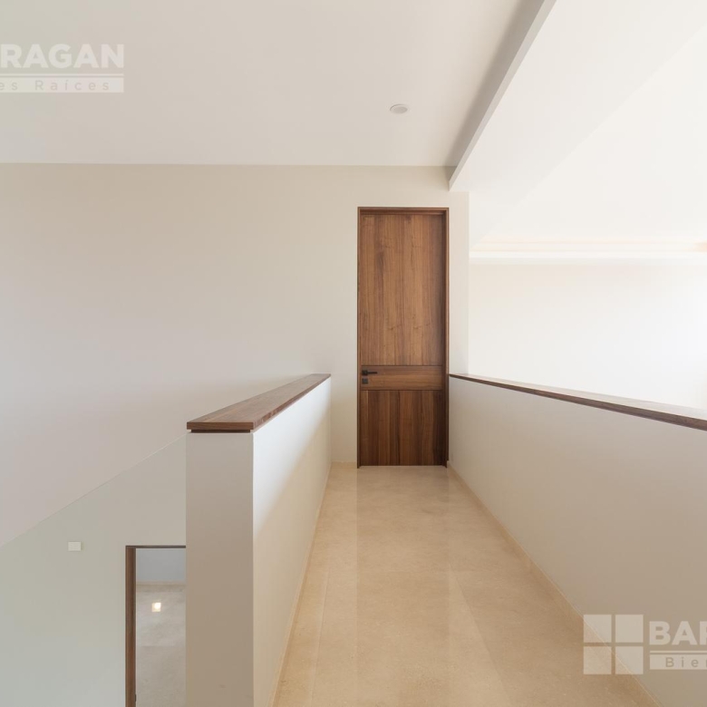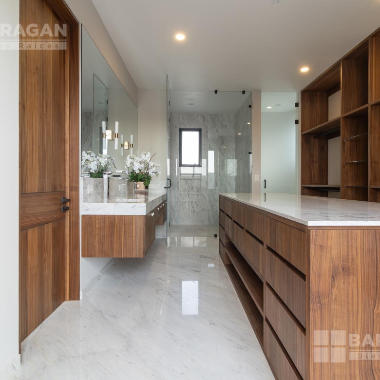 La planta alta alberga tres recámaras, todas con baño completo y vestidor, ofreciendo privacidad y confort. La recámara principal destaca por sus generosas dimensiones, con 31.43 m², un vestidor de 33.30 m² y una terraza privada de 26 m², ideal para disfrutar momentos de descanso. Además, cuenta con una acogedora sala de TV con área para tareas y acceso a una terraza techada, pensada como un espacio familiar cómodo y bien iluminado.