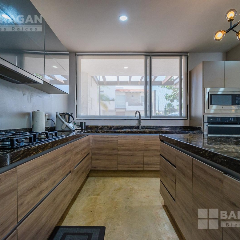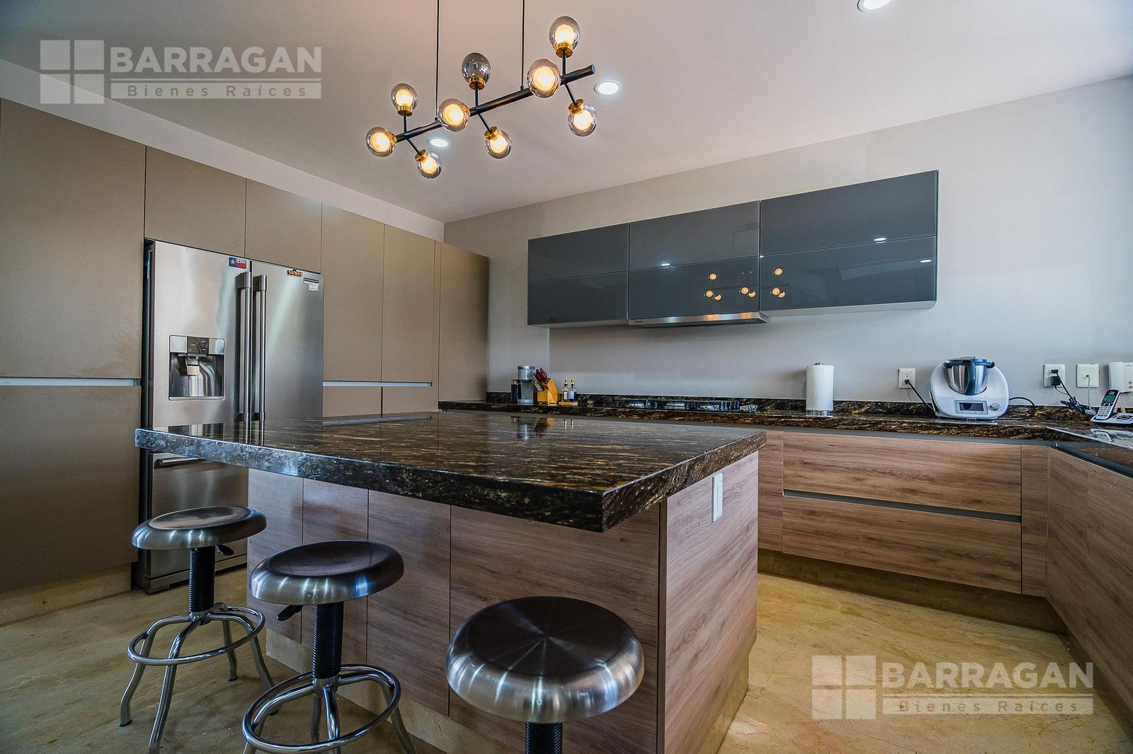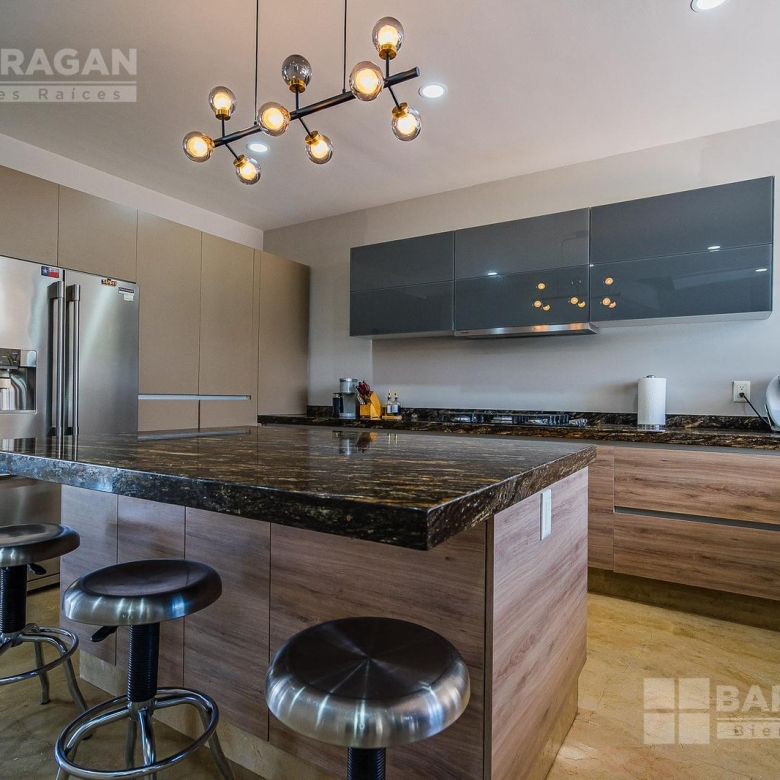 La cocina, amplia y equipada con isla central y barra desayunadora con acabados en mármol, combina funcionalidad y elegancia. También con cuarto de servicio con baño completo, patio de servicio y estacionamiento techado para dos vehículos.