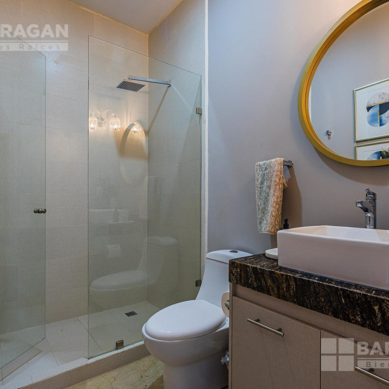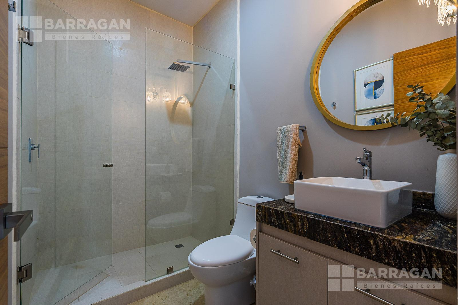 En planta baja, un imponente recibidor a doble altura marca la pauta de amplitud y luminosidad. Cuenta con baño completo y un estudio con opción a convertirse en cuarta recámara, ideal para visitas o para quienes buscan un espacio adicional en planta baja. La sala, también a doble altura, y el comedor de generosas dimensiones se integran armoniosamente y conectan de forma directa con la terraza y jardín permitiendo abrir completamente el área social para fusionar el interior con el exterior en un ambiente perfecto para reuniones y momentos especiales.
