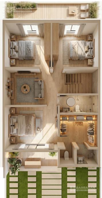 En la planta alta se encuentra la recámara principal, que ofrece un espacio privado con balcón, baño completo y un clóset amplio. Además, cuenta con dos recámaras secundarias con clóset, un baño completo adicional y un área de TV o estudio que se adapta perfectamente a las necesidades de la familia.