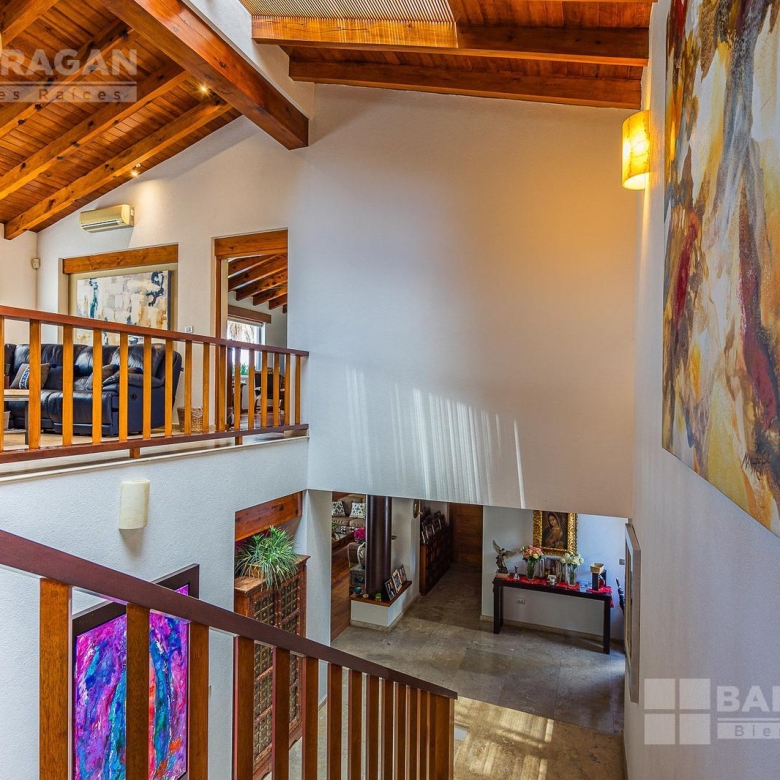 De primera impresión podemos notar el cuidado en cada detalle, grandes palmeras nos dirigen hacia la cochera que cuenta con espacio para hasta 8 autos.