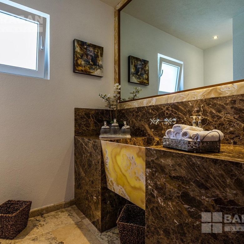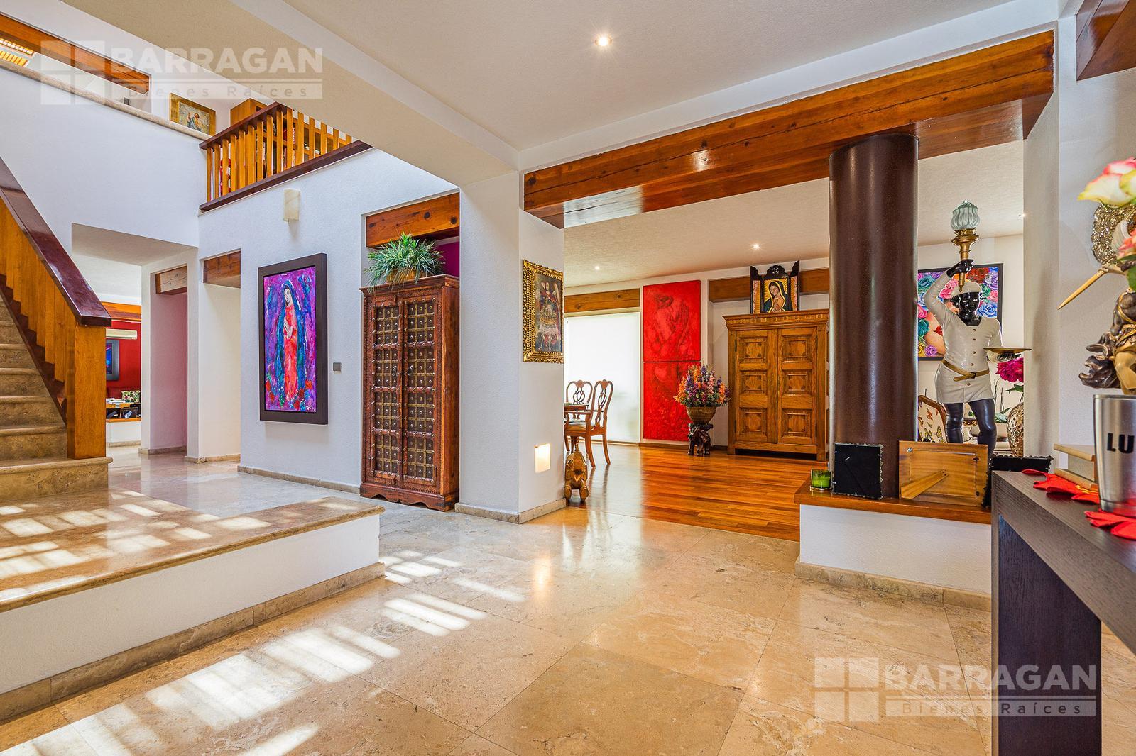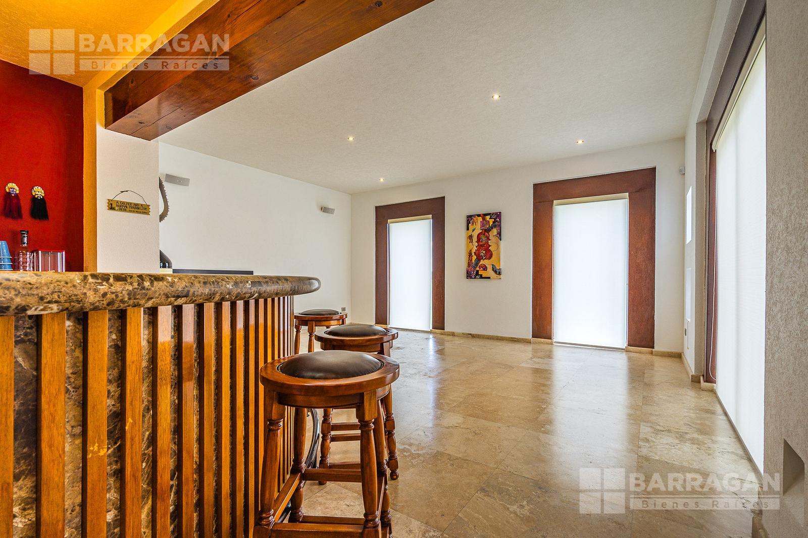 Al entrar a la casa nos encontramos en un vestíbulo iluminado naturalmente, con pisos de mármol y doble altura. En esta primera planta contamos con la sala de estar la cual se conecta al comedor, y a la cocina, en donde encontraremos una isla al centro y desayunador, refrigerador XX, y despensa. Tenemos también un estudio que puede ser utilizado como cuarto de visitas, un espacio para bar y cuarto de juegos, terraza y acceso a la alberca y jardín así como un medio baño de visitas.