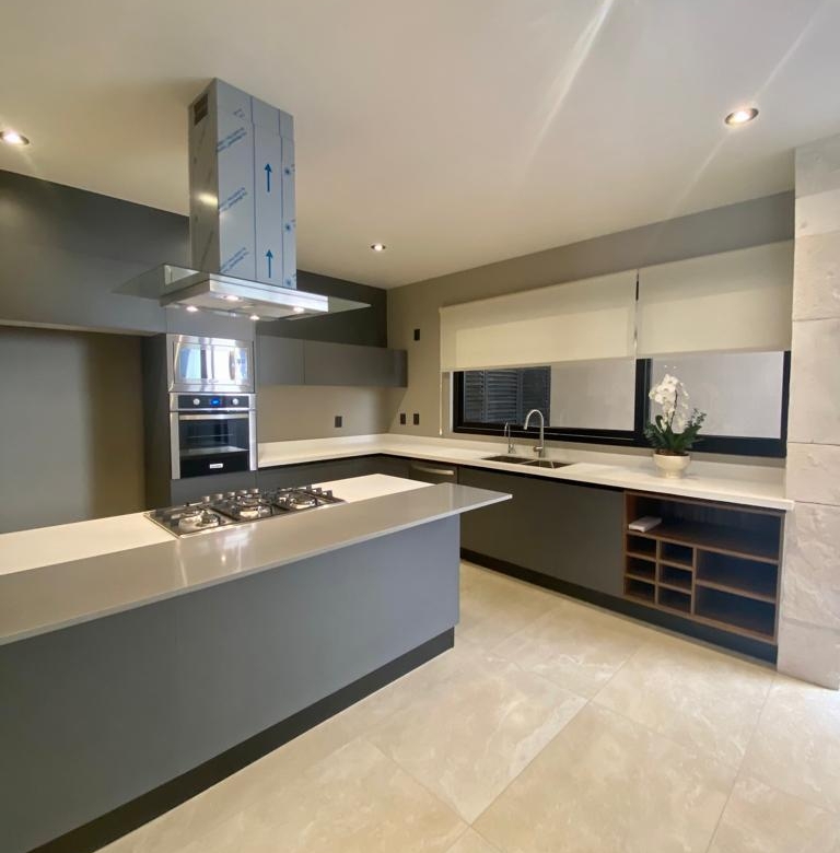 La propiedad se distribuye en tres niveles; en planta baja cuenta con cocina equipada con cubierta de cuarzo, amplia sala, comedor, estancia, baño de visitas y jardín.