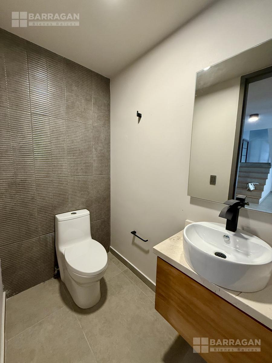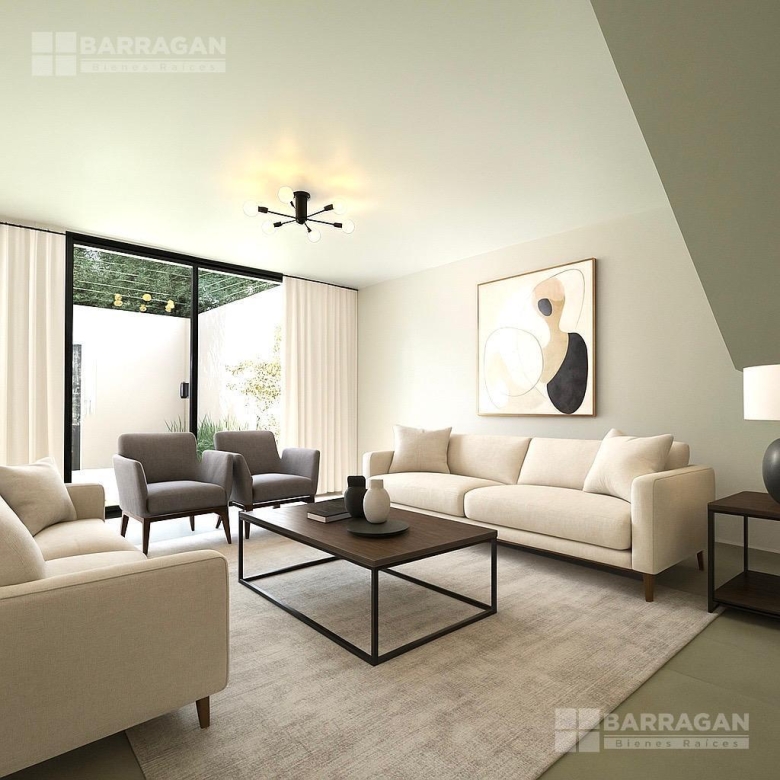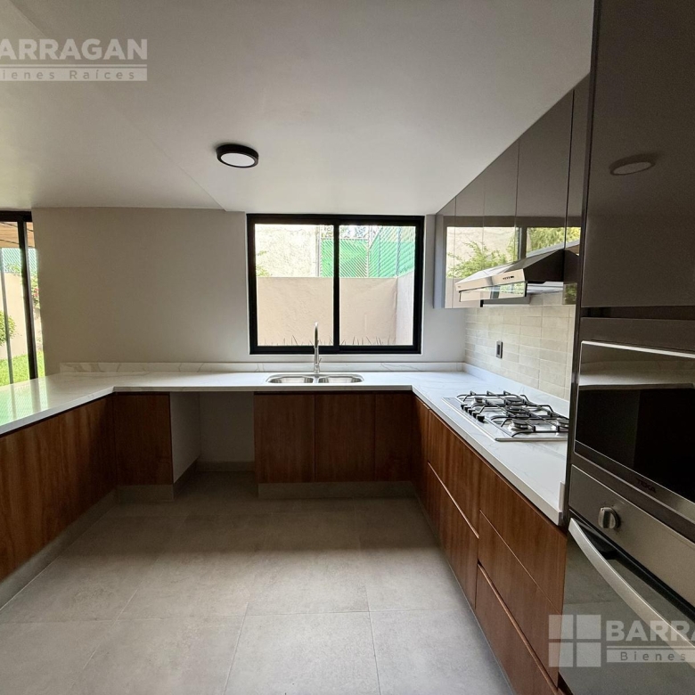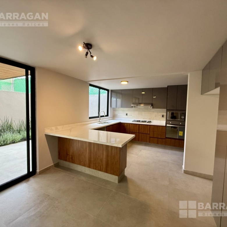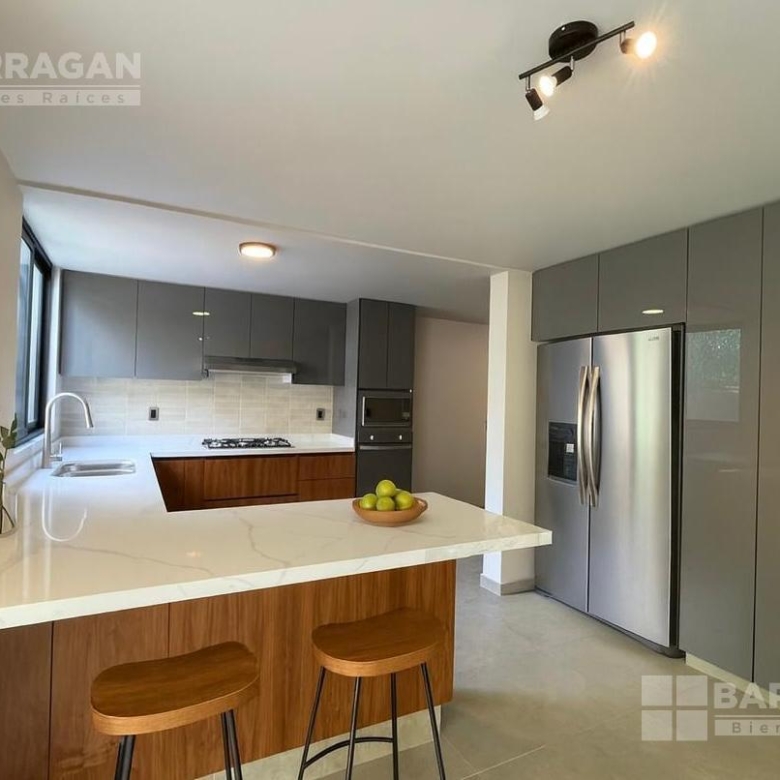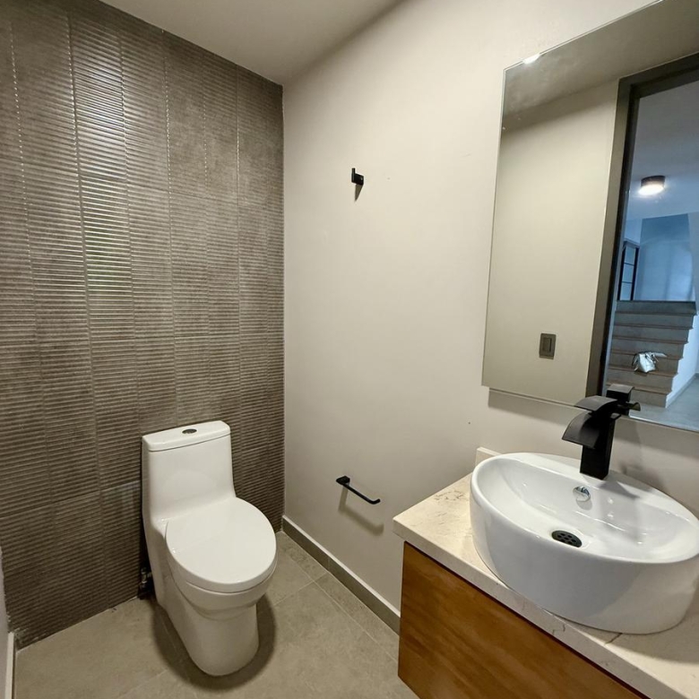 En planta baja nos recibe la sala y el comedor integrándose con una amplia terraza techada y un jardín muy bonito; la cocina muy bien equipada con cubierta de cuarzo y muebles de tzalam.