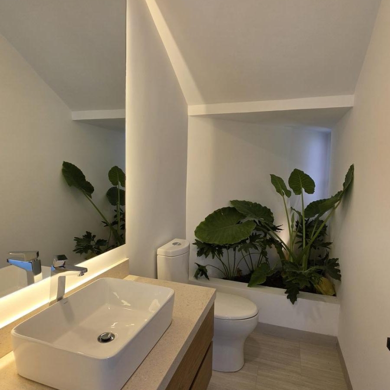 Cuenta con cochera para tres autos, acceso principal y vestíbulo. Dispone de una recámara con vestidor y baño completo, ideal para visitas o para uso en planta baja. La sala y el comedor se integran armoniosamente con la amplia cocina abierta y equipada. Además, se conecta con el jardín, aportando frescura y luz natural. En esta planta también se encuentra el área de servicio, que incluye cuarto con baño completo, bodega y cuarto de lavado.