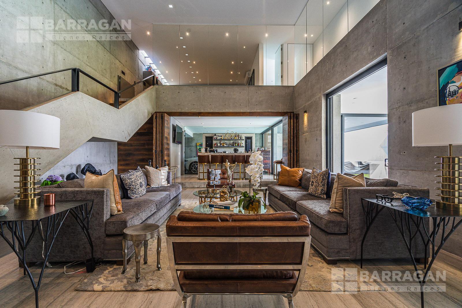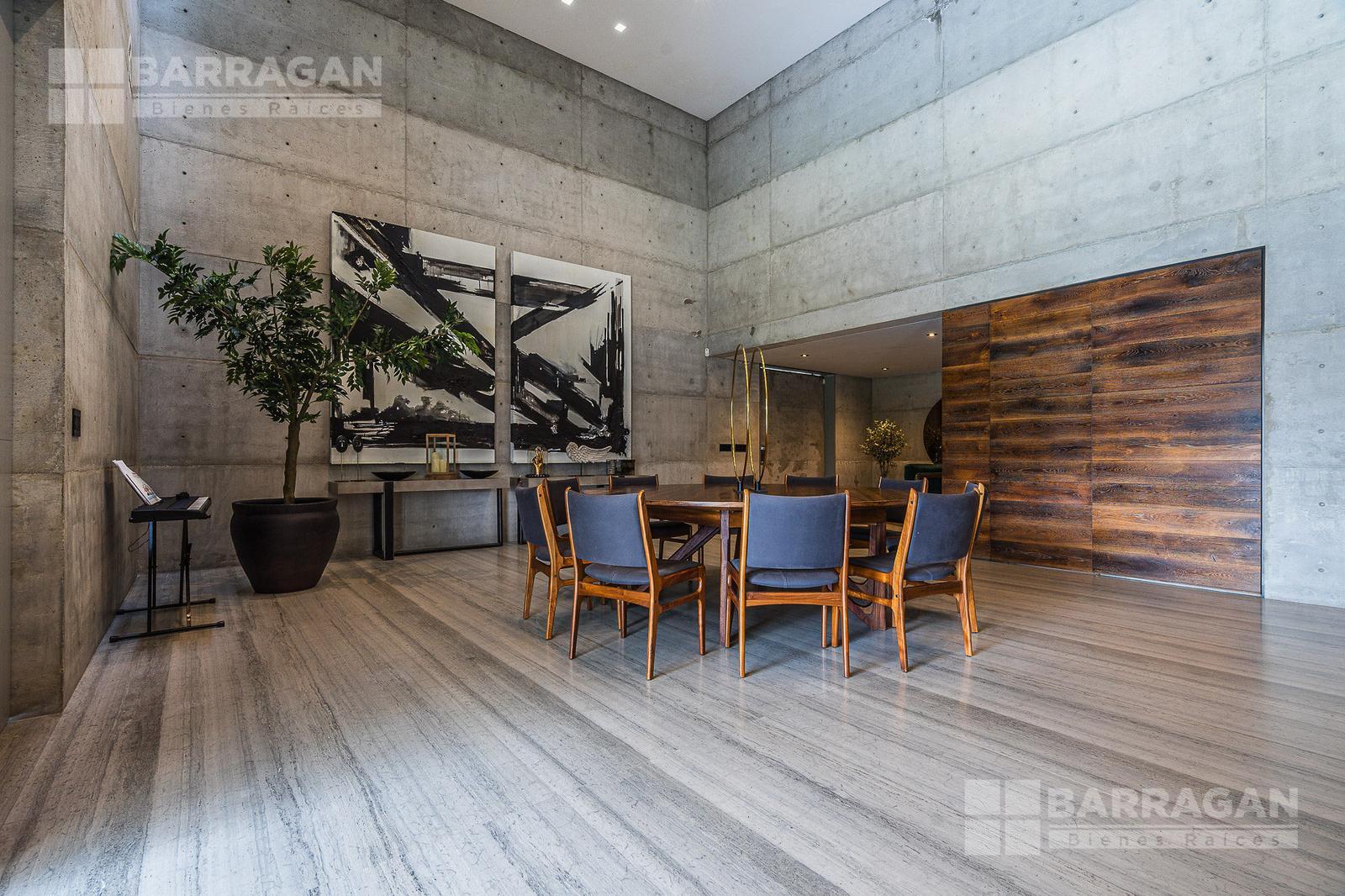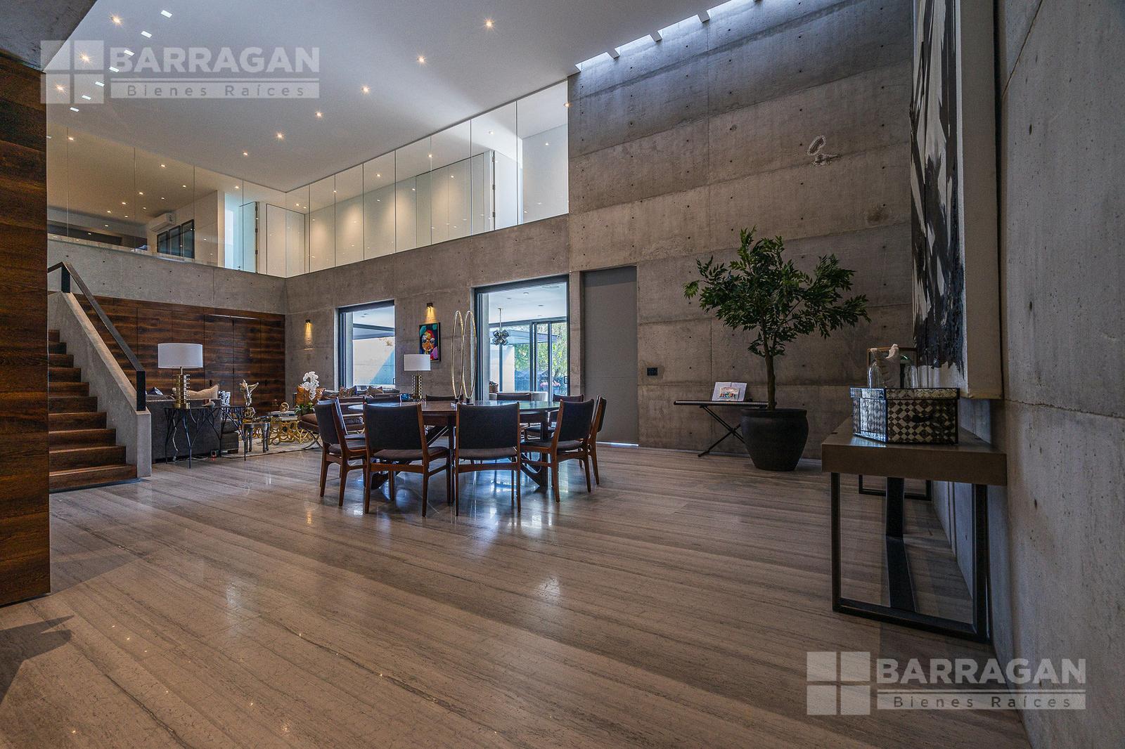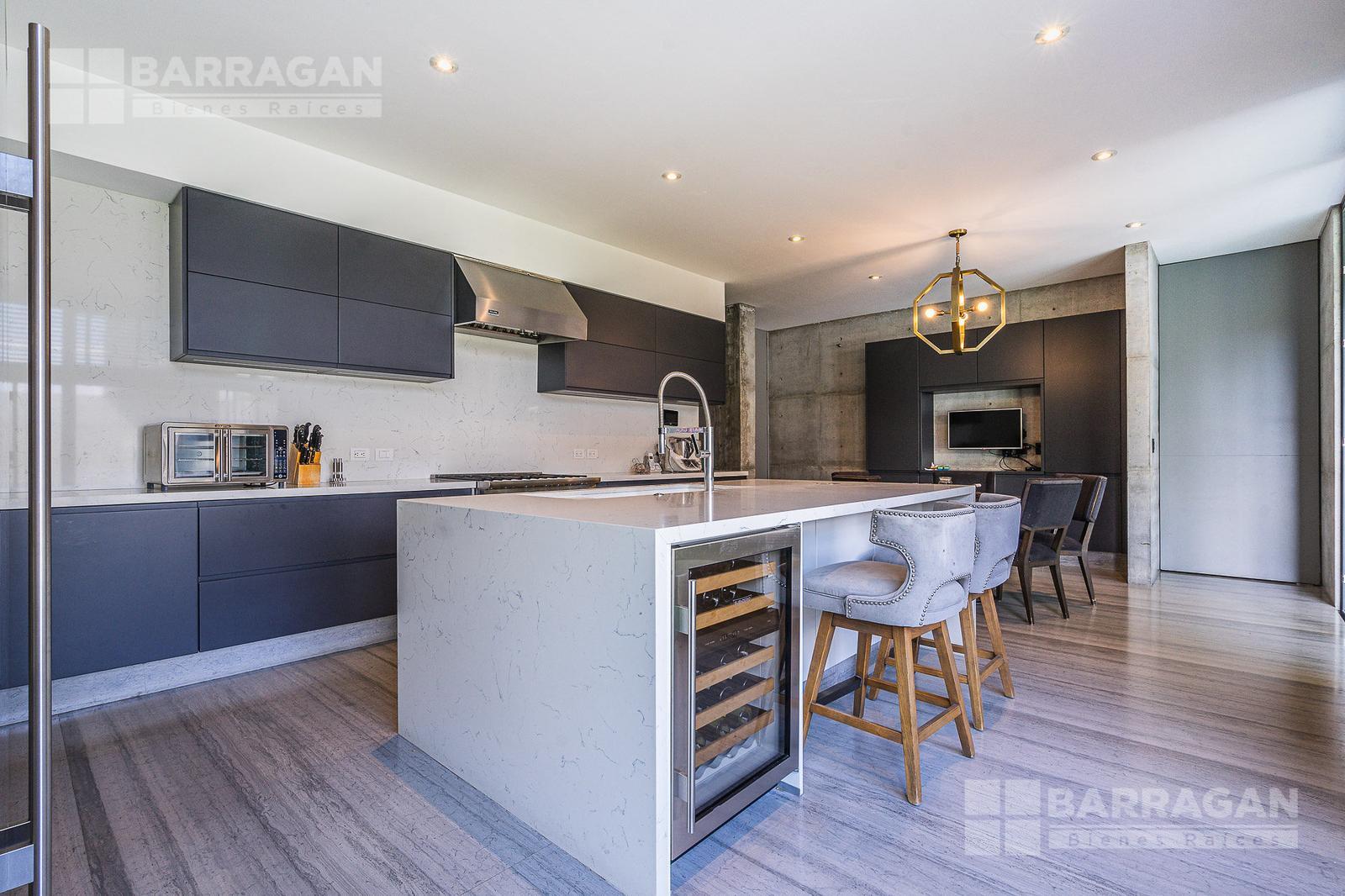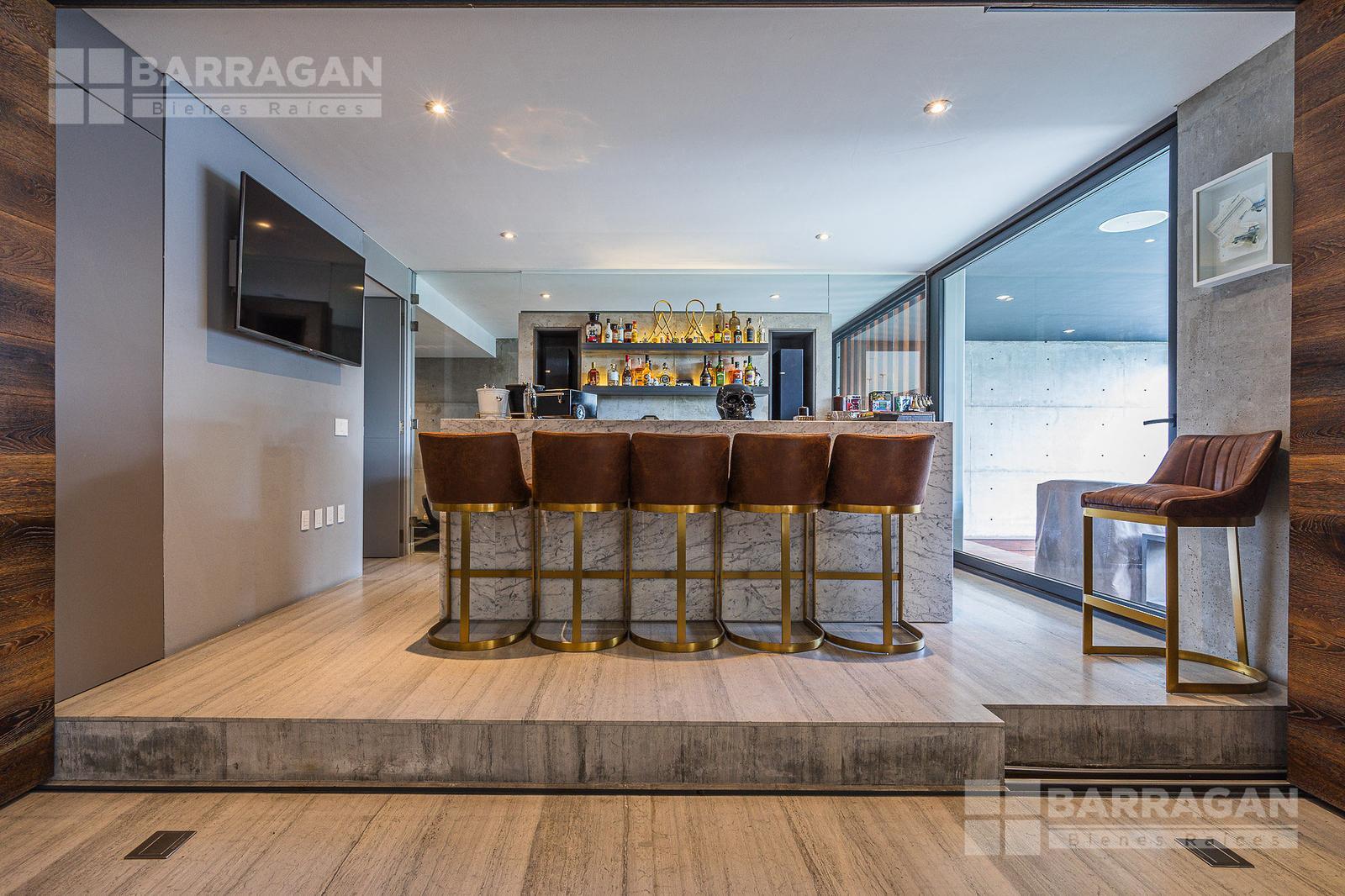 Entrado a la casa, encuentras un amplio recibidor con un muro de madera y pared de concreto el cual conecta con el comedor, sala y bar con medio baño, estos espacios tienen techos a doble altura, la cocina tiene modernos electrodomésticos, barra de cuarzo blanca y espacio para desayunador, en planta baja hay un medio baño de visitas así como un family room y un cuarto de visitas con baño completo.