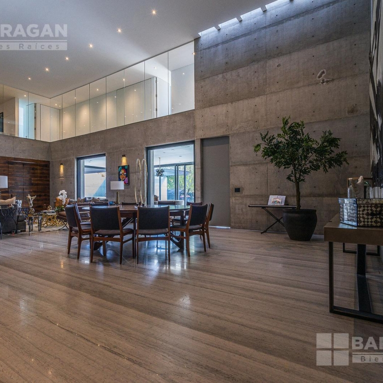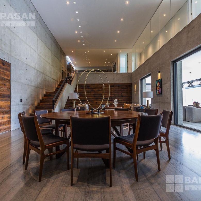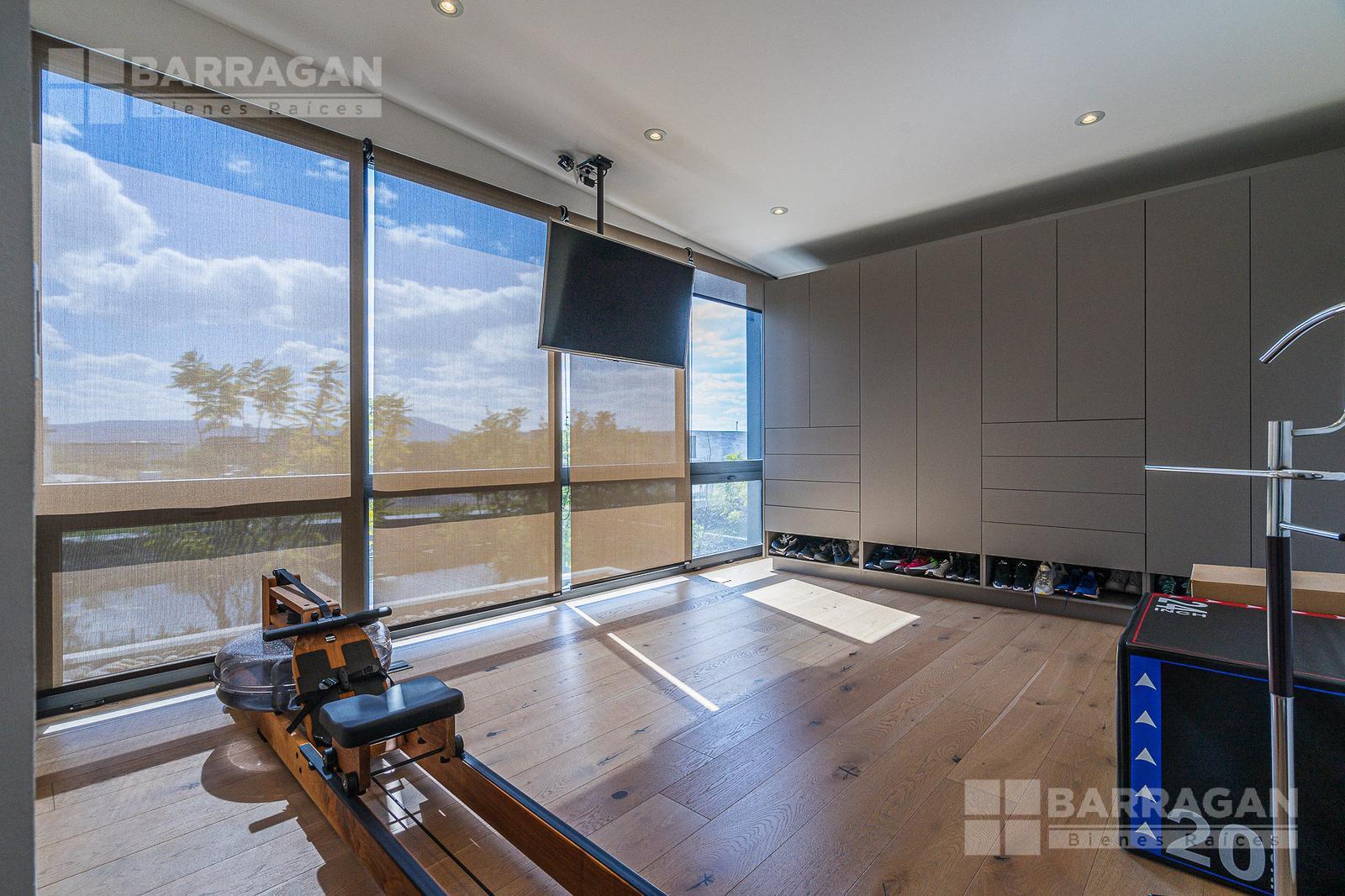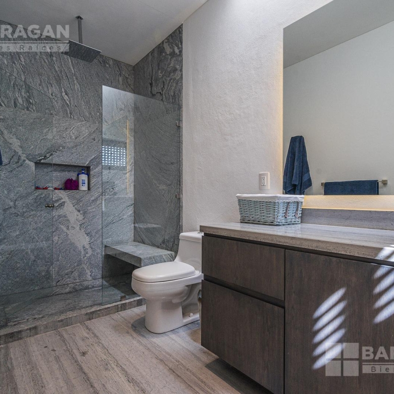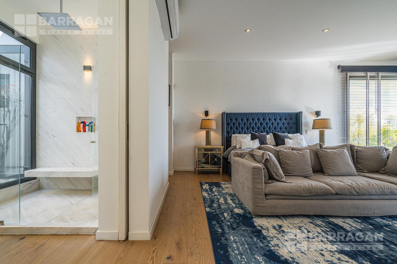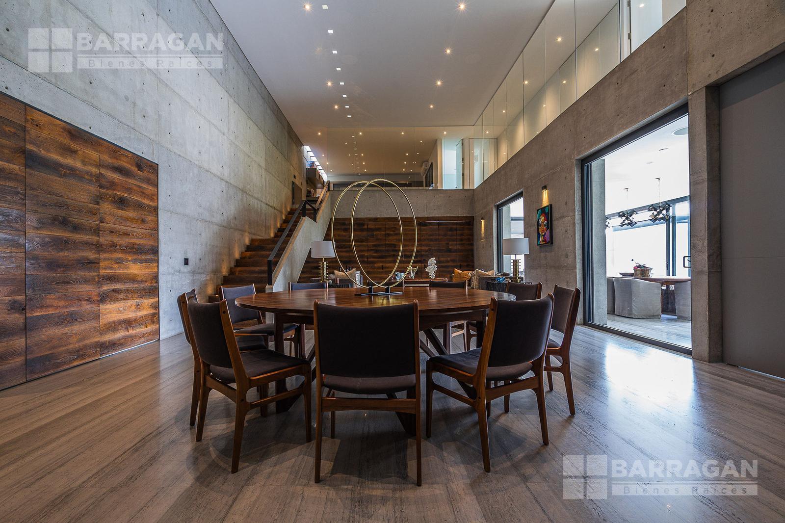 Entrado a la casa, encuentras un amplio recibidor con un muro de madera y pared de concreto el cual conecta con el comedor, sala y bar con medio baño, estos espacios tienen techos a doble altura, la cocina tiene modernos electrodomésticos, barra de cuarzo blanca y espacio para desayunador, en planta baja hay un medio baño de visitas así como un family room y un cuarto de visitas con baño completo.