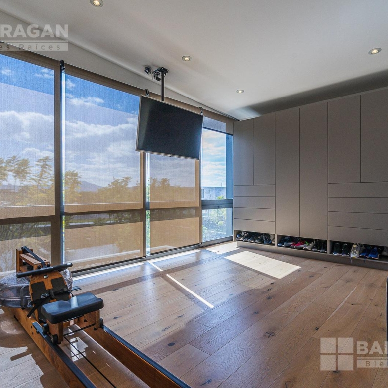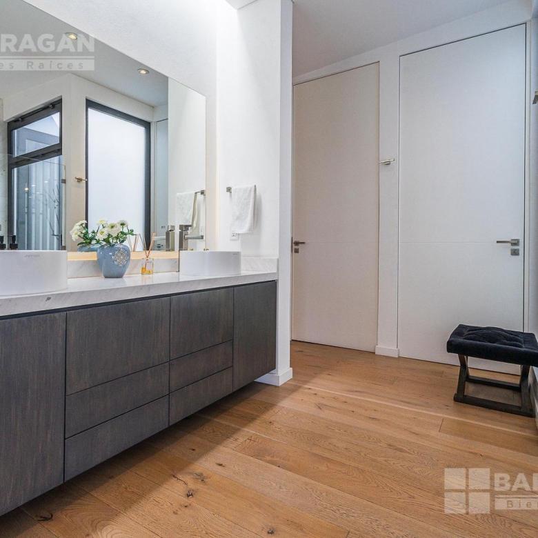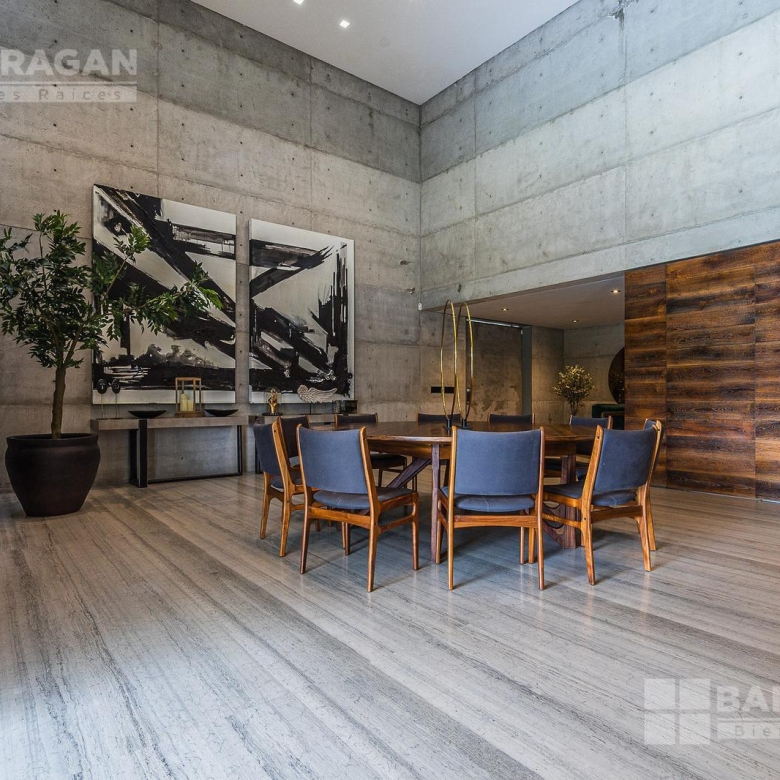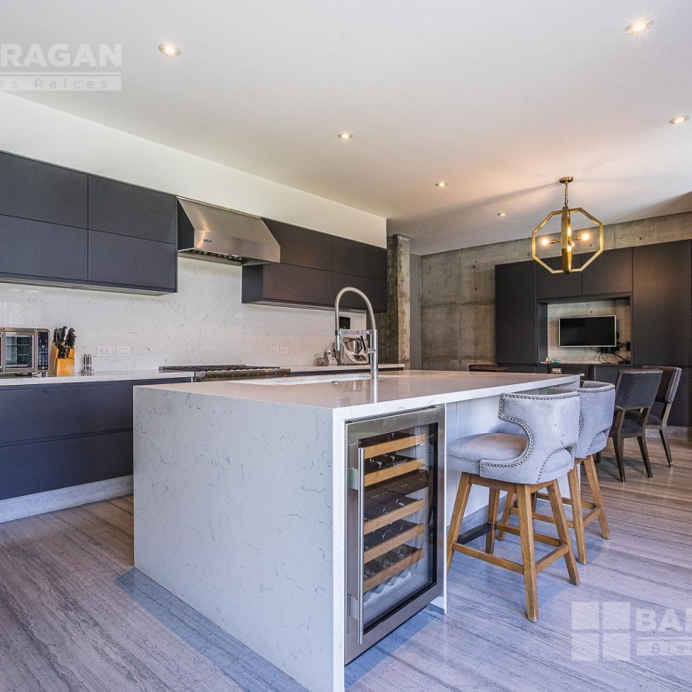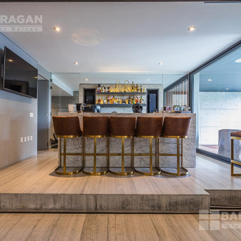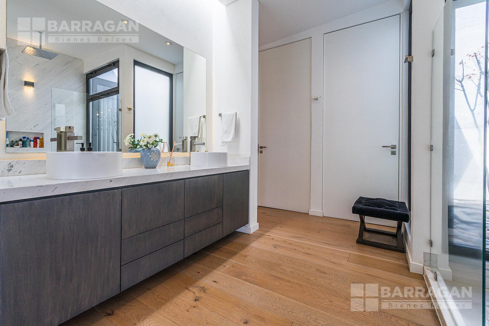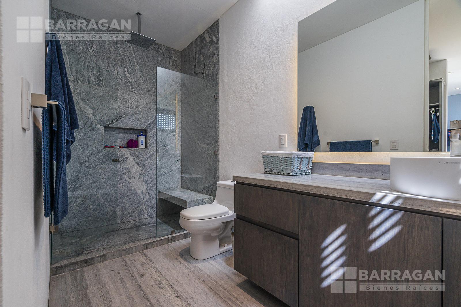 Entrado a la casa, encuentras un amplio recibidor con un muro de madera y pared de concreto el cual conecta con el comedor, sala y bar con medio baño, estos espacios tienen techos a doble altura, la cocina tiene modernos electrodomésticos, barra de cuarzo blanca y espacio para desayunador, en planta baja hay un medio baño de visitas así como un family room y un cuarto de visitas con baño completo.