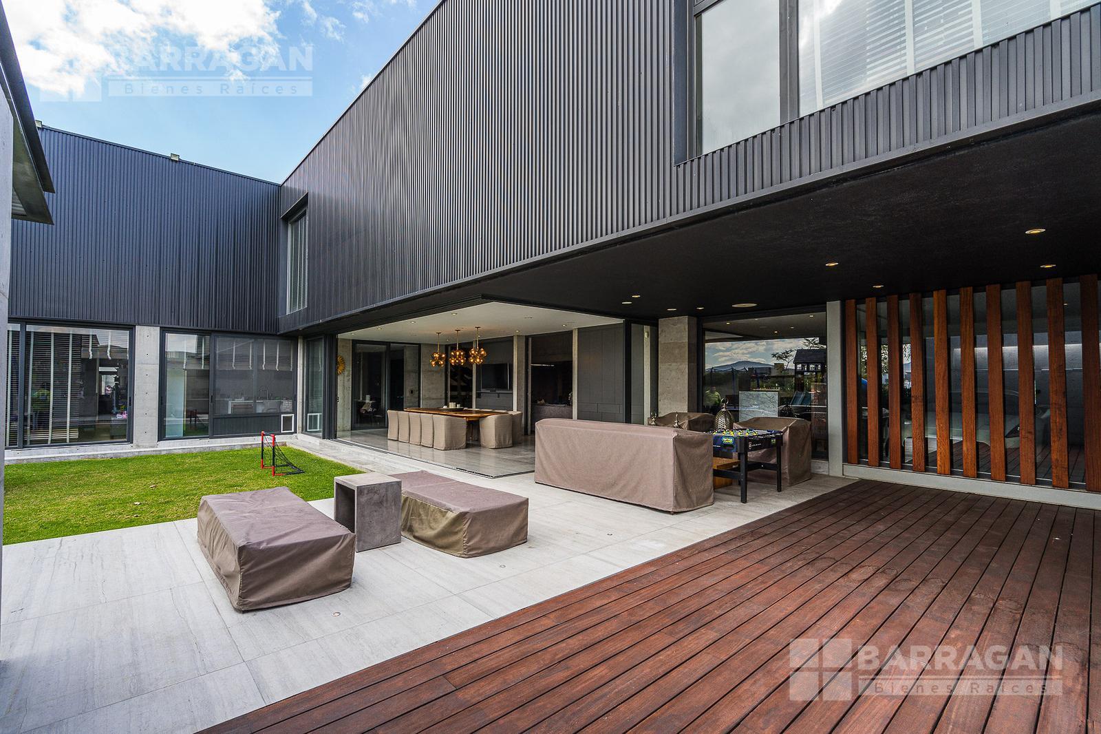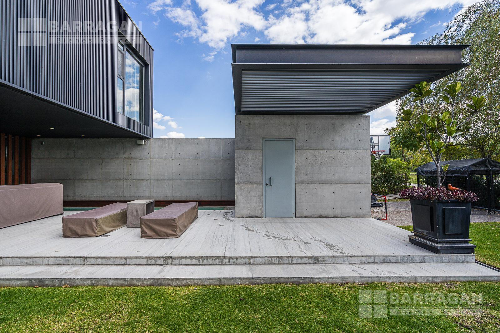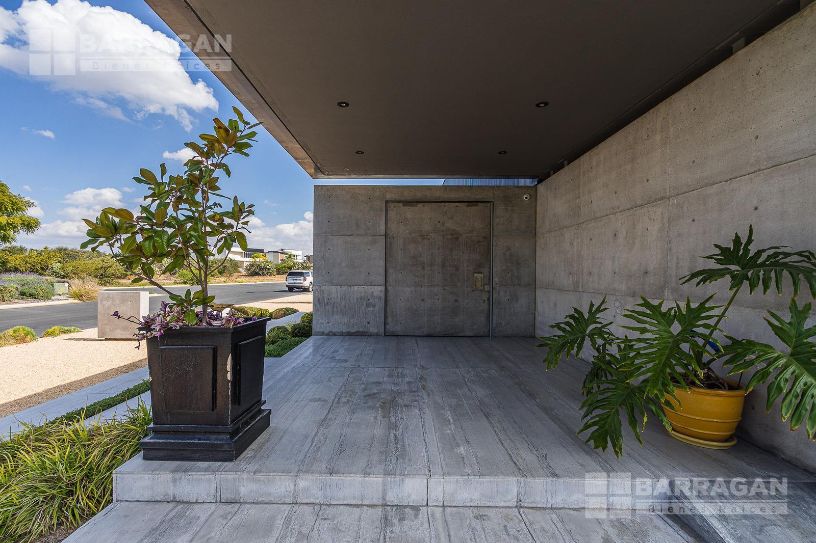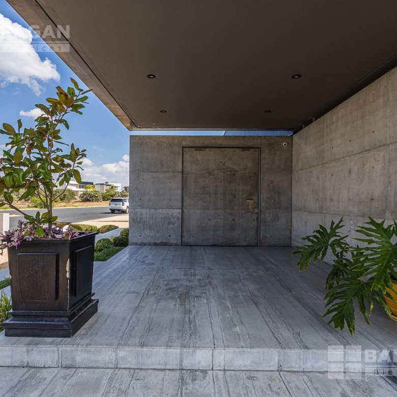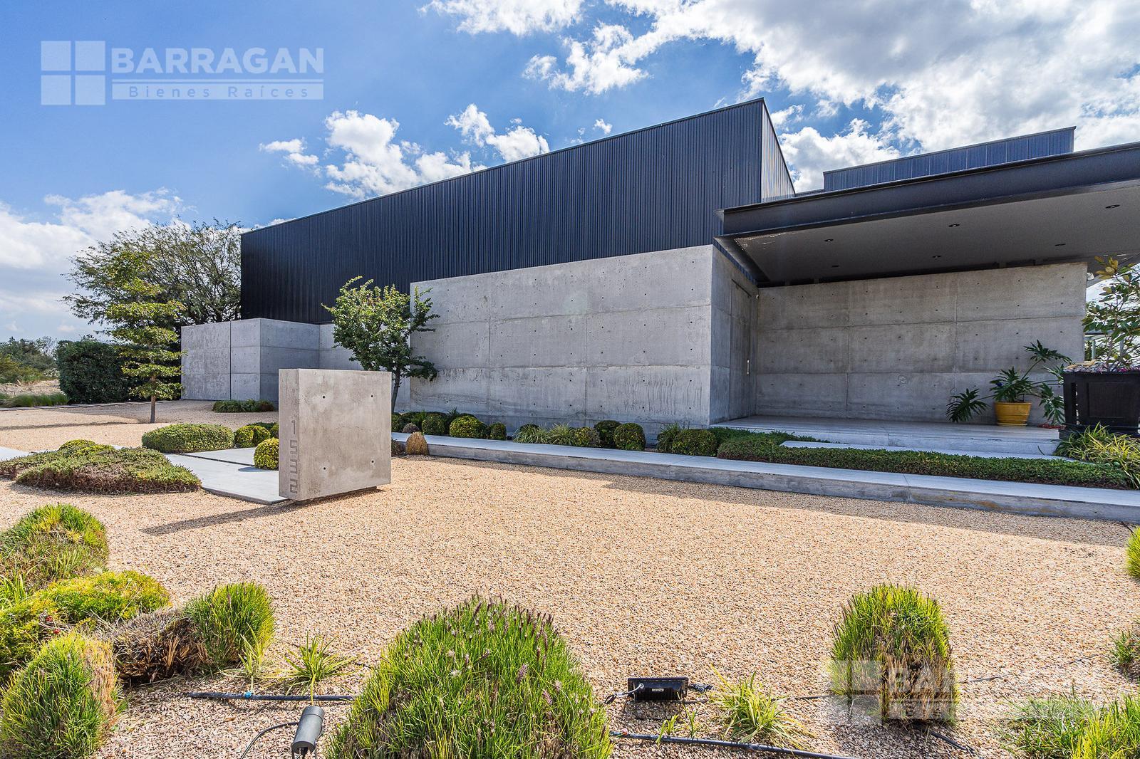 Casa moderna con acabados exteriores de concreto y vigas de acero que contrastan con un jardín frontal de plantas desérticas y piedra caliza lo que hace una combinación única, cuenta con pasillos laterales que llevan a la cochera la cual cuenta con bodega y tres espacios para autos y dos espacios para carritos de golf techados, acceso a la cocina y área de servicio el cual cuenta con cuarto de servicio con baño completo y lavandería. El segundo pasillo lateral lleva a la terraza la cual cuenta con amplio jardín y alberca con cubierta de madera tipo deck mecanizada para ocultar la alberca y así aprovechar al máximo el espacio de la terraza. En el jardín se encuentran dos baños completos independientes para dar servicio a la alberca.
