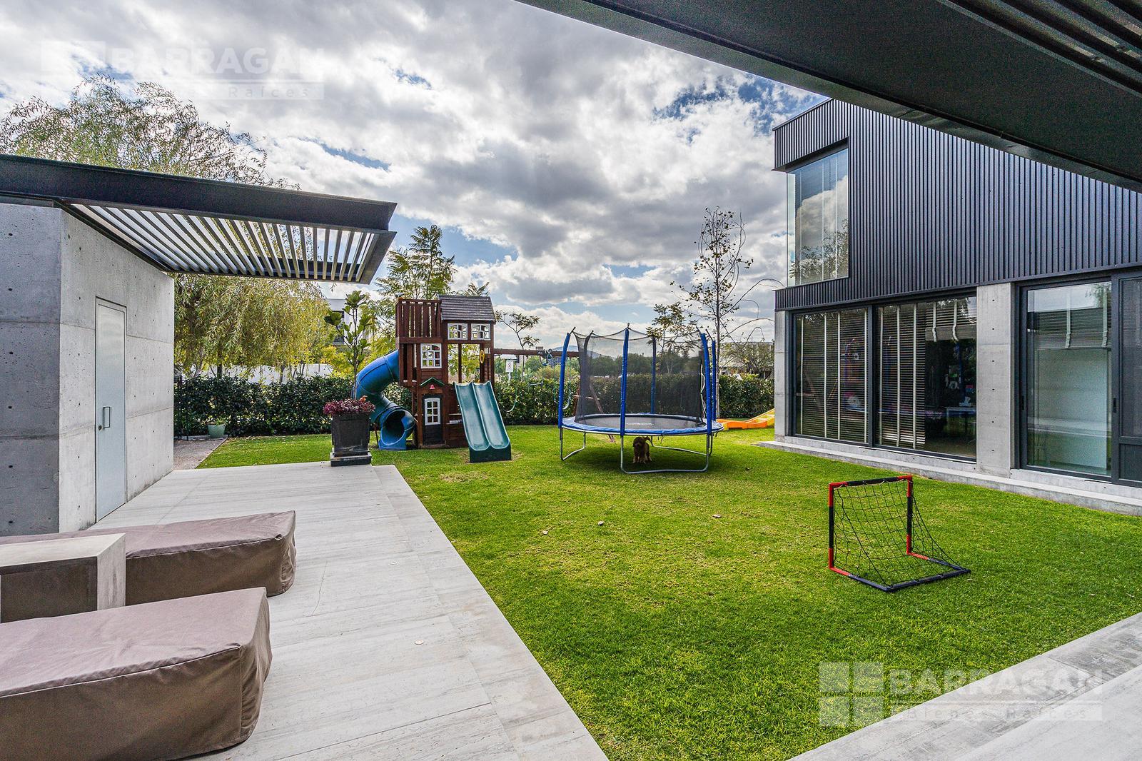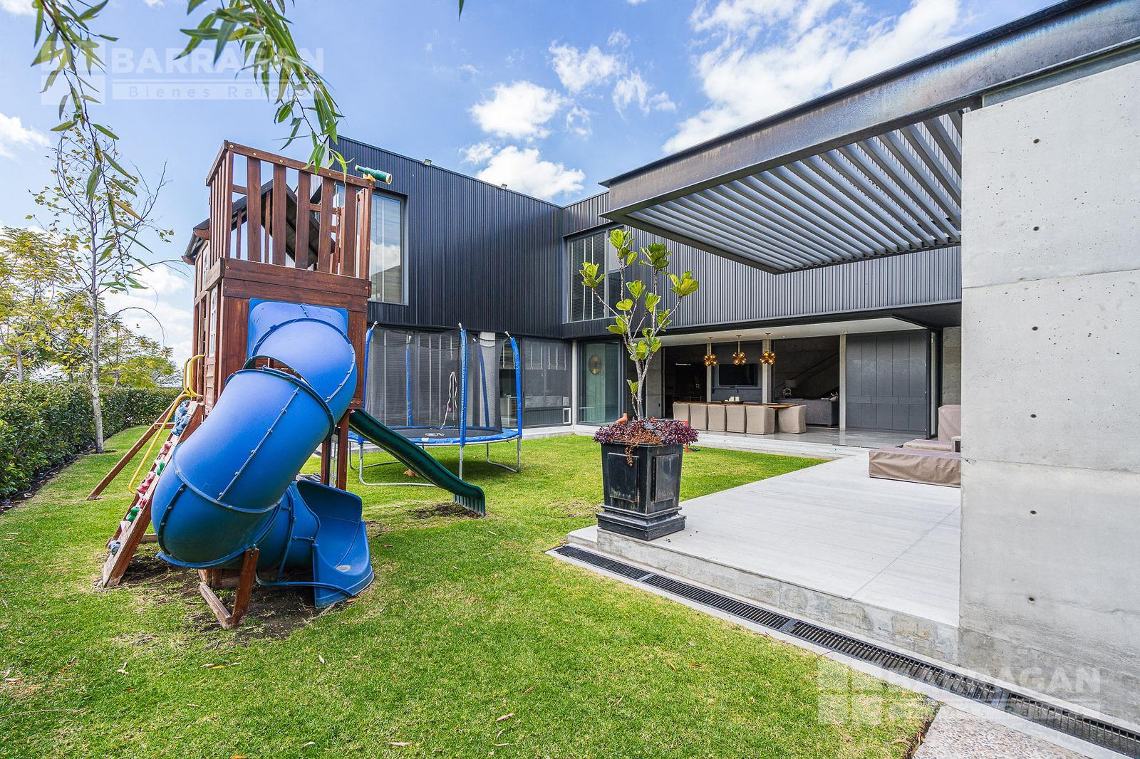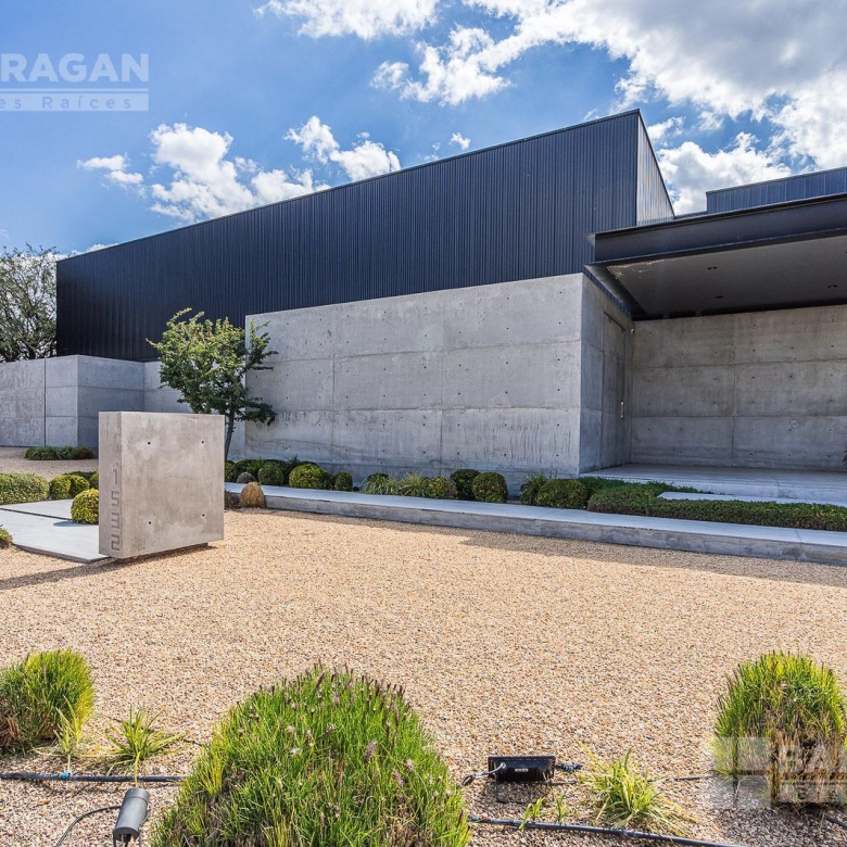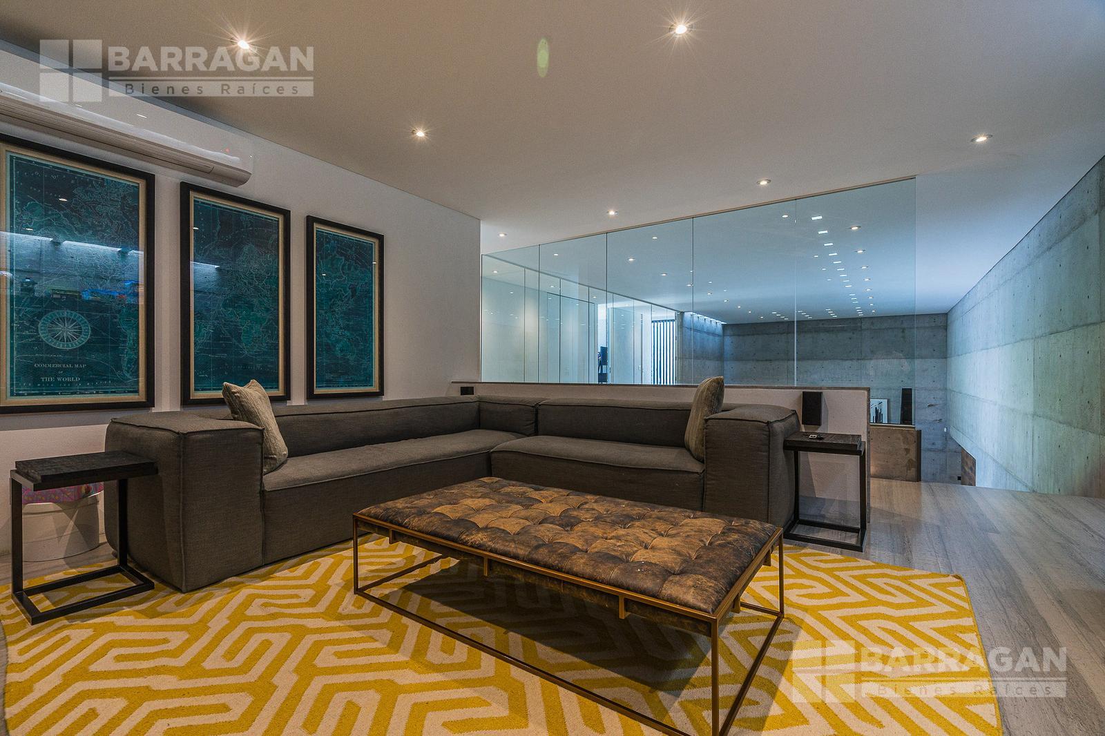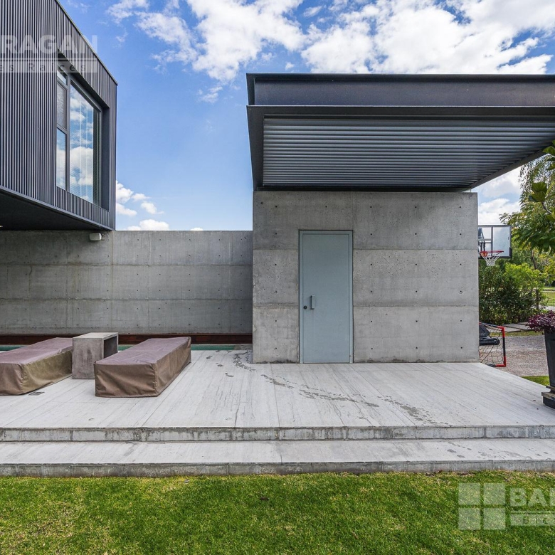 Casa moderna con acabados exteriores de concreto y vigas de acero que contrastan con un jardín frontal de plantas desérticas y piedra caliza lo que hace una combinación única, cuenta con pasillos laterales que llevan a la cochera la cual cuenta con bodega y tres espacios para autos y dos espacios para carritos de golf techados, acceso a la cocina y área de servicio el cual cuenta con cuarto de servicio con baño completo y lavandería. El segundo pasillo lateral lleva a la terraza la cual cuenta con amplio jardín y alberca con cubierta de madera tipo deck mecanizada para ocultar la alberca y así aprovechar al máximo el espacio de la terraza. En el jardín se encuentran dos baños completos independientes para dar servicio a la alberca.