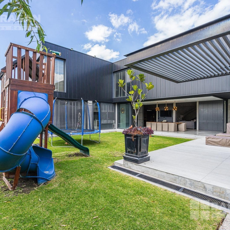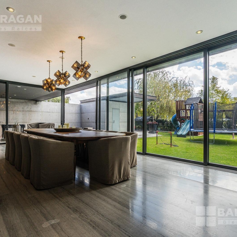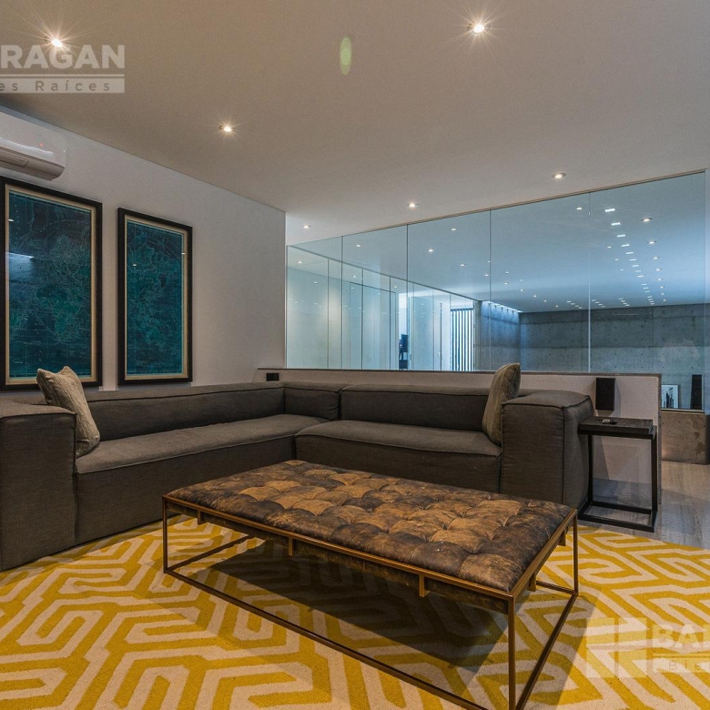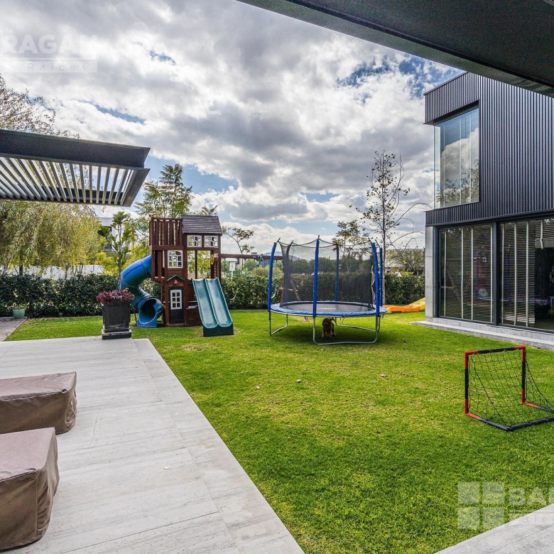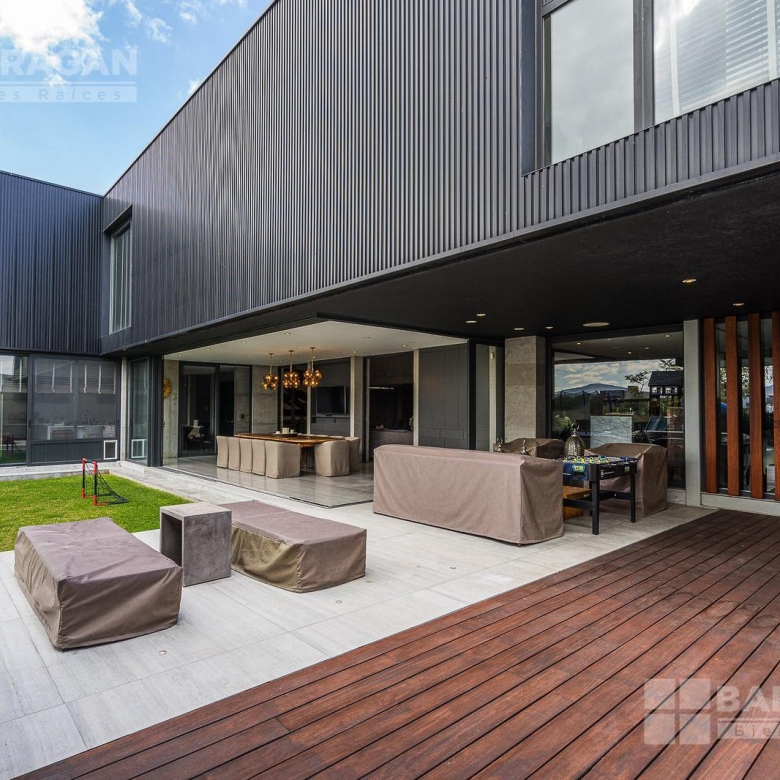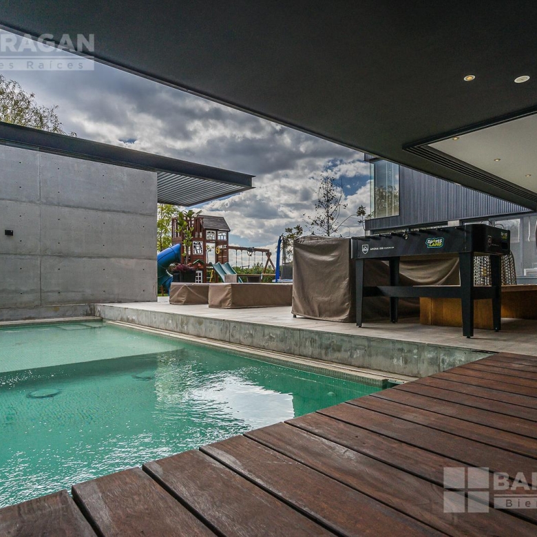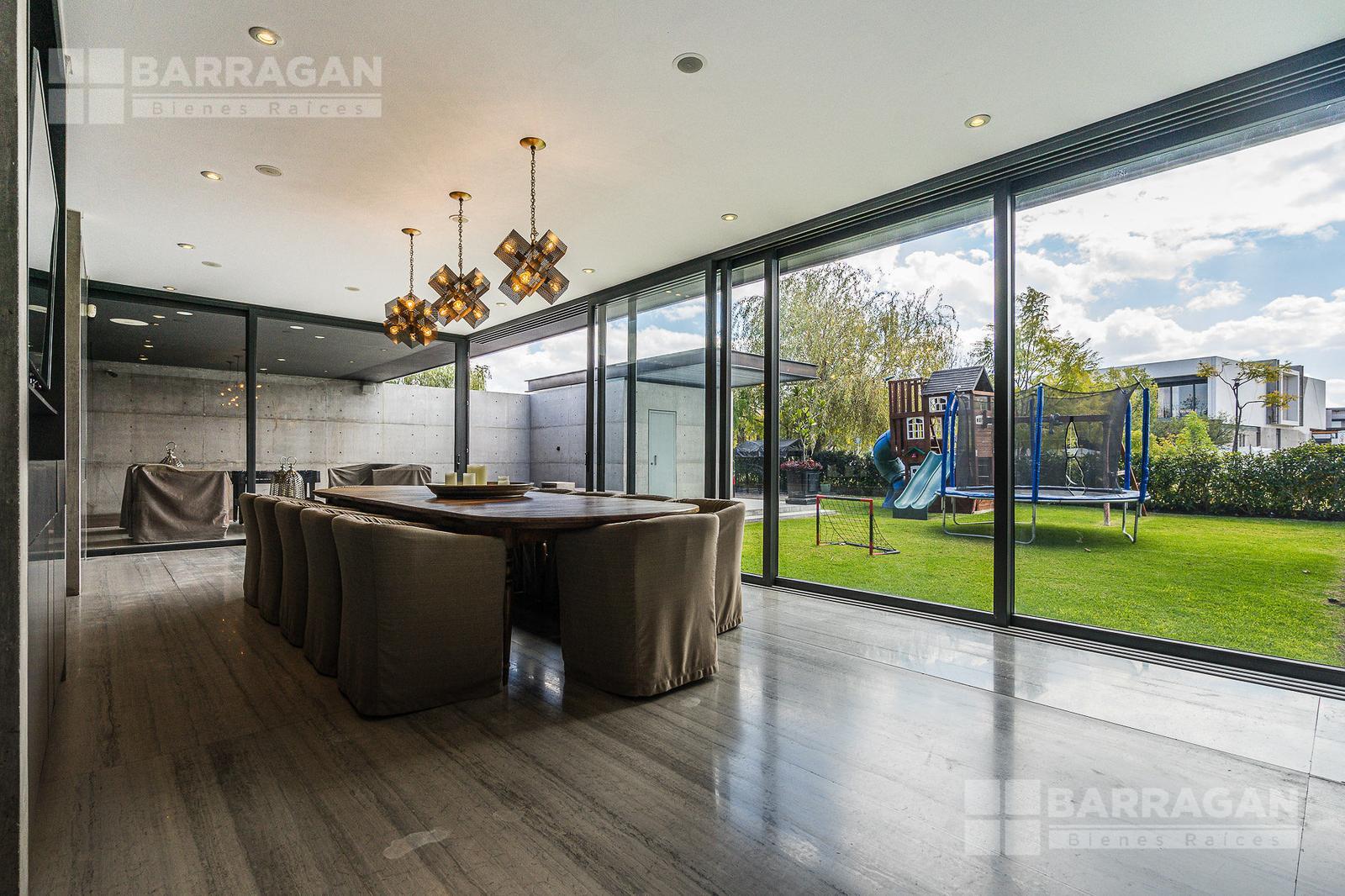 Casa moderna con acabados exteriores de concreto y vigas de acero que contrastan con un jardín frontal de plantas desérticas y piedra caliza lo que hace una combinación única, cuenta con pasillos laterales que llevan a la cochera la cual cuenta con bodega y tres espacios para autos y dos espacios para carritos de golf techados, acceso a la cocina y área de servicio el cual cuenta con cuarto de servicio con baño completo y lavandería. El segundo pasillo lateral lleva a la terraza la cual cuenta con amplio jardín y alberca con cubierta de madera tipo deck mecanizada para ocultar la alberca y así aprovechar al máximo el espacio de la terraza. En el jardín se encuentran dos baños completos independientes para dar servicio a la alberca.