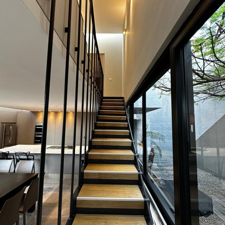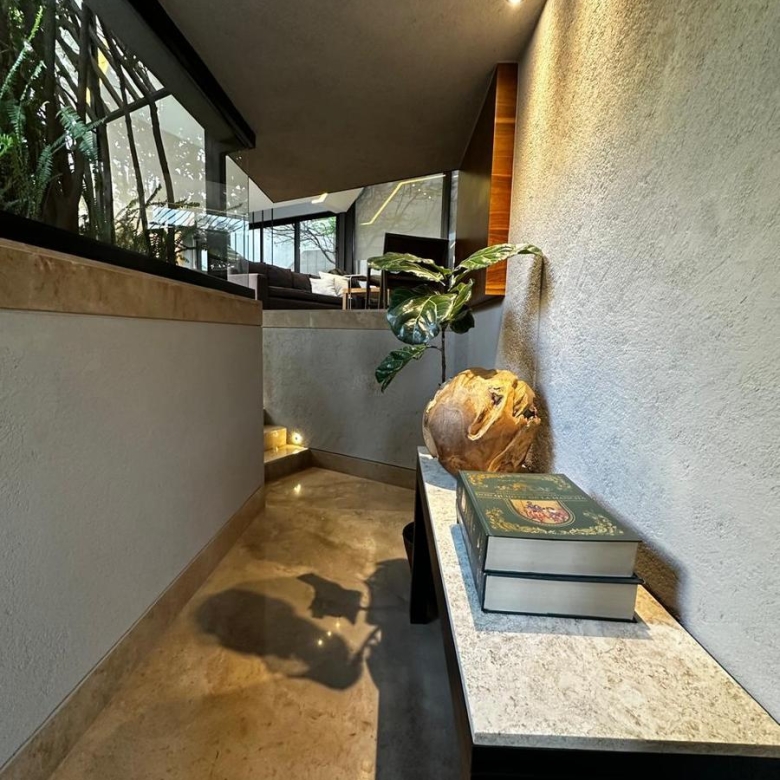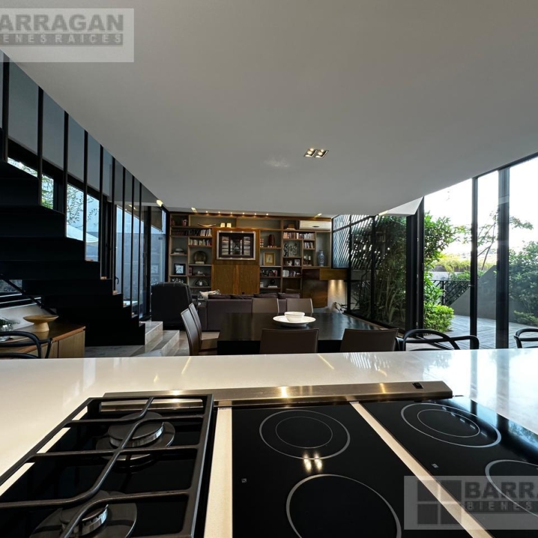 Moderna casa en un entorno tranquilo, excelentes acabados minimalistas, pensada para una persona o pareja, en planta baja está una estancia, sala y comedor que se integran con un librero hecho a medida para la televisión, cocina abierta americana con electrodomésticos de primera, dos terrazas interior y exterior con una bella vegetación, medio baño de visitas y área de servicio.