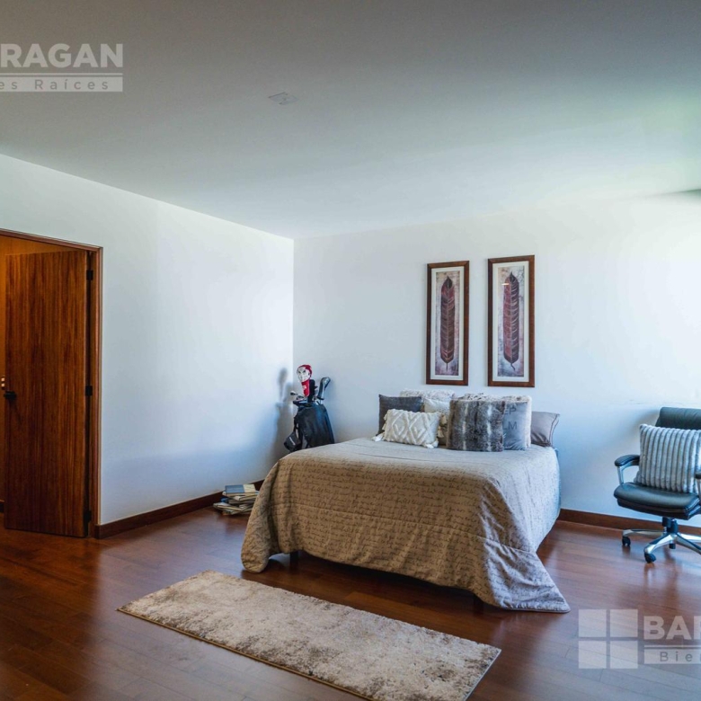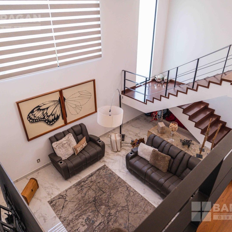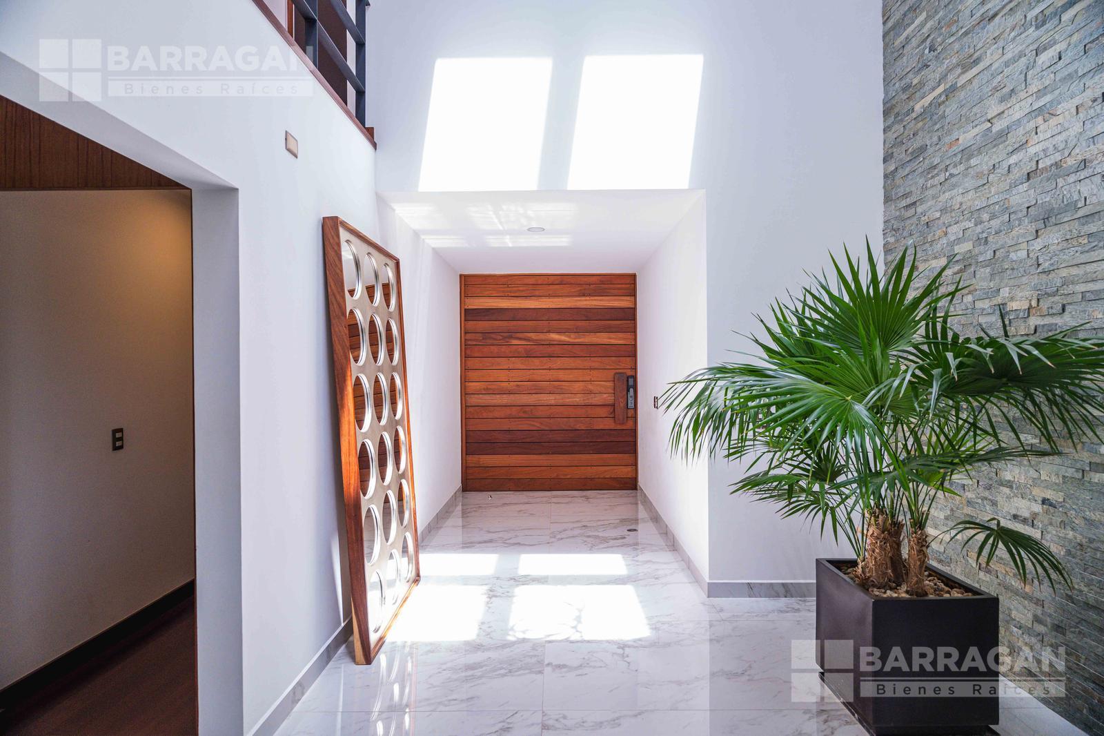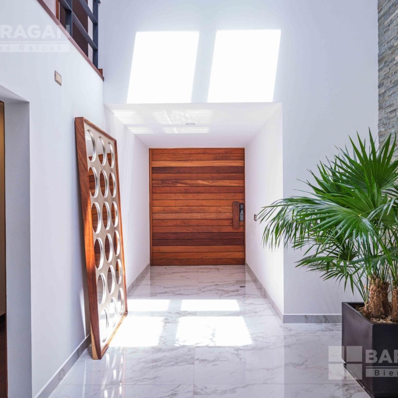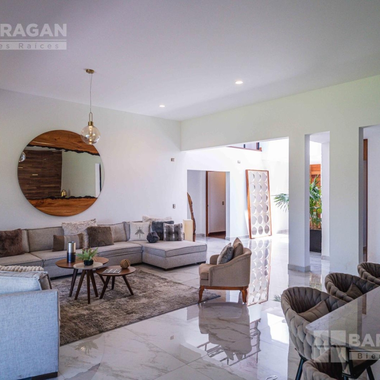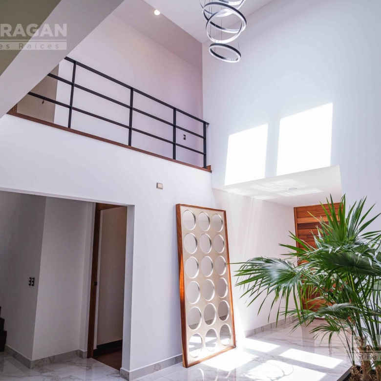 Al ingresar, ofrece un imponente recibidor a doble altura con excelente iluminación natural, medio baño de visitas, así como sala, comedor y cocina equipada. Cuenta además con área de lavandería, cuarto de servicio y cochera con capacidad para tres autos techados y tres adicionales sin techar.