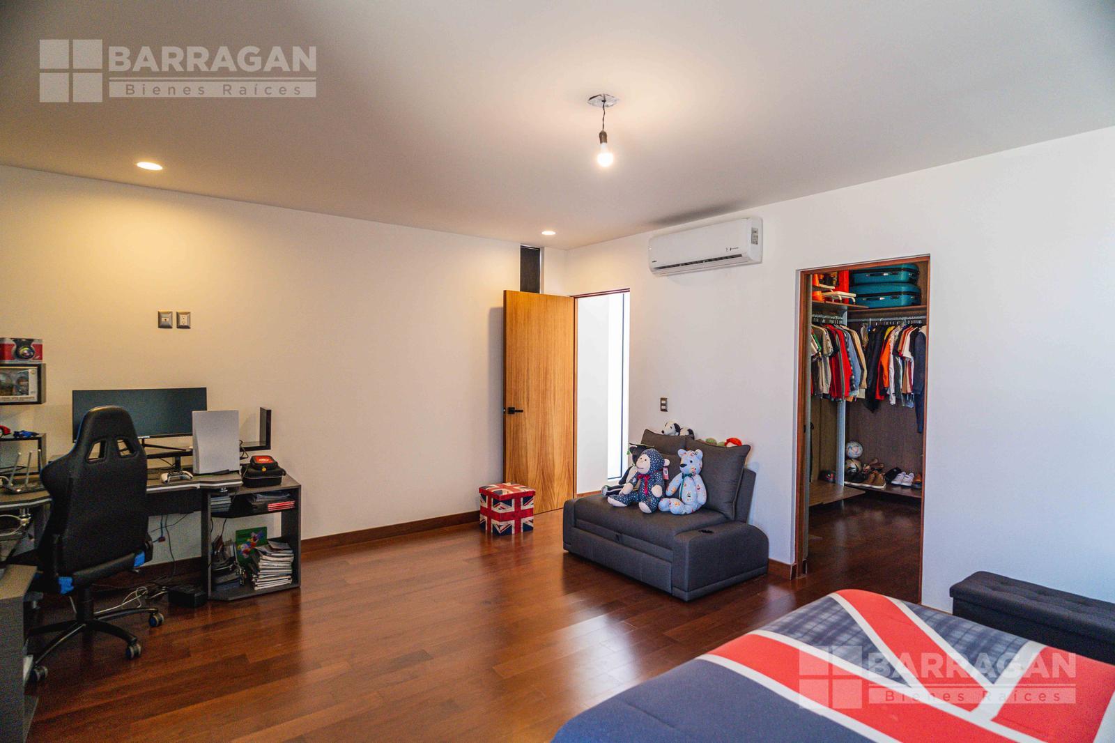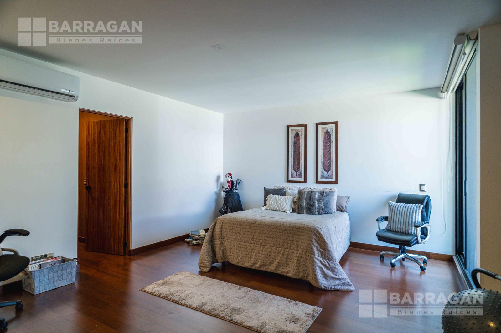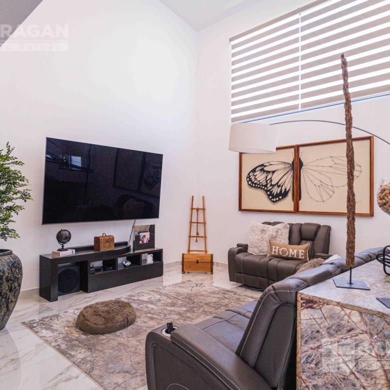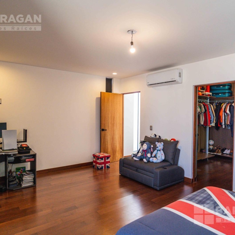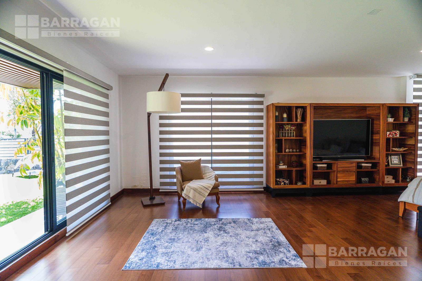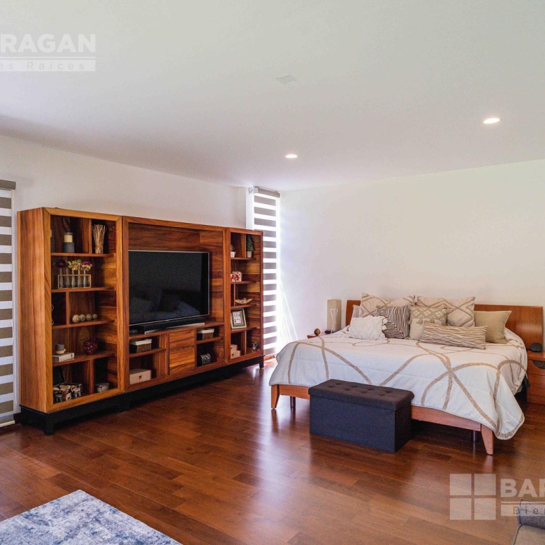 También en planta baja se encuentran dos recámaras, cada una con baño, vestidor y aire acondicionado, así como una acogedora sala de televisión o family room. La propiedad se complementa con una cómoda terraza y un amplio jardín que colinda directamente con área verde, en pasillo lateral cuanta con dos bodegas.