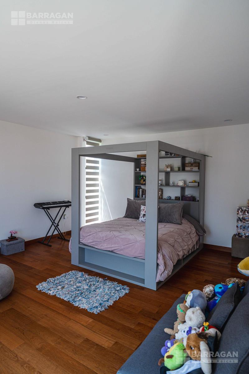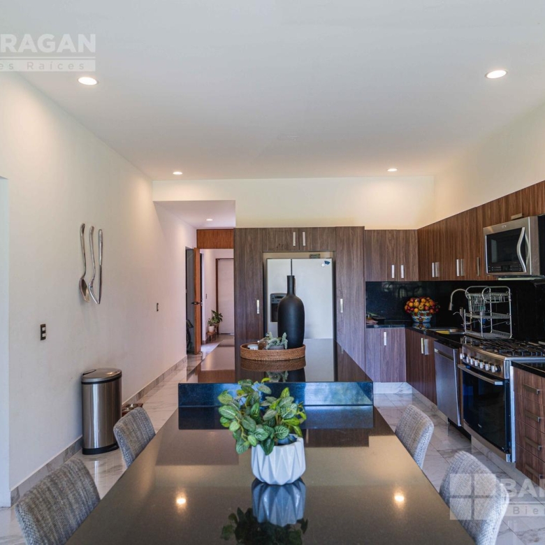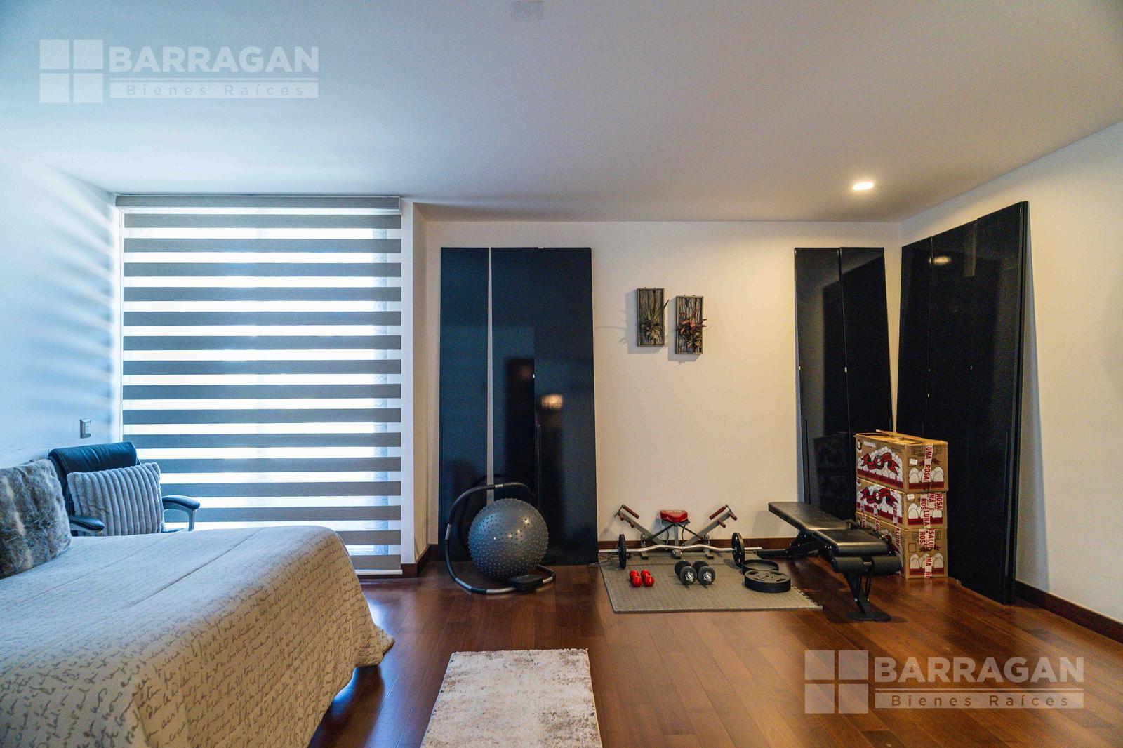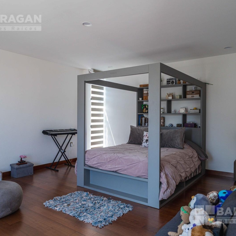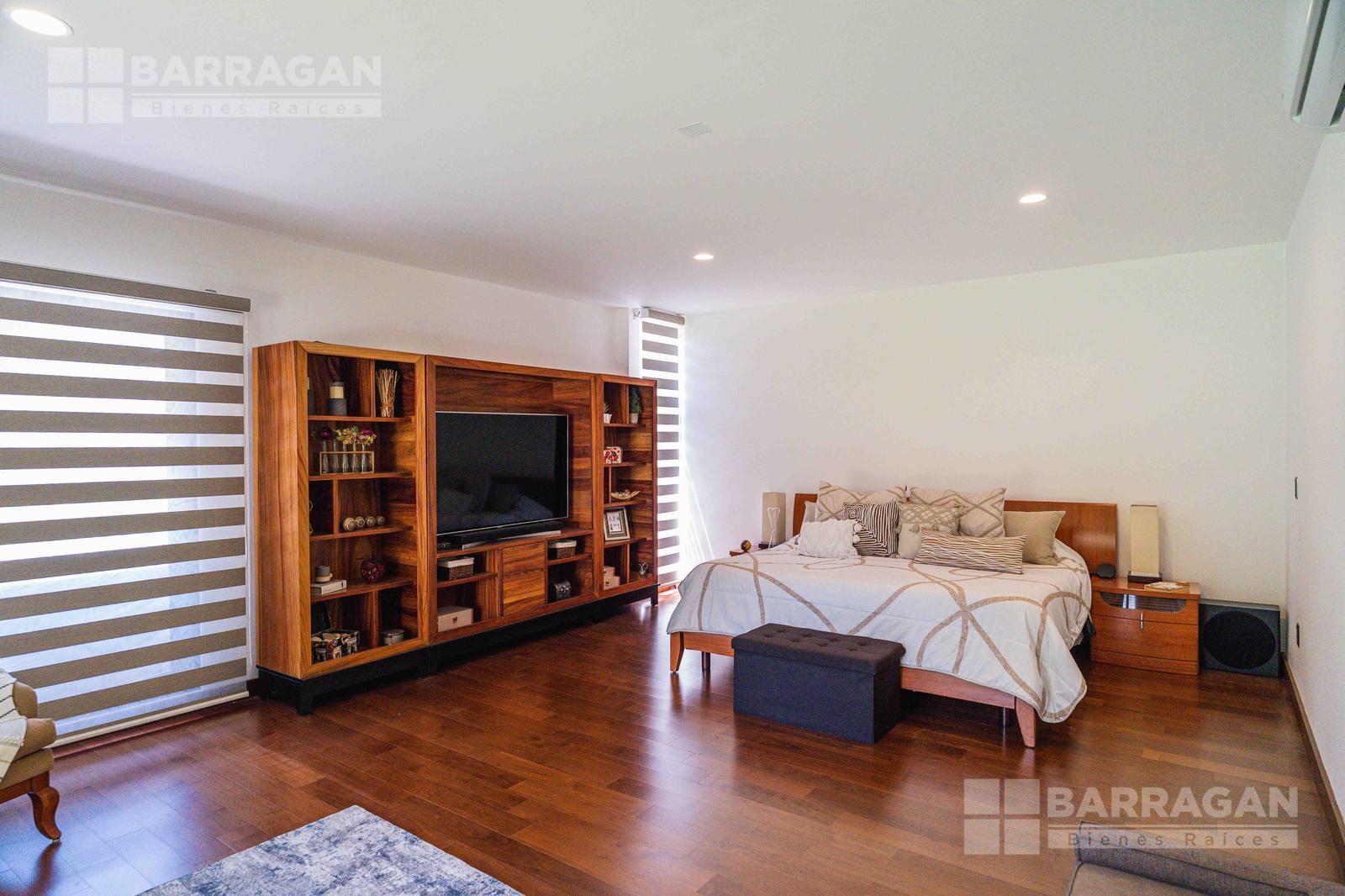 También en planta baja se encuentran dos recámaras, cada una con baño, vestidor y aire acondicionado, así como una acogedora sala de televisión o family room. La propiedad se complementa con una cómoda terraza y un amplio jardín que colinda directamente con área verde, en pasillo lateral cuanta con dos bodegas.