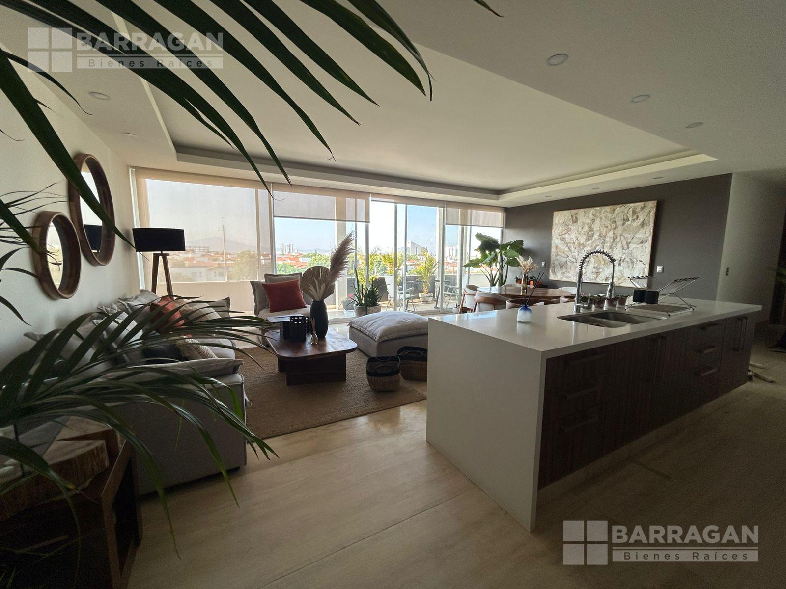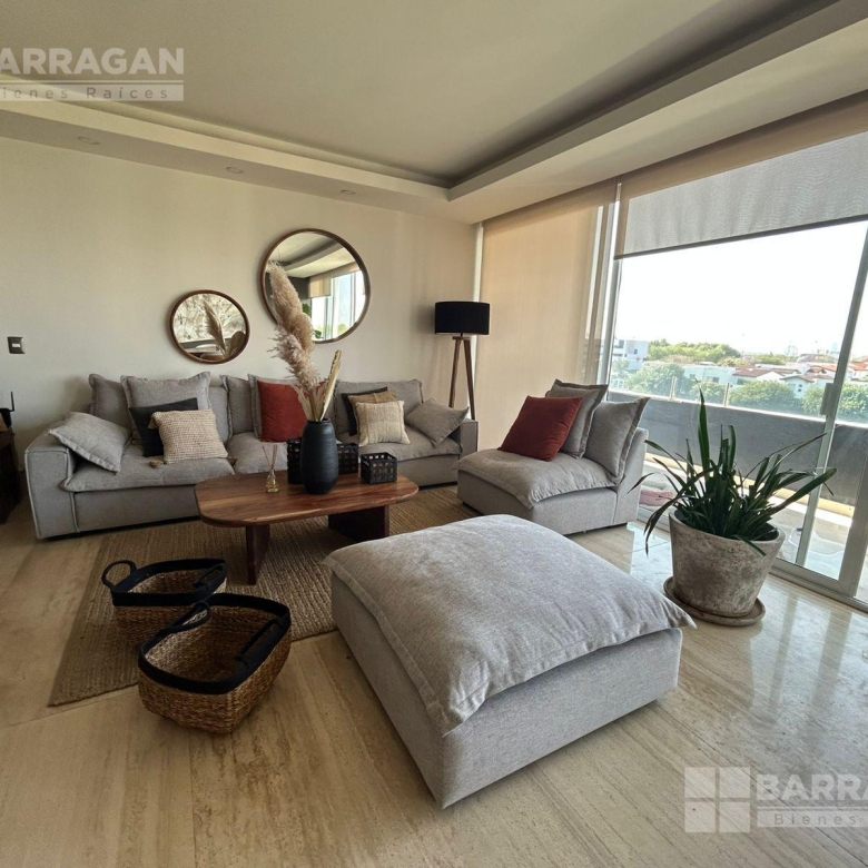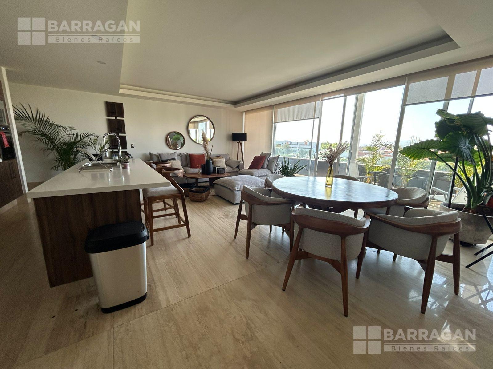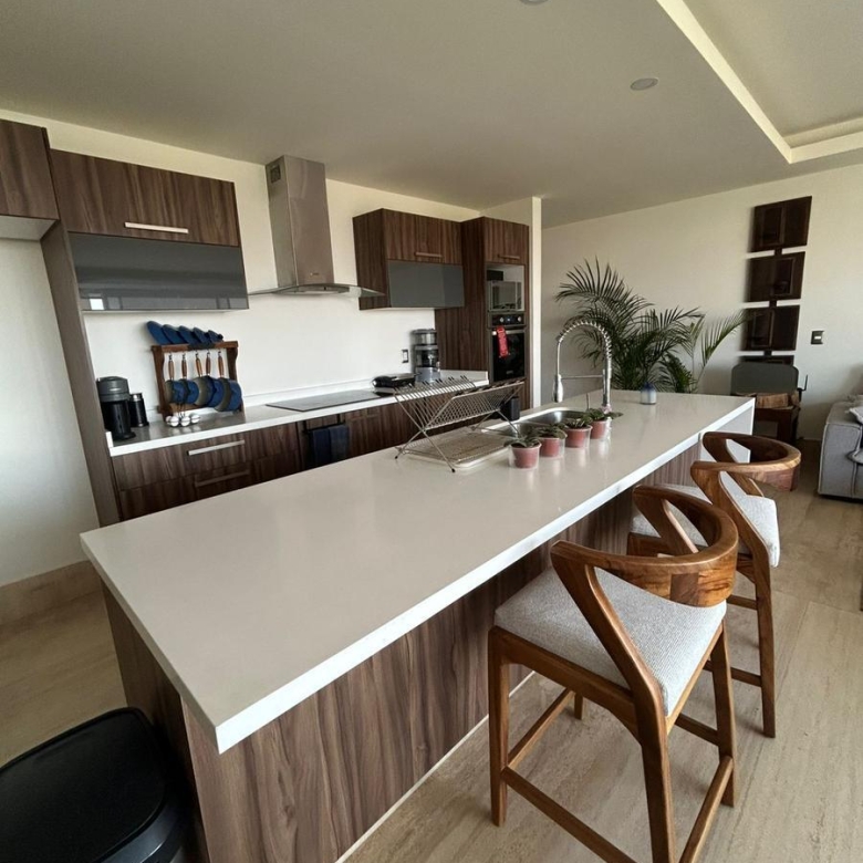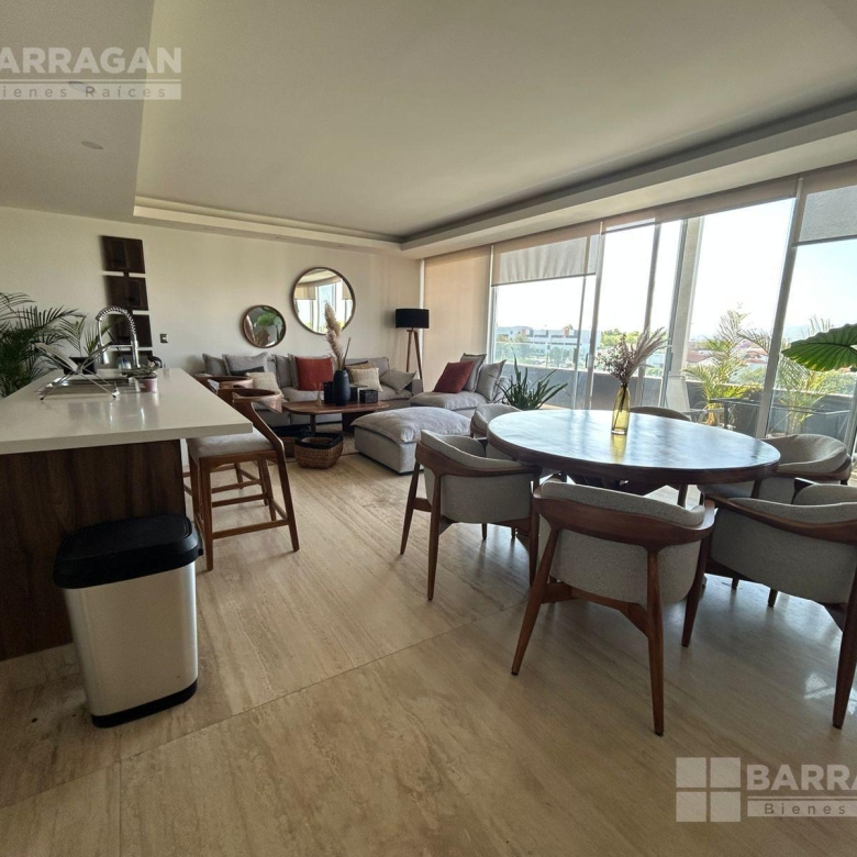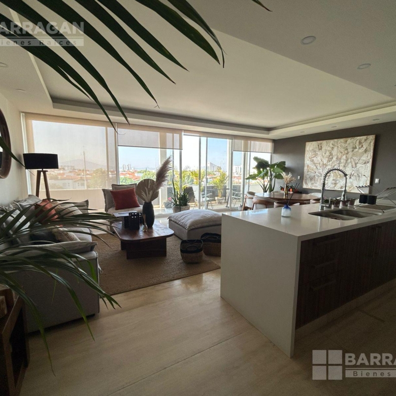 Amplio departamento de tres habitaciones, principal con vestidor y baño, secundarias comparten baño, cocina abierta equipada, excelentes acabados, amplio balcón con linda vista, estancia muy iluminada, área de lavado, cuarto de servicio con baño, 2 lugares de estacionamiento.