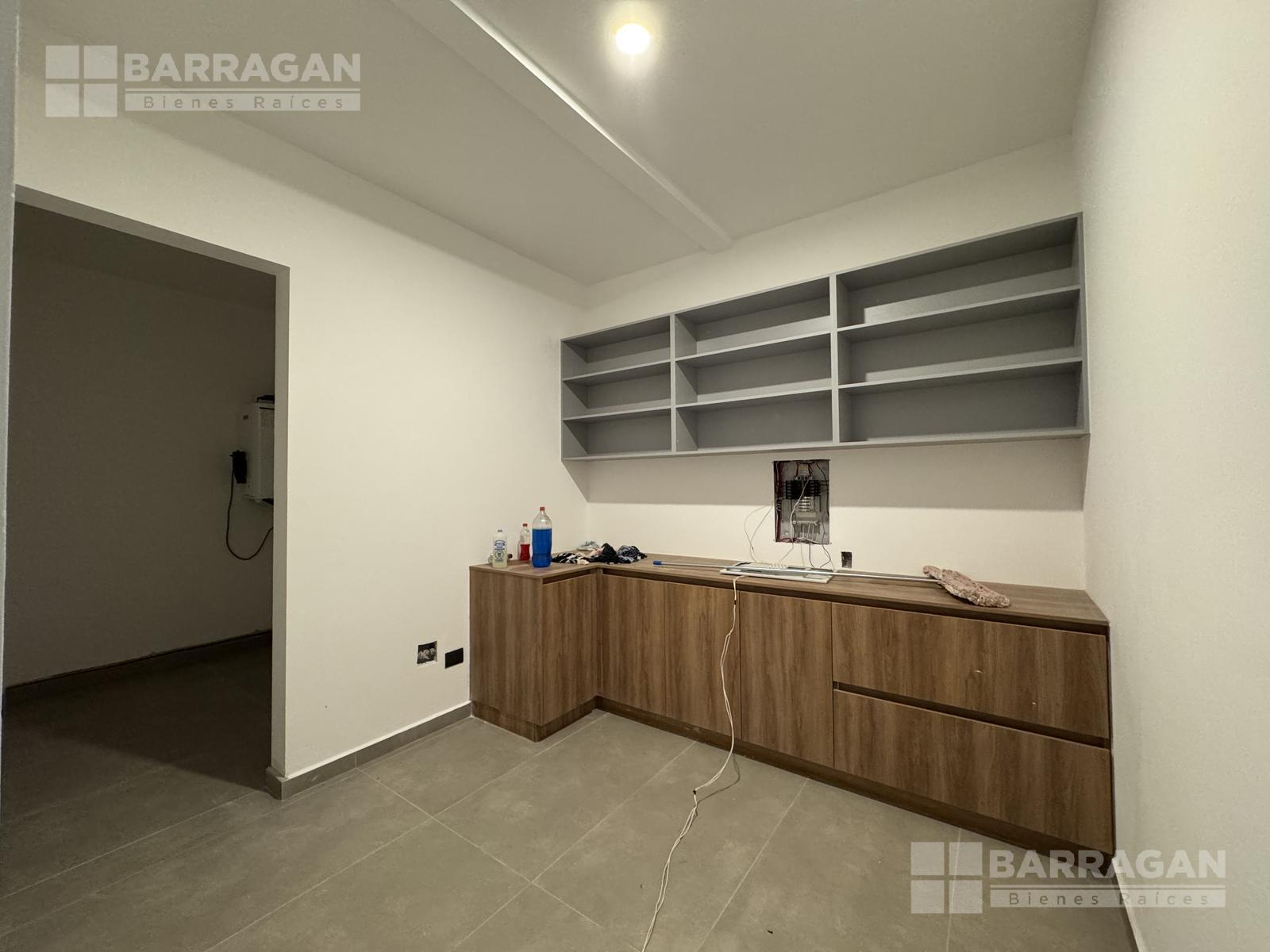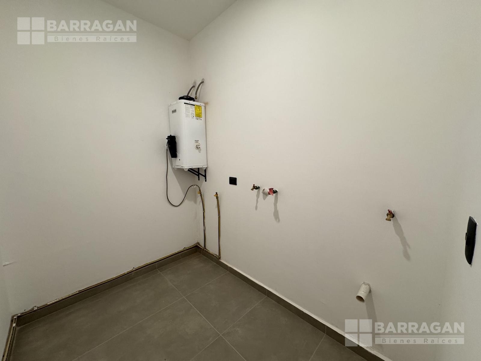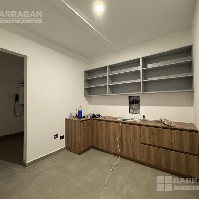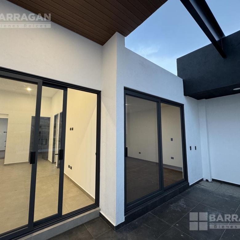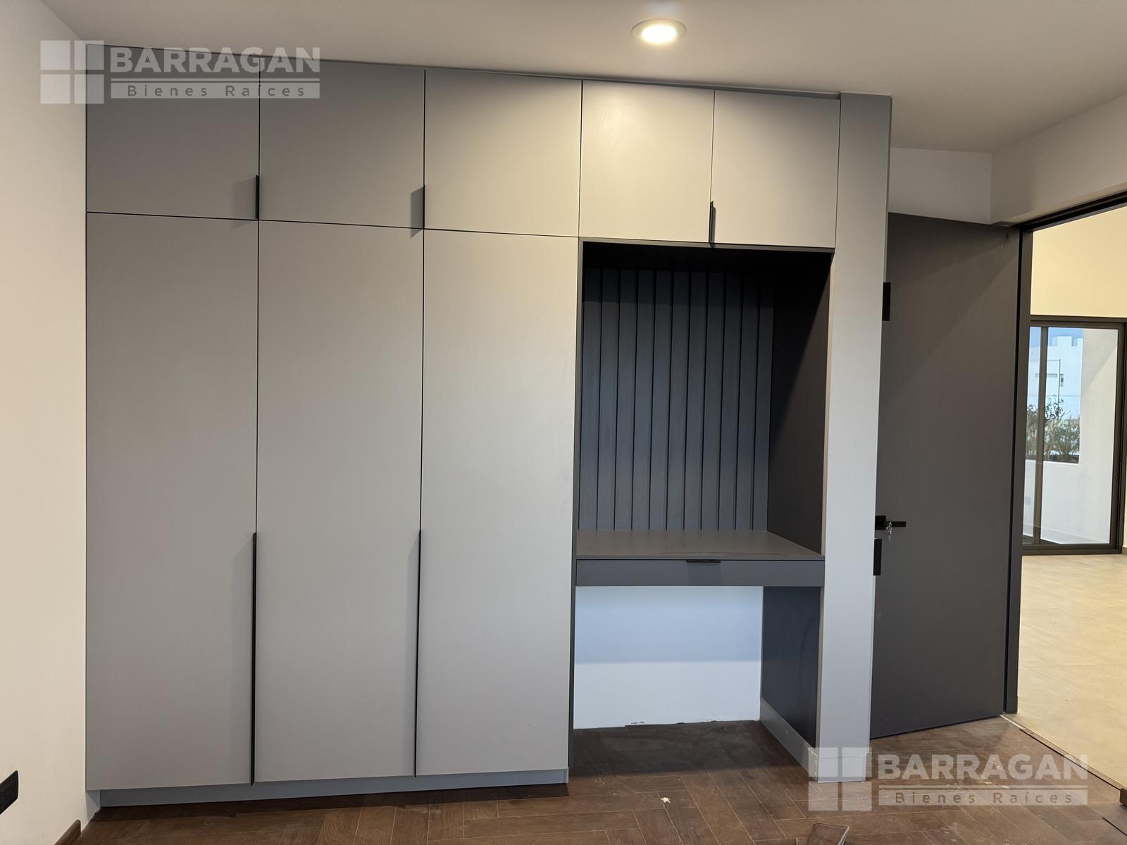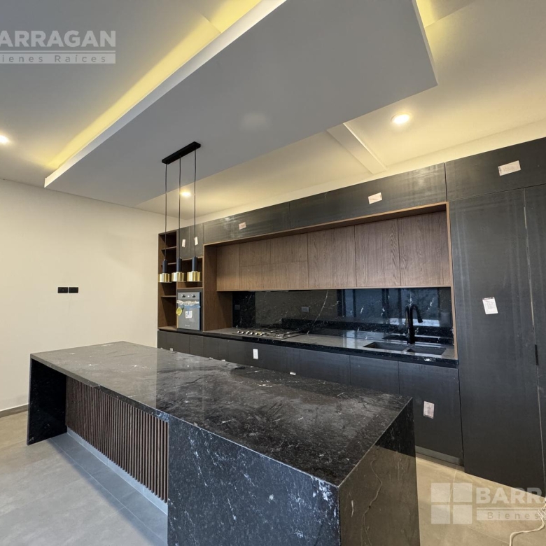 Pisos de porcelanato en áreas sociales y laminado de madera en recámaras. Ventanería de PVC, cubierta de mármol en cocina y plafones con luz indirecta decorativa.