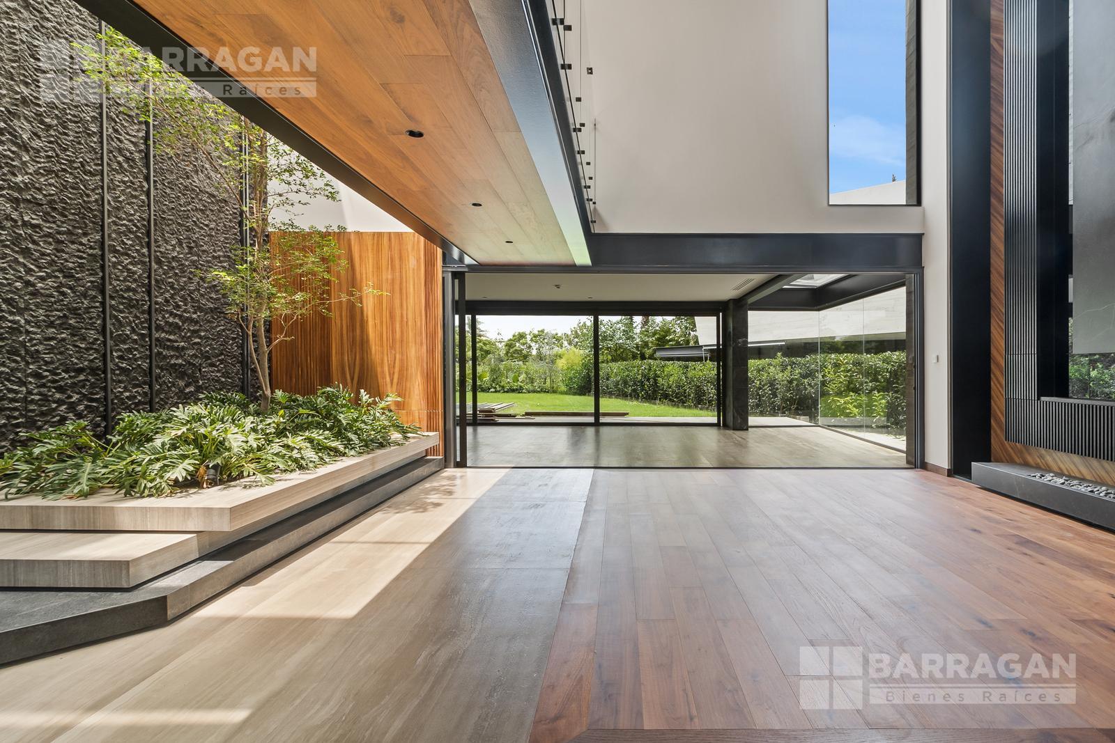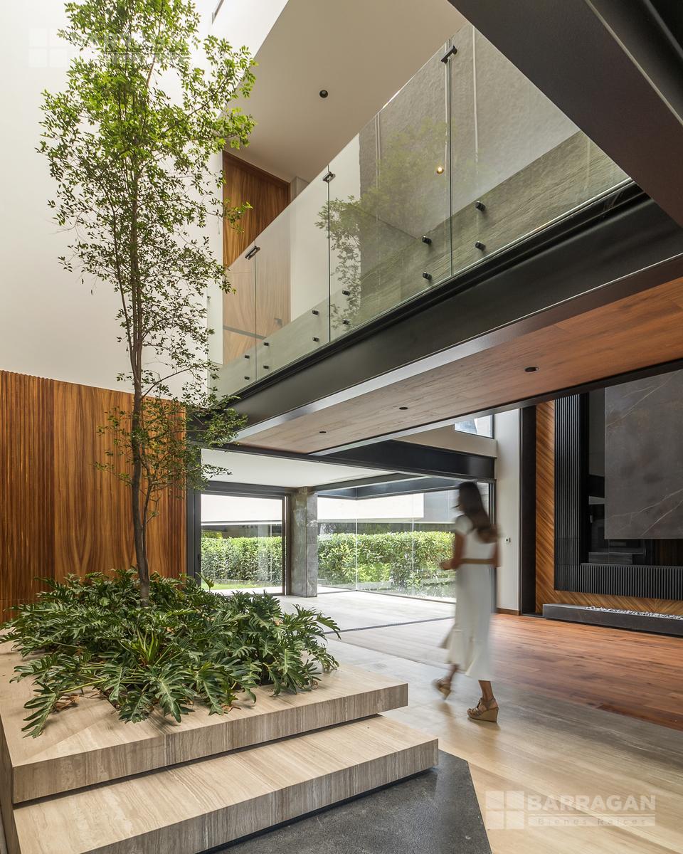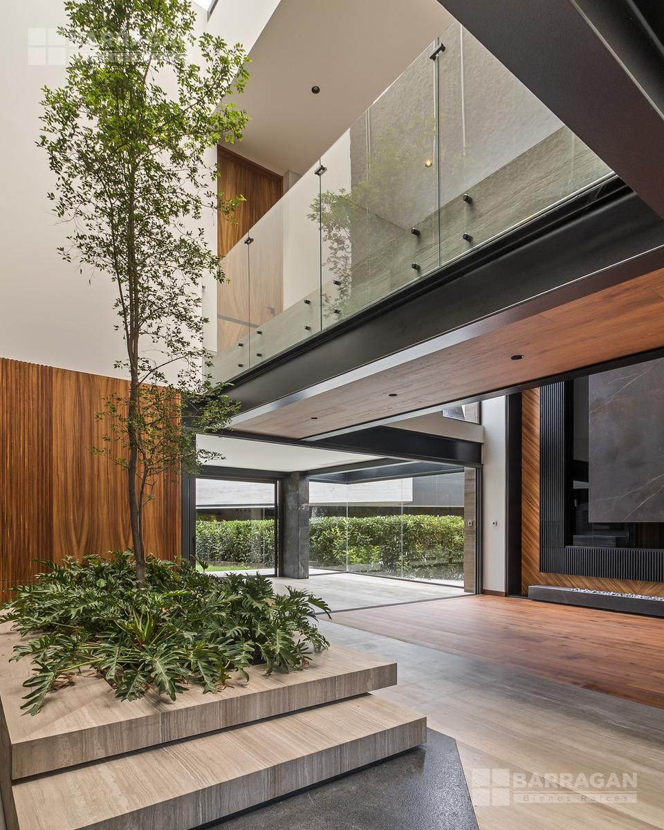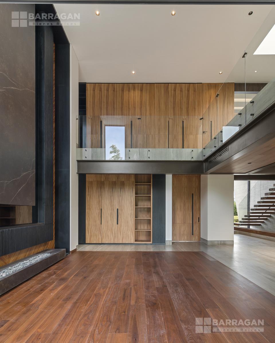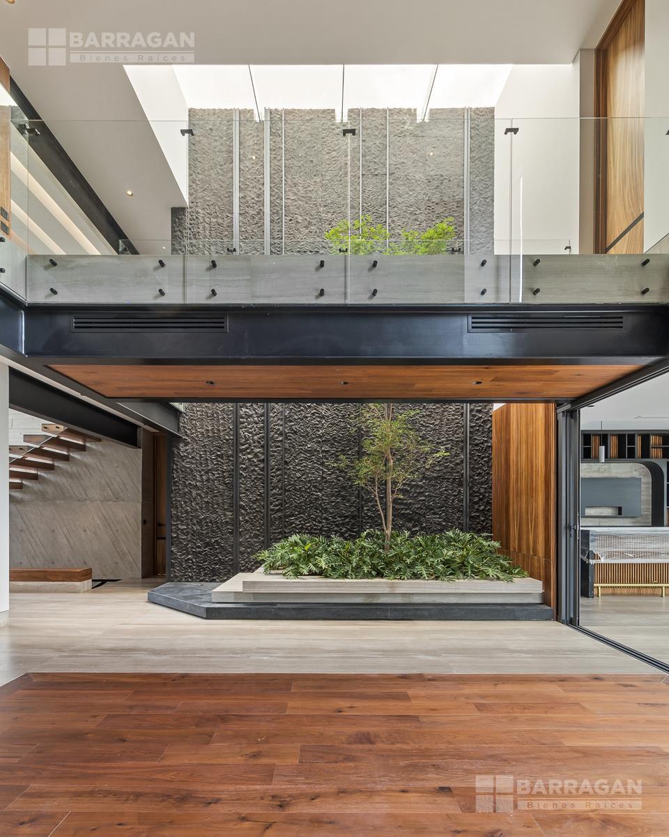 Desde su imponente recibidor a doble altura con jardinera interior, esta casa impresiona en cada rincón. La sala principal, también a doble altura, cuenta con una elegante chimenea, creando un ambiente acogedor y sofisticado. La conexión entre el interior y el exterior es perfecta: una amplia terraza con barra y contra, ideal para recibir invitados, se abre hacia la alberca privada y un jardín de gran tamaño.