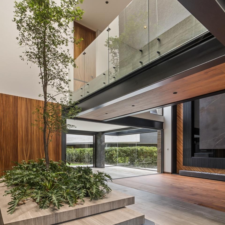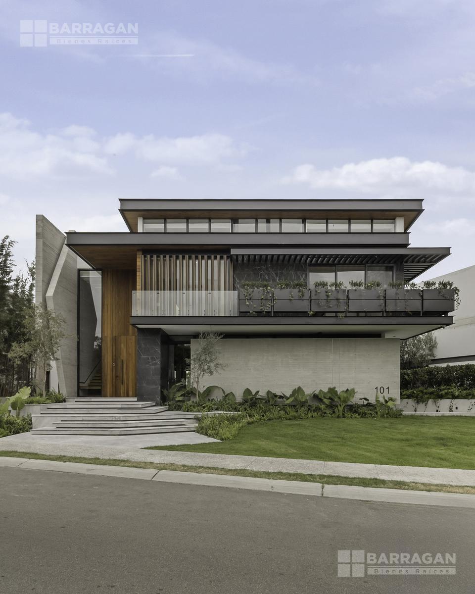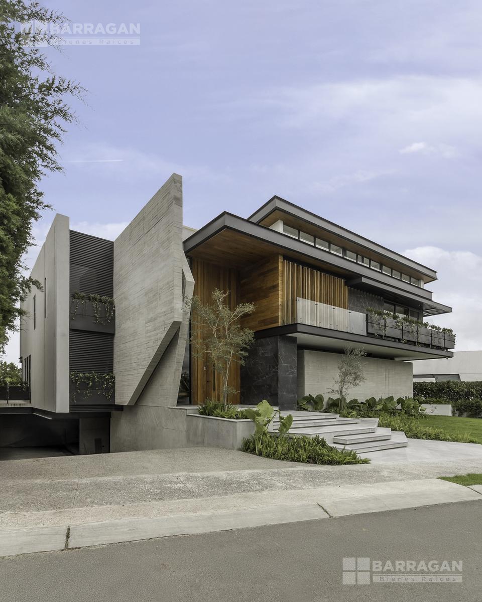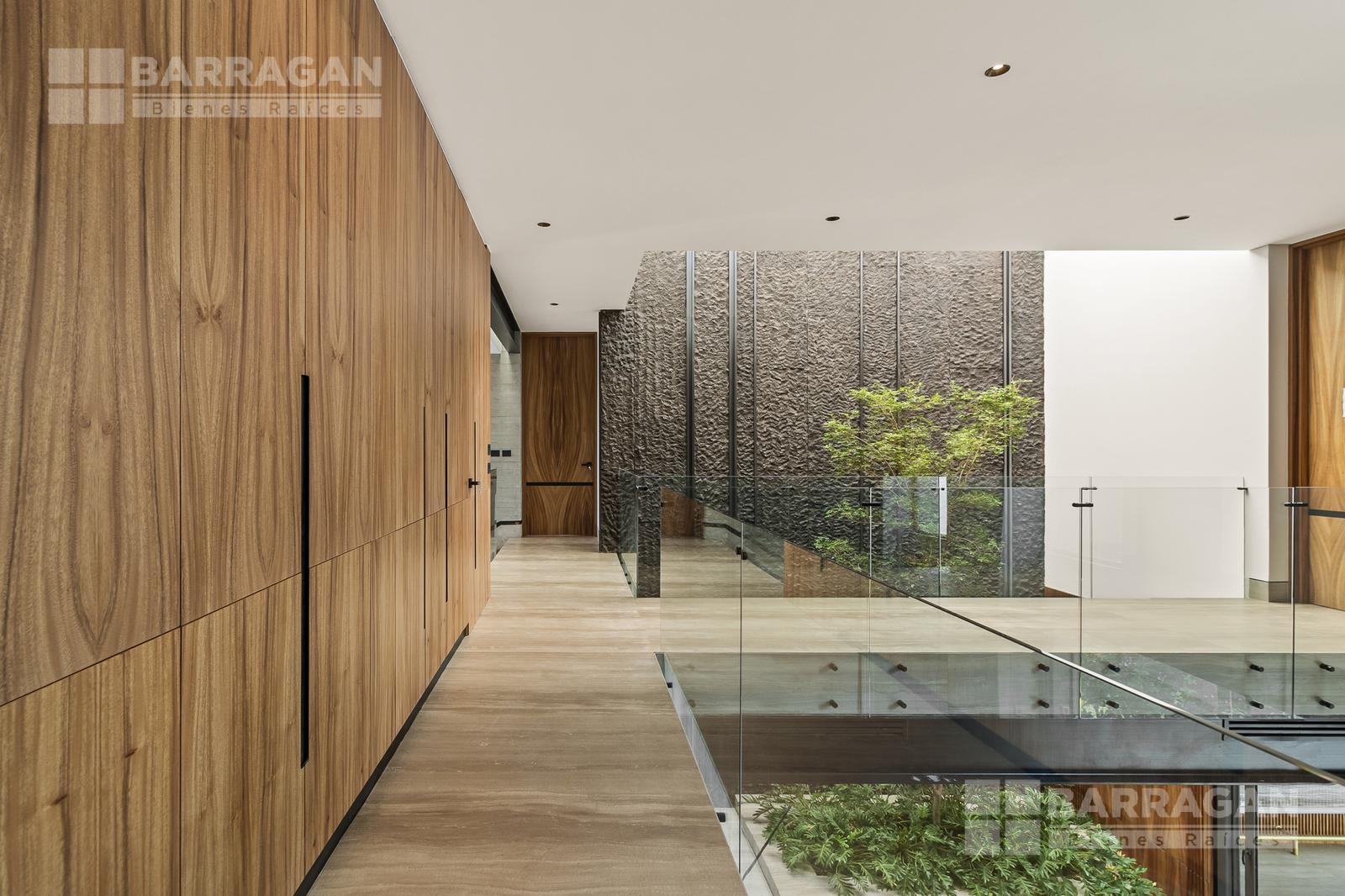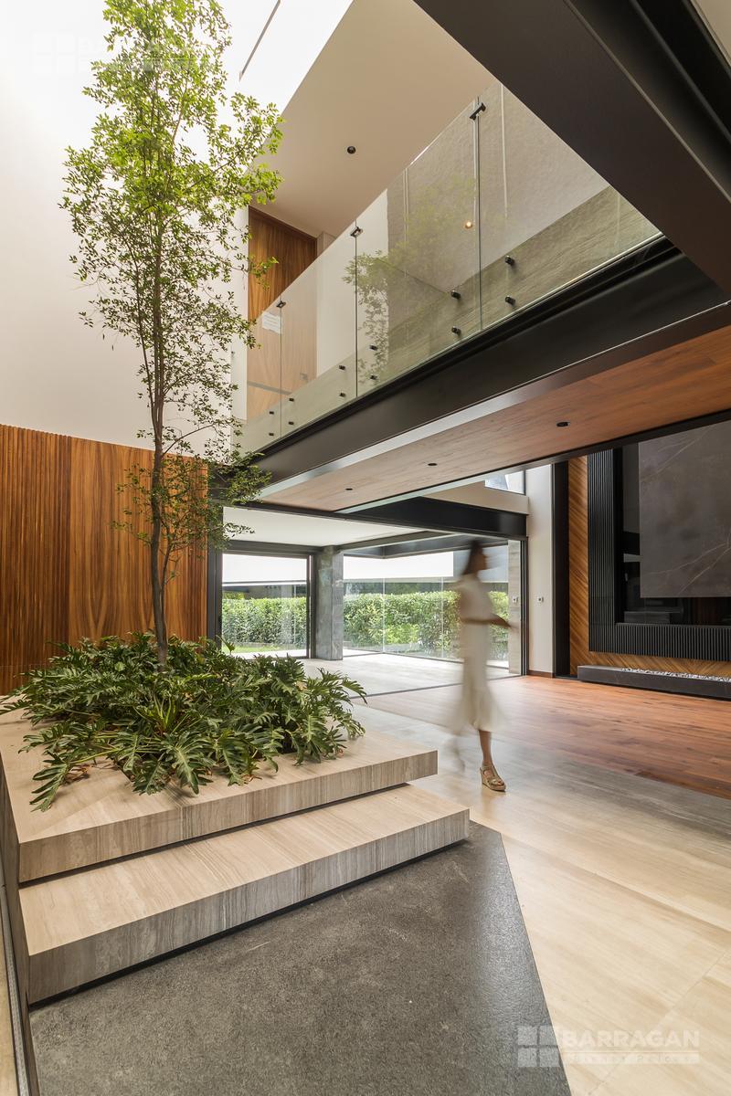 Desde su imponente recibidor a doble altura con jardinera interior, esta casa impresiona en cada rincón. La sala principal, también a doble altura, cuenta con una elegante chimenea, creando un ambiente acogedor y sofisticado. La conexión entre el interior y el exterior es perfecta: una amplia terraza con barra y contra, ideal para recibir invitados, se abre hacia la alberca privada y un jardín de gran tamaño.