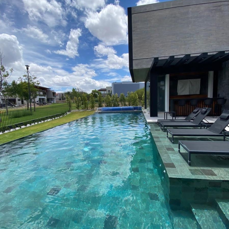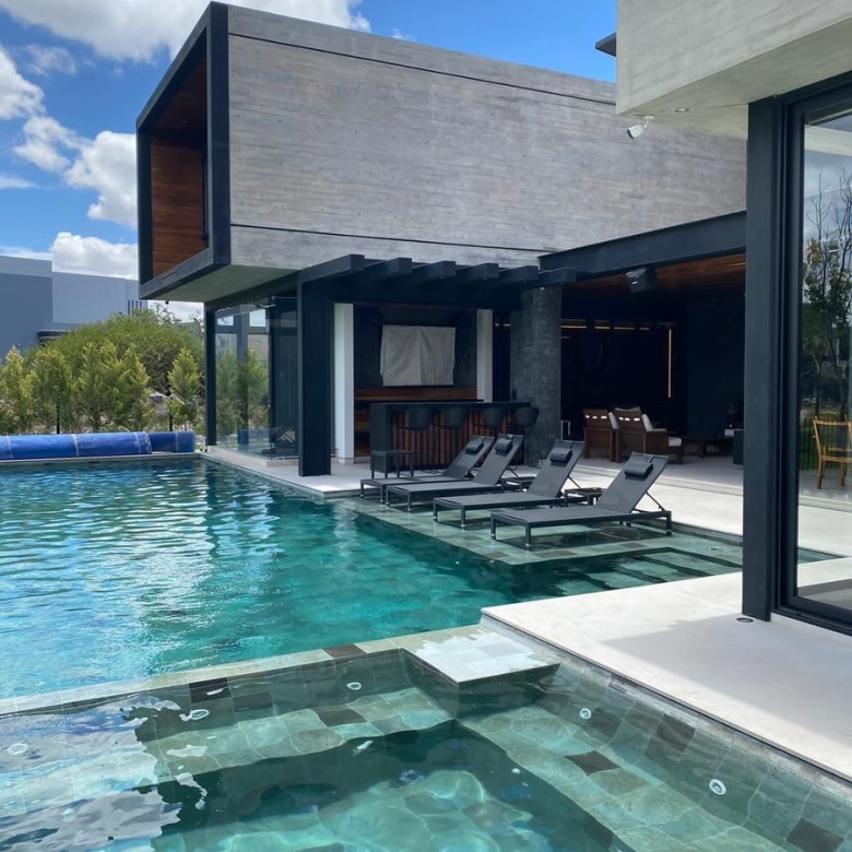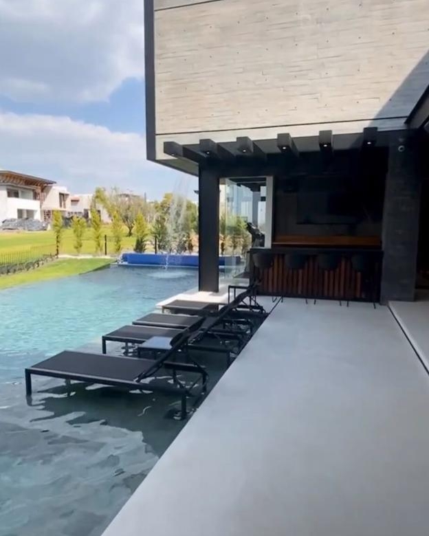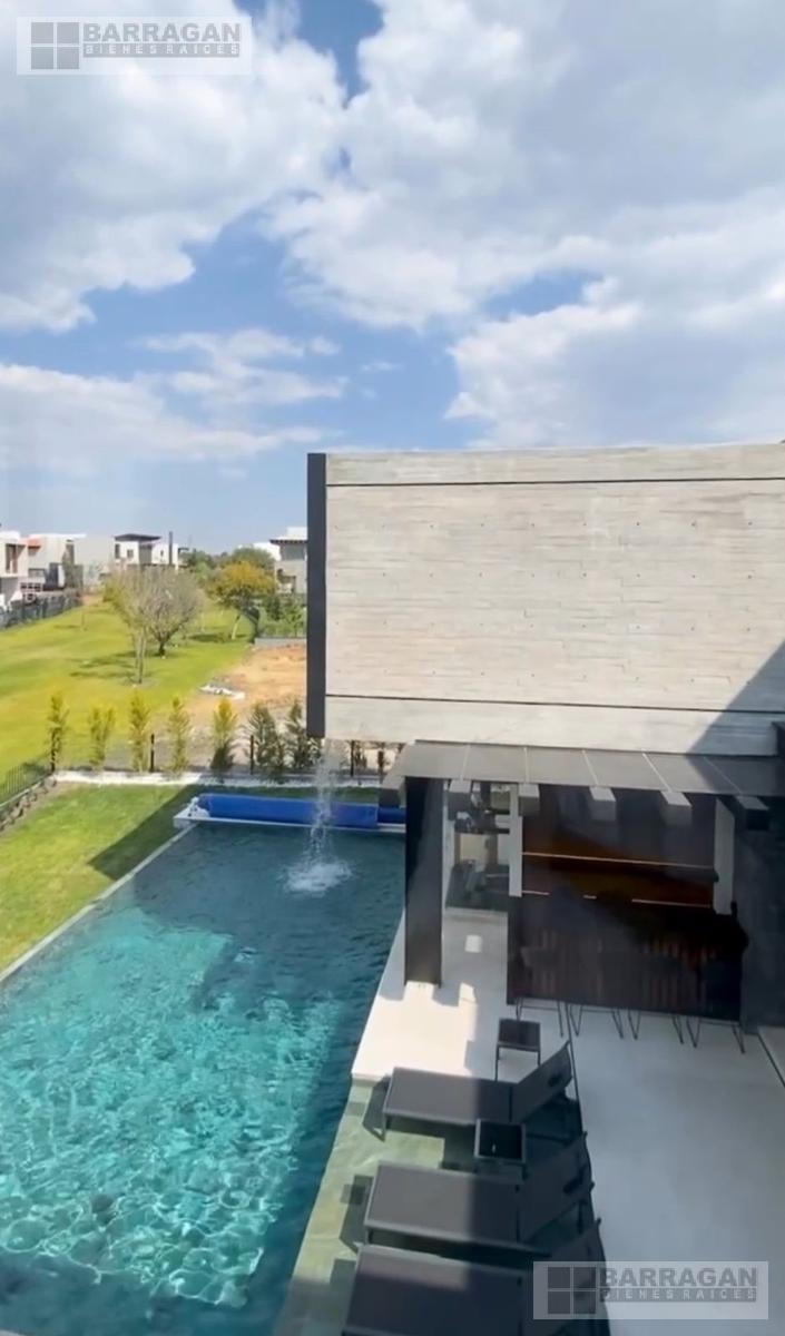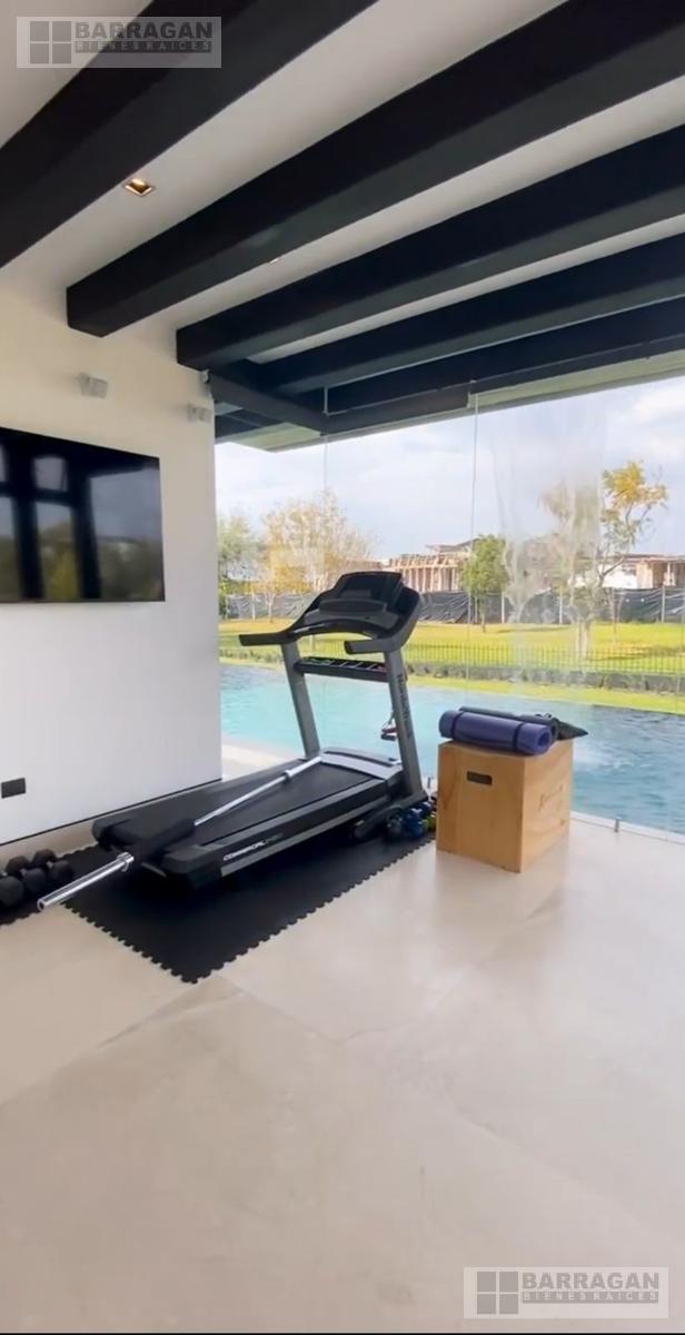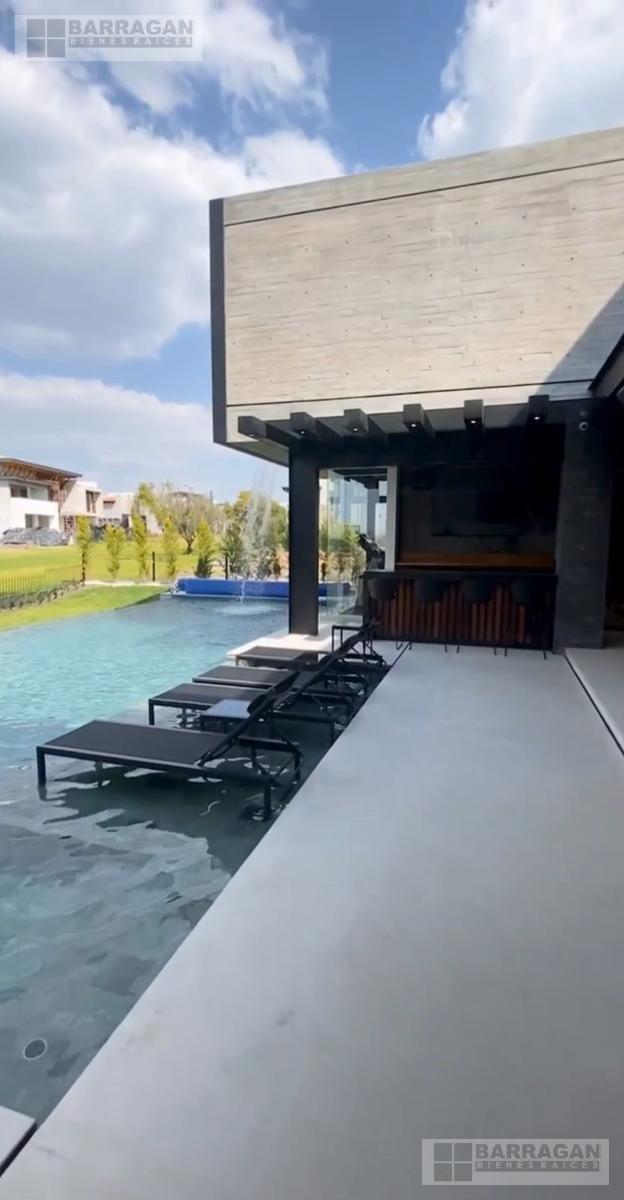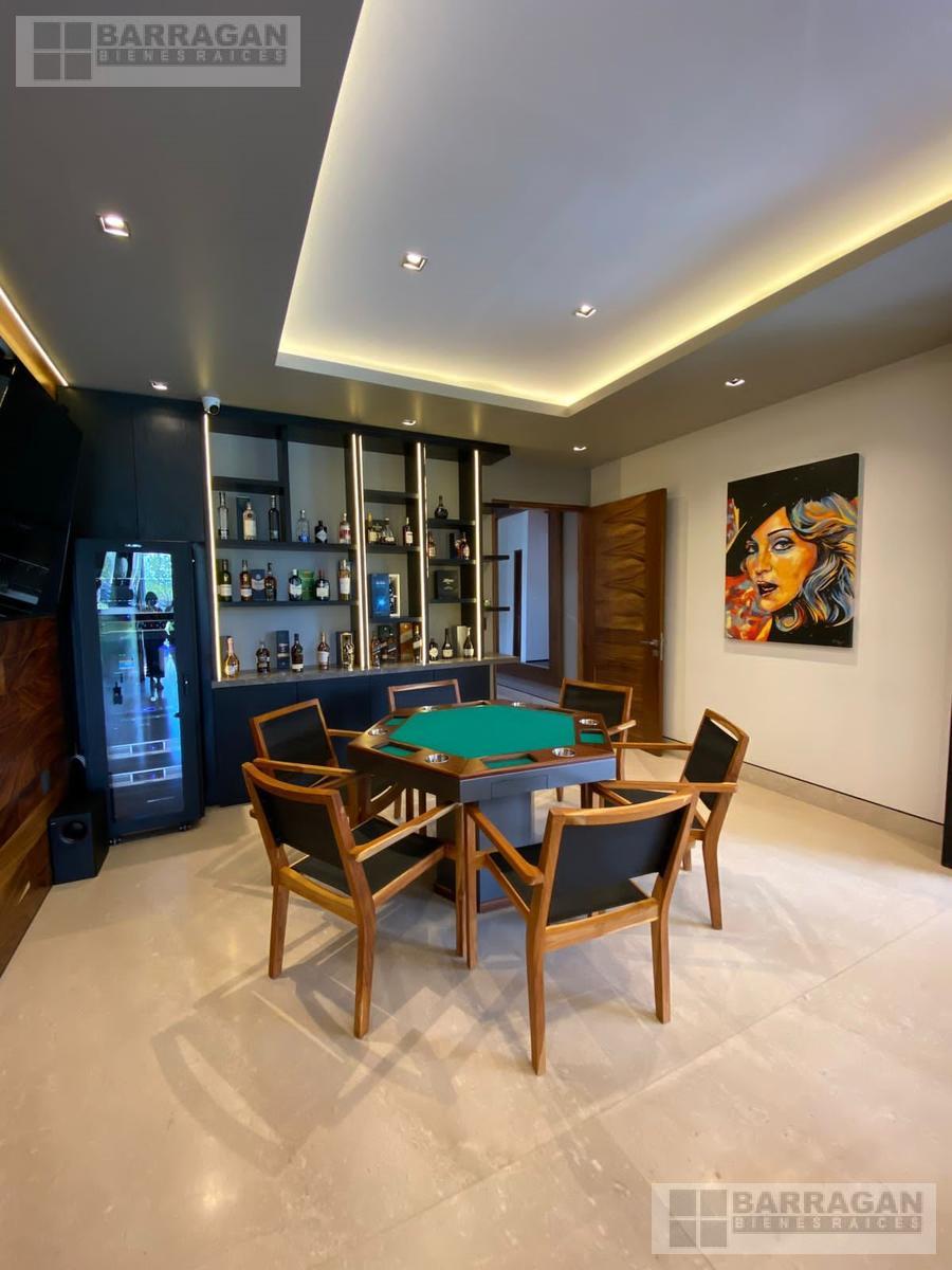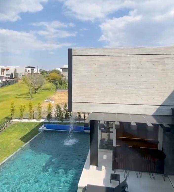 Te recibe una doble altura con cascadas laterales y espejo de agua, sala comedor a doble altura con plafón de madera, cocina equipada profesionalmente, family room, despensa, terraza con asador y bar, alberca con cascada, sala de juegos, gym, estudio, recámara con vestidor y baño, 1/2 baño de visitas, amplio estacionamiento y área de servicio.